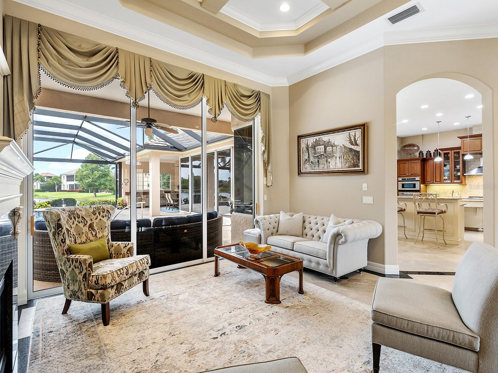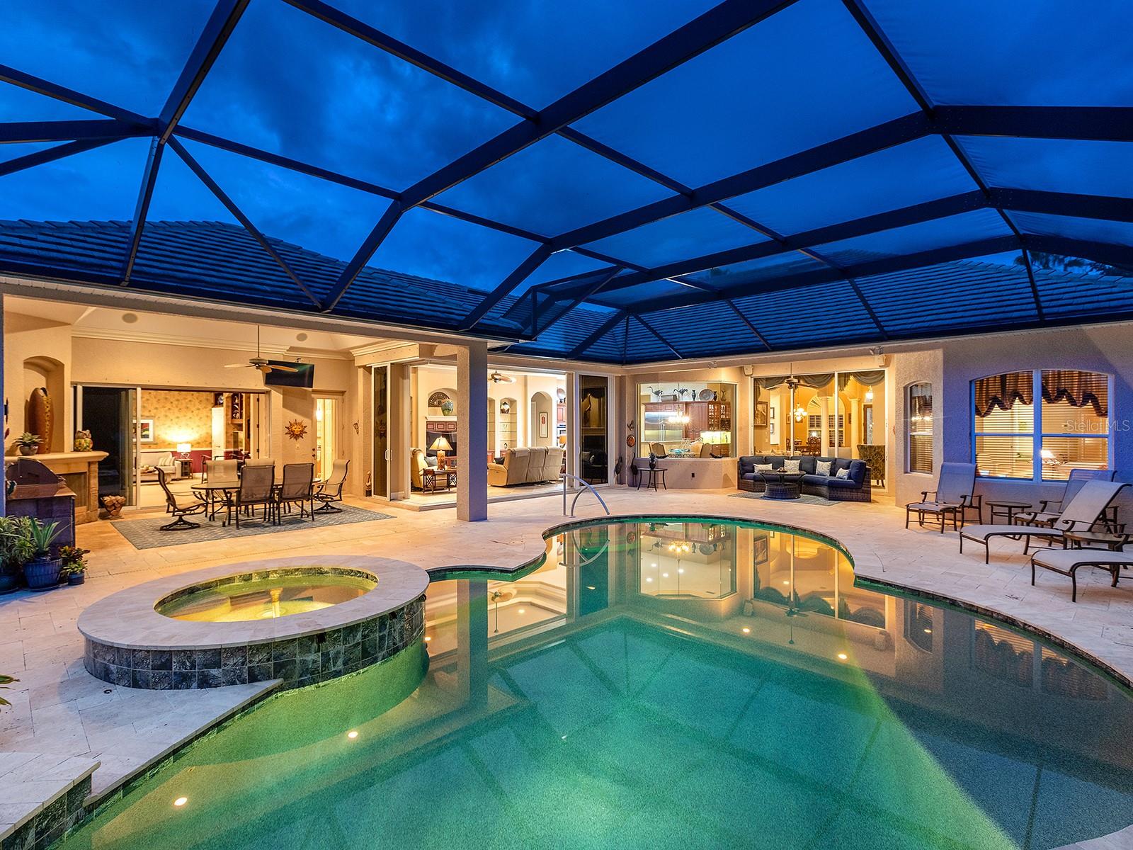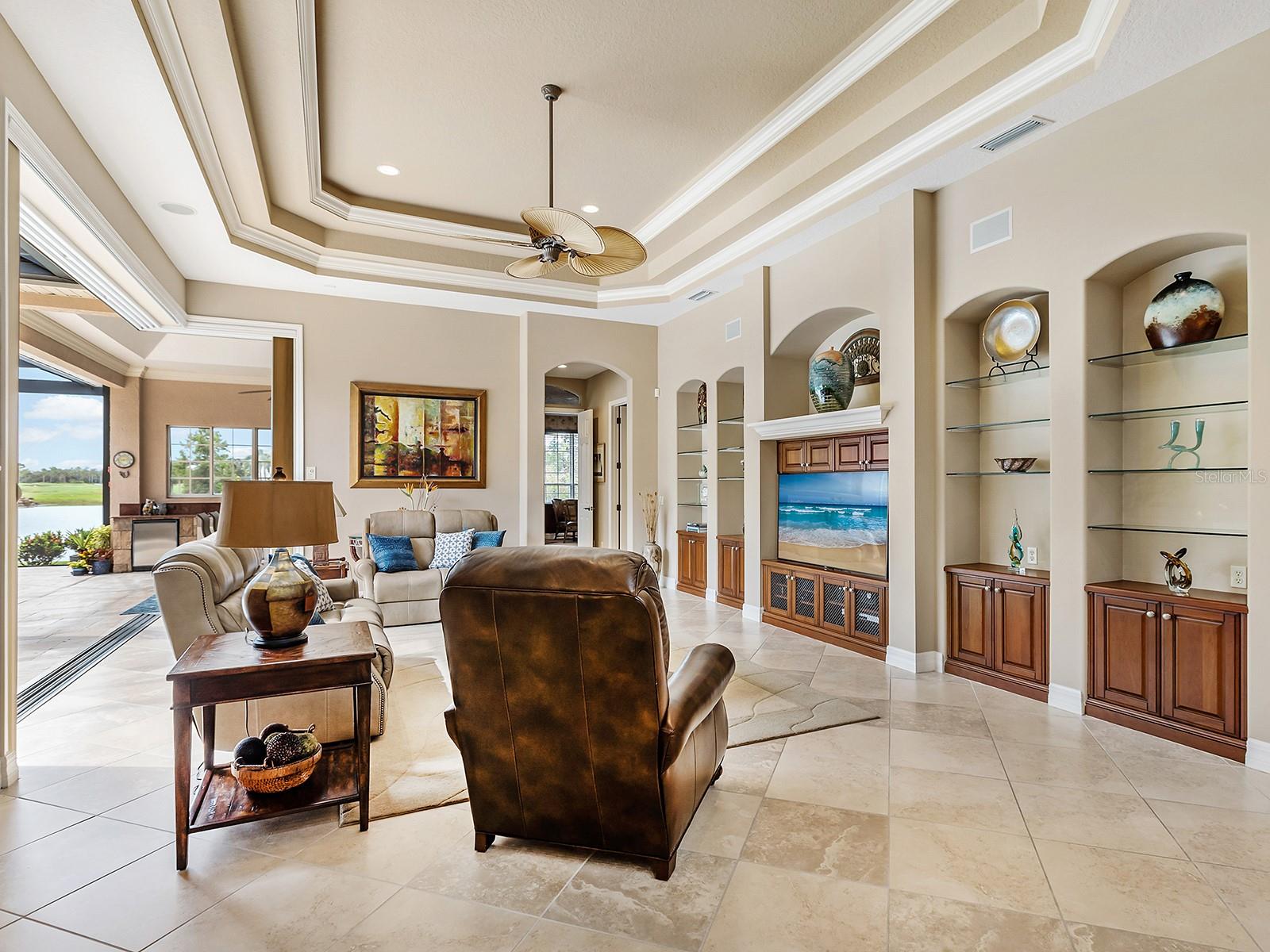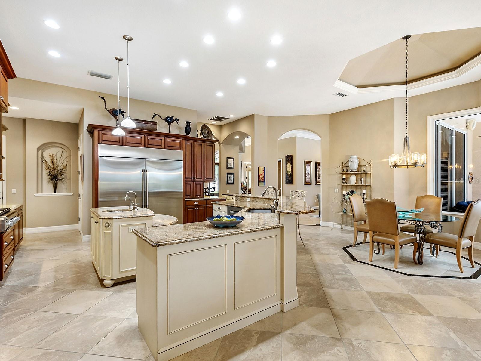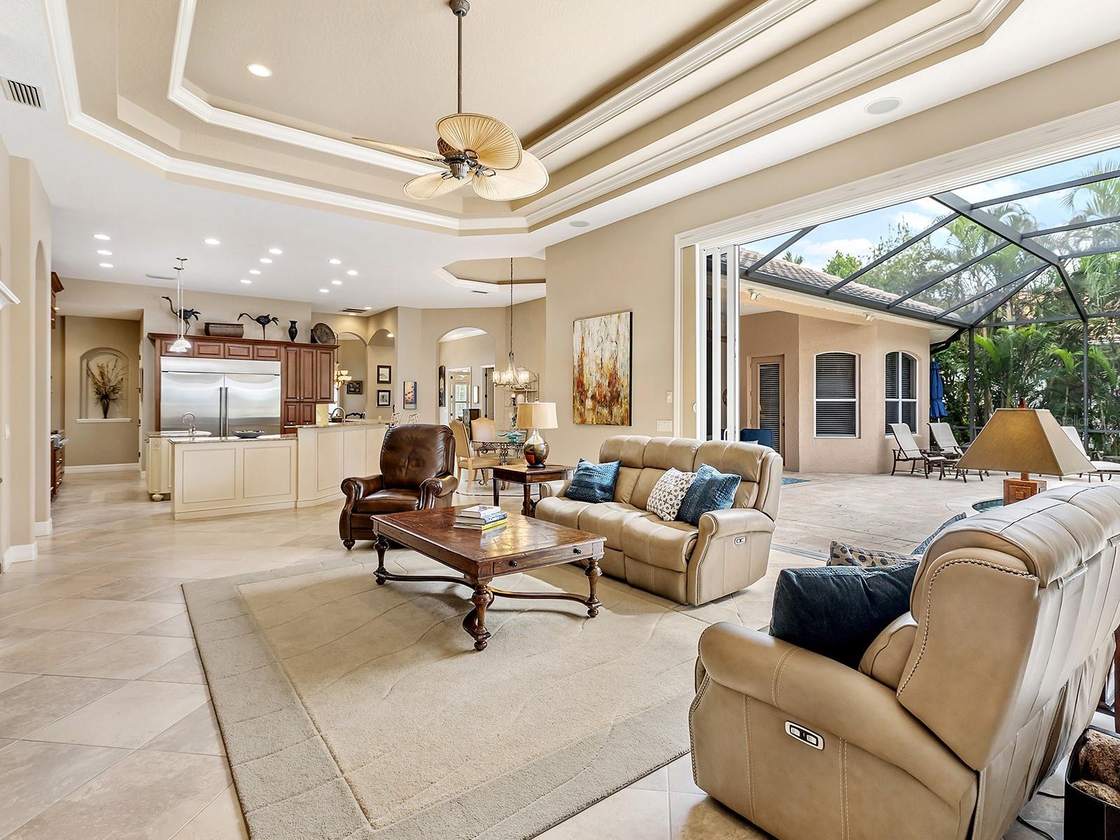 Under contract-accepting backup offers. Set on a private cul-de-sac with sweeping fairway and water views, 12714 Deacons Place offers thoughtfully designed living spaces that blend everyday comfort with refined detail. A circular paver drive and manicured landscaping establish the home’s stately curb appeal, while coach lighting and elegant columns frame the entry. A brand new roof will be installed in October of 2025. Inside, 20-inch porcelain tile with granite inlay sets the tone in a foyer that leads seamlessly into light-filled gathering spaces. The kitchen was created with functionality and design in mind, appointed with granite countertops, Brookhaven® cherry wood cabinetry, a floating prep island with an instant-hot faucet, and top-tier appliances. Appliances include a GE Monogram refrigerator and freezer, Bosch dishwasher, GE wall oven with microwave and warming drawer, a six-burner GE gas cooktop, and a Thermador vent hood that vents to the exterior. A spacious walk-in pantry, art niche, and breakfast nook framed by an aquarium window enhance both function and charm. Just beyond, a butler’s pantry and wet bar connect to the dining room, which is accented by columns, a chandelier medallion, and a tray ceiling with uplighting. The home’s main living areas are designed for effortless living. In the living room, a coffered ceiling and gas fireplace are flanked by custom built-ins, while sliders open to the lanai. The family room features layered tray ceilings, glass shelving, and lanai access zero-corner sliders that dissolve the boundary between indoors and out. A large bonus room with lanai access offers flexibility as a media retreat, additional bedroom, or creative space, complete with surround sound and lake views. The primary suite is a private retreat, entered through double doors into a sitting alcove framed by bay windows with lanai access. The suite offers two walk-in closets, one of which is exceptionally spacious and features custom built-ins with a center island. The en-suite bath is richly appointed with marble floors, a glass-block walk-in shower with multiple shower heads, a Jacuzzi tub, dual vanities with marble tops, and a makeup station. Two sizable guest suites each provide generously sized closets and access to beautifully finished baths, while two half baths and a pool bath serve family and visitors with ease. Outdoor living is a focal point of the residence. The expansive lanai, finished in travertine, offers two covered areas, surround sound, and a vaulted cabana-style ceiling with custom trim. A full outdoor kitchen with granite counters, stainless cabinetry, and a Lynx grill anchors one side, while a fireplace with a cast-stone mantle adds warmth and elegance. The Pebble Tec pool with sun shelf, spa, and cascading water feature is framed by lush landscaping that ensures privacy. Additional features include a three-car garage with storage, central vacuum, surround sound in the living room, family room, bonus room, and lanai. TVs and media equipment also convey. From its architectural details to its inviting indoor-outdoor flow, this residence is equally suited to relaxed living and sophisticated entertaining. With the recent expansion to include a fourth golf course, Lakewood Ranch Golf and Country Club offers unmatched access to premier golfing. Residents can choose from a variety of membership options. Ideally just minutes from The UTC, Waterside, and LWR Main Street. The home is also within easy reach of dining, shopping, and renowned beaches.
