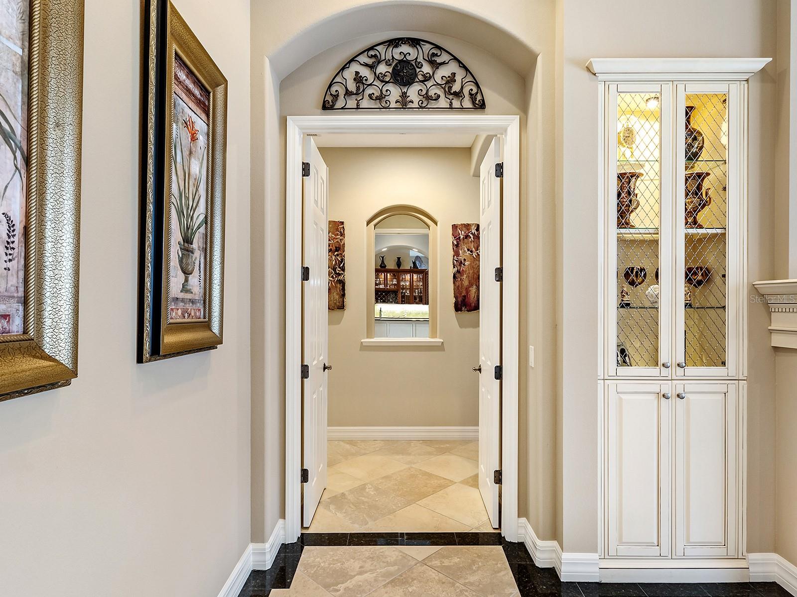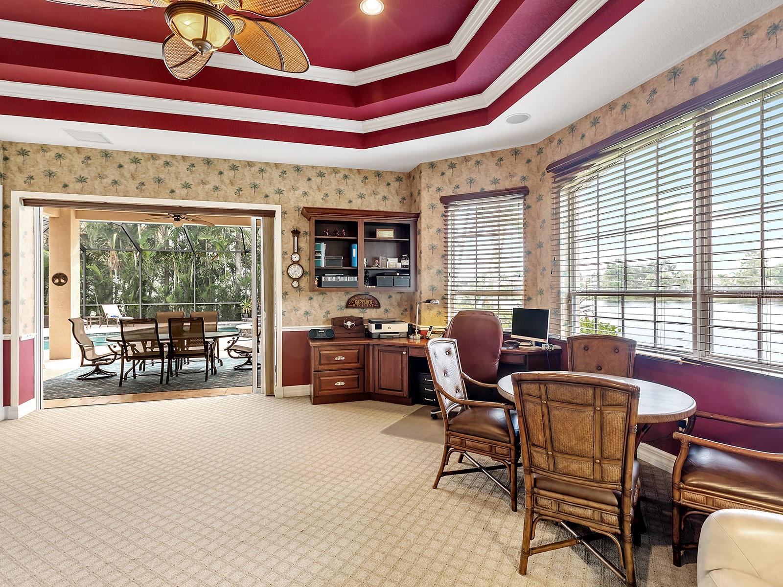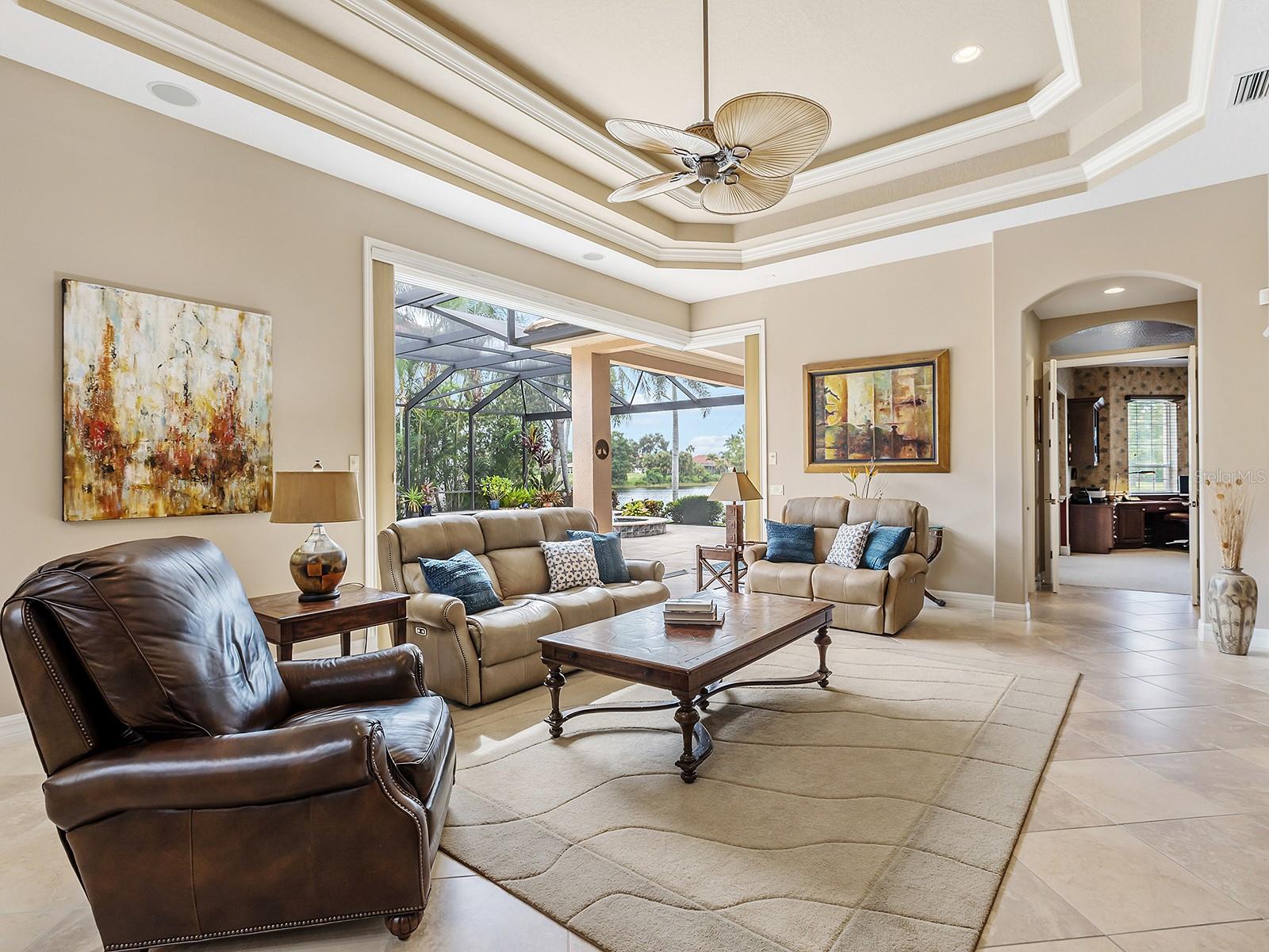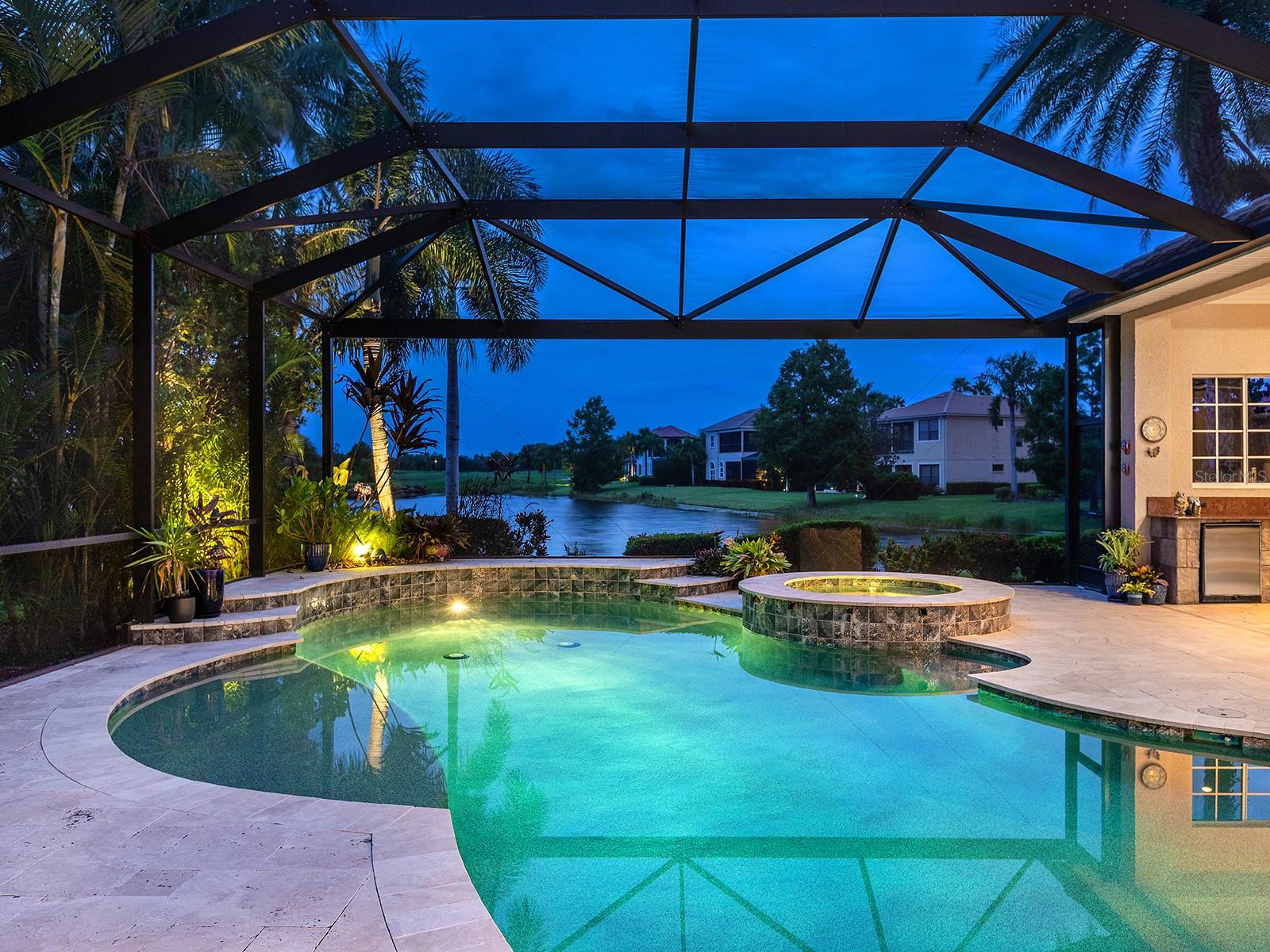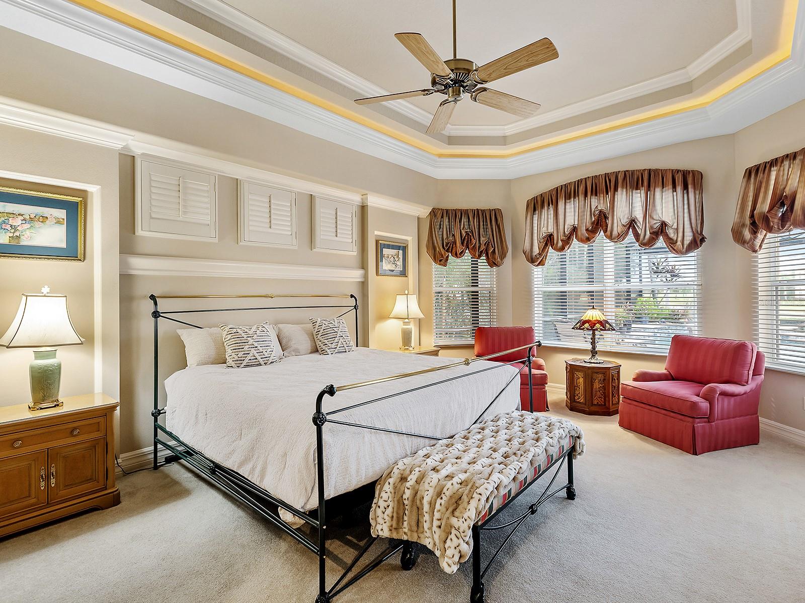 Under contract-accepting backup offers. Set on a private cul-de-sac with sweeping fairway and water views, 12714 Deacons Place offers thoughtfully designed living spaces that blend everyday comfort with refined detail. A circular paver drive and manicured landscaping establish the home’s stately curb appeal, while coach lighting and elegant columns frame the entry. A brand new roof will be installed in October of 2025. Inside, 20-inch porcelain tile with granite inlay sets the tone in a foyer that leads seamlessly into light-filled gathering spaces. The kitchen was created with functionality and design in mind, appointed with granite countertops, Brookhaven® cherry wood cabinetry, a floating prep island with an instant-hot faucet, and top-tier appliances. Appliances include a GE Monogram refrigerator and freezer, Bosch dishwasher, GE wall oven with microwave and warming drawer, a six-burner GE gas cooktop, and a Thermador vent hood that vents to the exterior. A spacious walk-in pantry, art niche, and breakfast nook framed by an aquarium window enhance both function and charm. Just beyond, a butler’s pantry and wet bar connect to the dining room, which is accented by columns, a chandelier medallion, and a tray ceiling with uplighting. The home’s main living areas are designed for effortless living. In the living room, a coffered ceiling and gas fireplace are flanked by custom built-ins, while sliders open to the lanai. The family room features layered tray ceilings, glass shelving, and lanai access zero-corner sliders that dissolve the boundary between indoors and out. A large bonus room with lanai access offers flexibility as a media retreat, additional bedroom, or creative space, complete with surround sound and lake views. The primary suite is a private retreat, entered through double doors into a sitting alcove framed by bay windows with lanai access. The suite offers two walk-in closets, one of which is exceptionally spacious and features custom built-ins with a center island. The en-suite bath is richly appointed with marble floors, a glass-block walk-in shower with multiple shower heads, a Jacuzzi tub, dual vanities with marble tops, and a makeup station. Two sizable guest suites each provide generously sized closets and access to beautifully finished baths, while two half baths and a pool bath serve family and visitors with ease. Outdoor living is a focal point of the residence. The expansive lanai, finished in travertine, offers two covered areas, surround sound, and a vaulted cabana-style ceiling with custom trim. A full outdoor kitchen with granite counters, stainless cabinetry, and a Lynx grill anchors one side, while a fireplace with a cast-stone mantle adds warmth and elegance. The Pebble Tec pool with sun shelf, spa, and cascading water feature is framed by lush landscaping that ensures privacy. Additional features include a three-car garage with storage, central vacuum, surround sound in the living room, family room, bonus room, and lanai. TVs and media equipment also convey. From its architectural details to its inviting indoor-outdoor flow, this residence is equally suited to relaxed living and sophisticated entertaining. With the recent expansion to include a fourth golf course, Lakewood Ranch Golf and Country Club offers unmatched access to premier golfing. Residents can choose from a variety of membership options. Ideally just minutes from The UTC, Waterside, and LWR Main Street. The home is also within easy reach of dining, shopping, and renowned beaches.