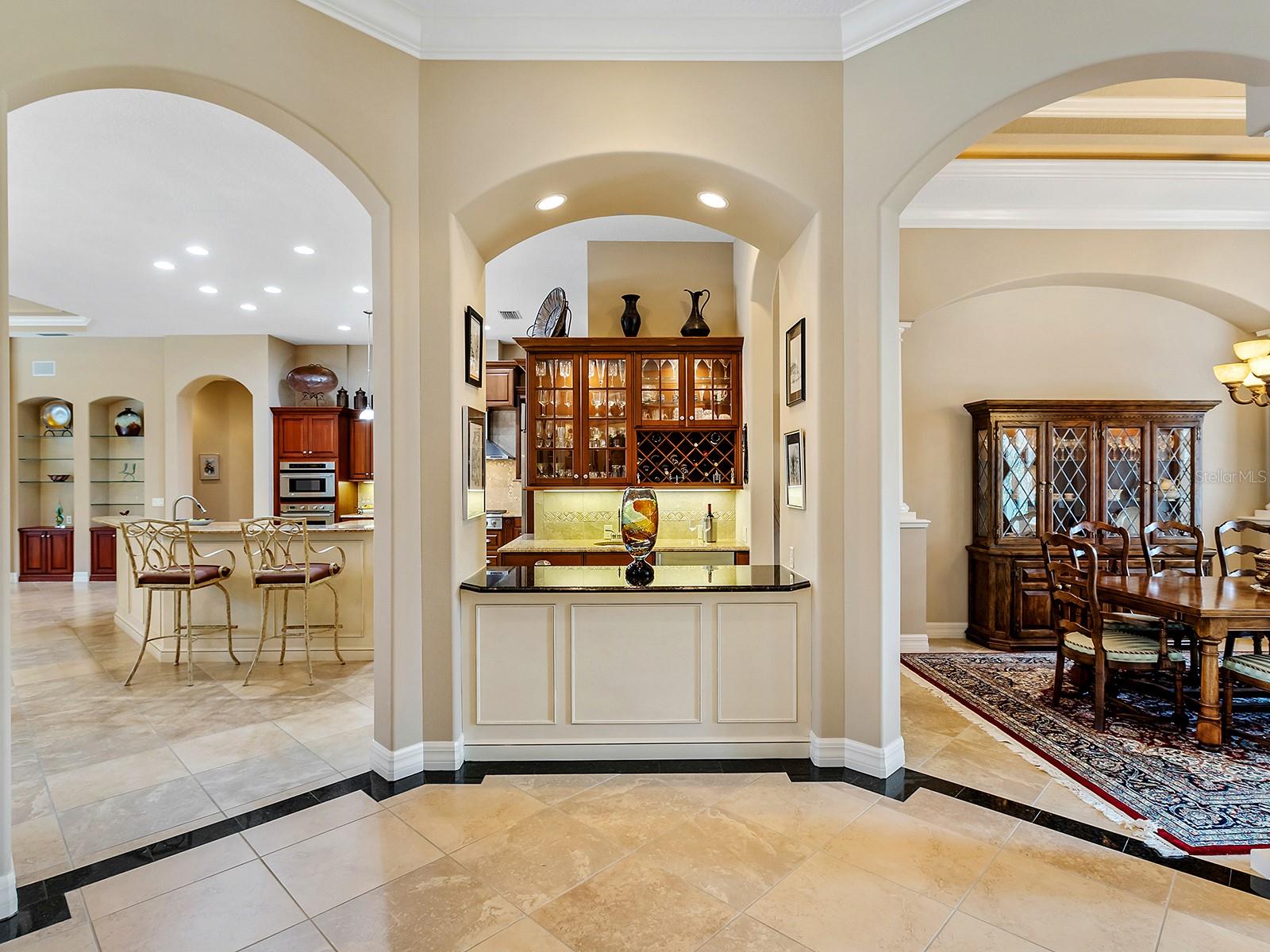 Built-in Features, Ceiling Fans(s), Central Vaccum, Crown Molding, Eat-in Kitchen, High Ceilings, Kitchen/Family Room Combo, Living Room/Dining Room Combo, Primary Bedroom Main Floor, Thermostat, Tray Ceiling(s), Walk-In Closet(s), Wet Bar
