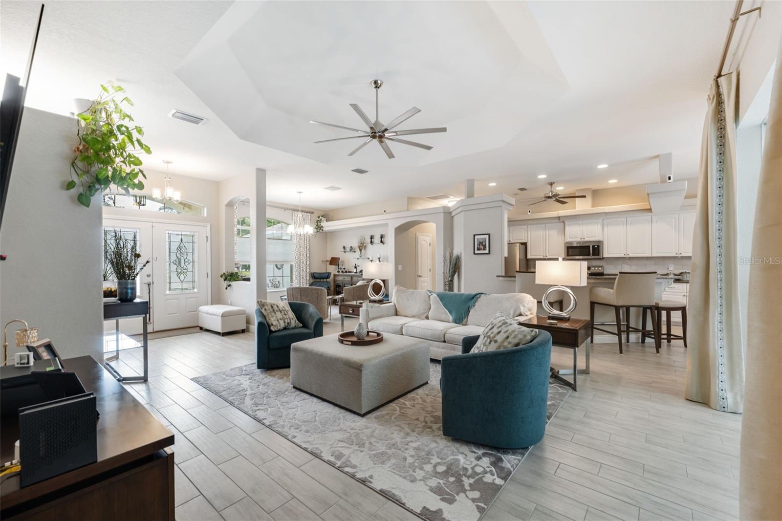 Ceiling Fans(s), Eat-in Kitchen, High Ceilings, Kitchen/Family Room Combo, Open Floorplan, Primary Bedroom Main Floor, Split Bedroom, Stone Counters, Thermostat, Tray Ceiling(s), Walk-In Closet(s)