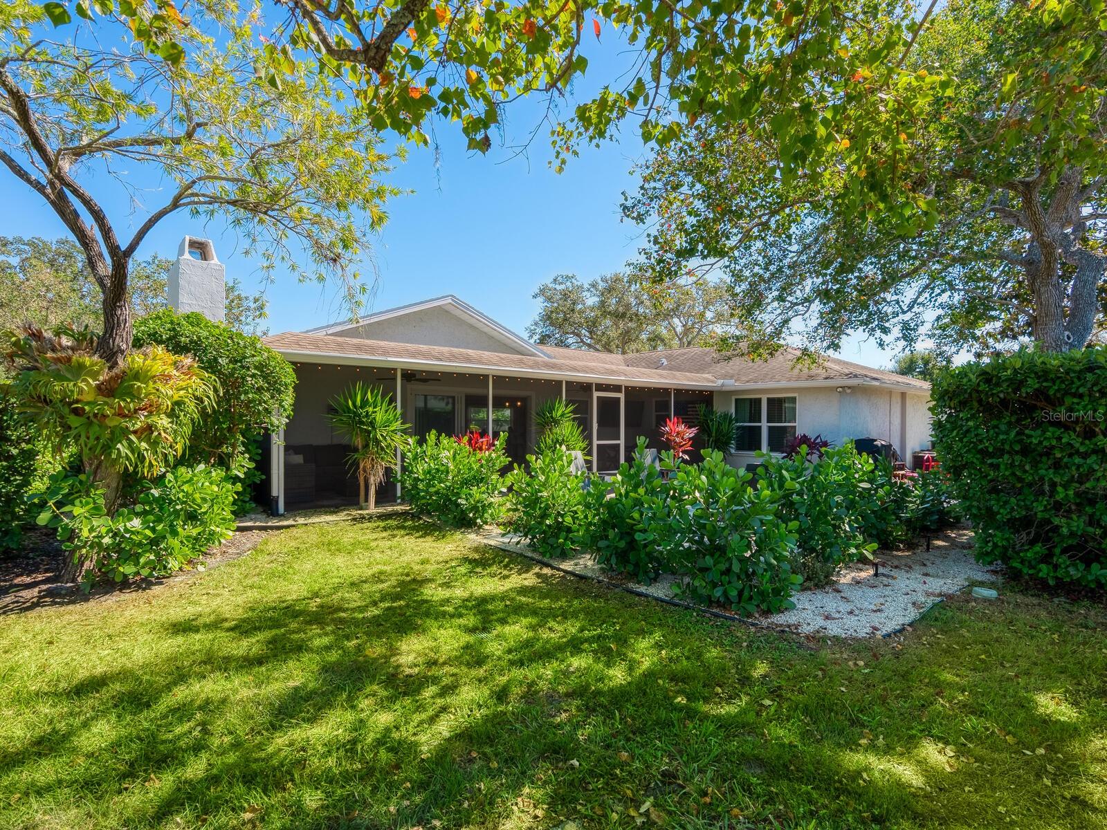 One or more photo(s) has been virtually staged. Set on a quarter-acre corner lot within a deed-restricted Sarasota community, this four-bedroom, two-bath residence blends comfort with modern enhancements. Constructed with concrete block and new hurricane-impact windows and doors, the home offers peace of mind and long-term value. The split floor plan delivers privacy and function, with primary suite positioned at the north end. The updated primary bath and expansive walk-in closet provide a refined retreat. At heart of the home, the open-concept kitchen showcases granite countertops, soft-close cabinetry, and bar seating that opens to a large dining area and vaulted family room with lake views and a travertine-clad wood-burning fireplace. Travertine and wood flooring extend throughout. Three-panel sliding doors reveal a screened lanai ideal for entertaining, offering serene lake views and a fountain feature. Additional highlights include 2025 hurricane-rated garage door, a 2019 air-conditioning system, new ductwork, updated CPVC plumbing and an oversized two-car garage with storage. The exterior has been transformed into a private oasis, complete with upgraded landscaping and paver patio designed for Florida living. This meticulously maintained home provides a rare combination of style, structure, and setting, all minutes from downtown Sarasota and the gulf beaches.