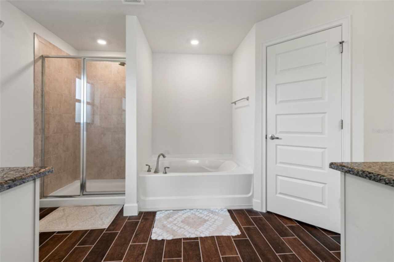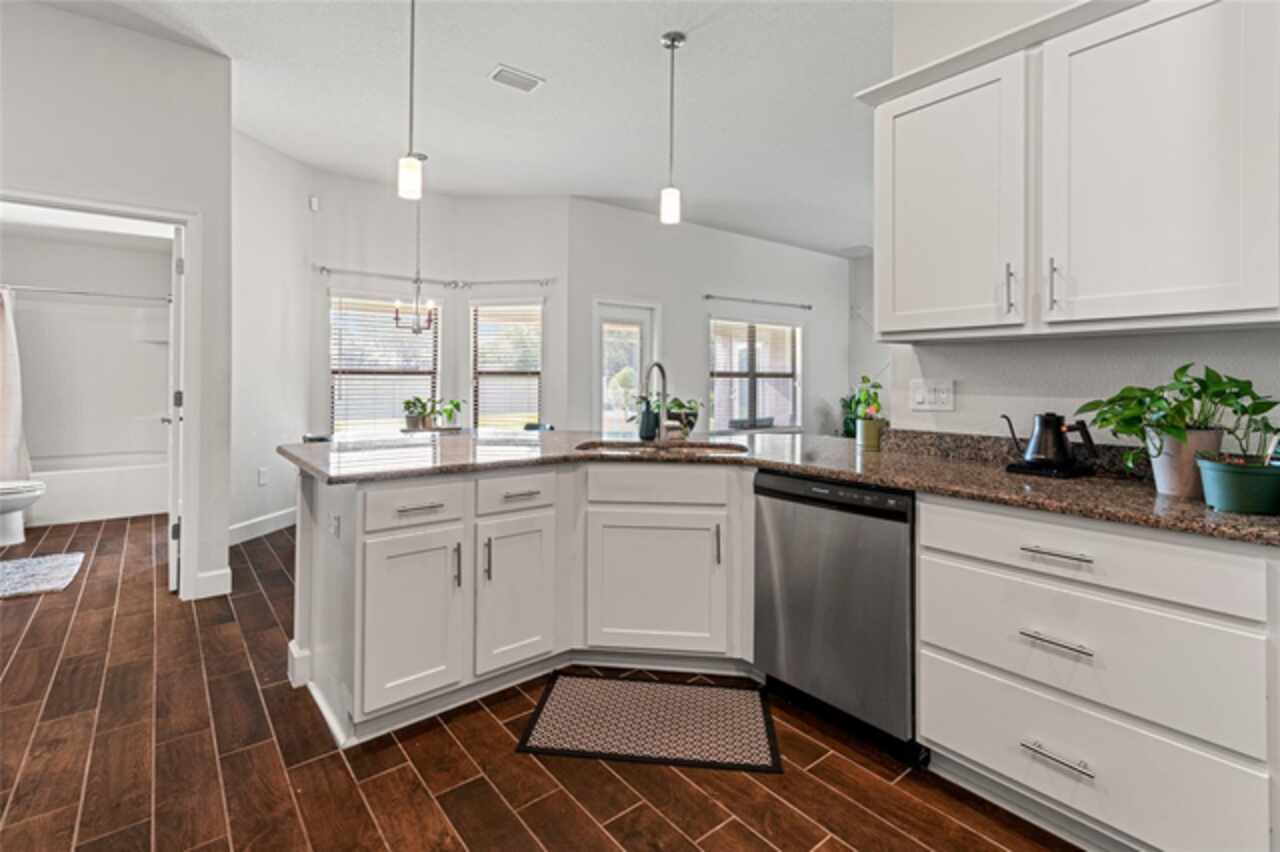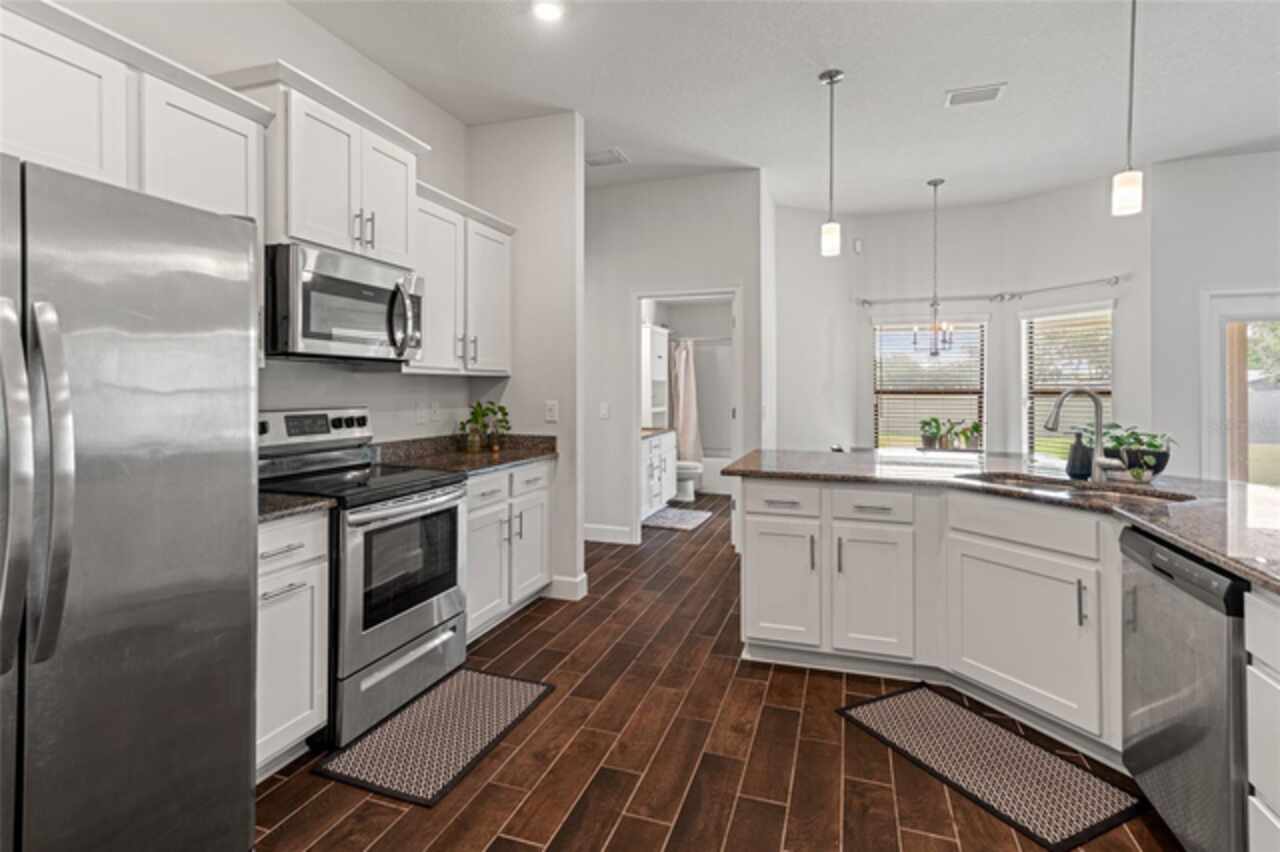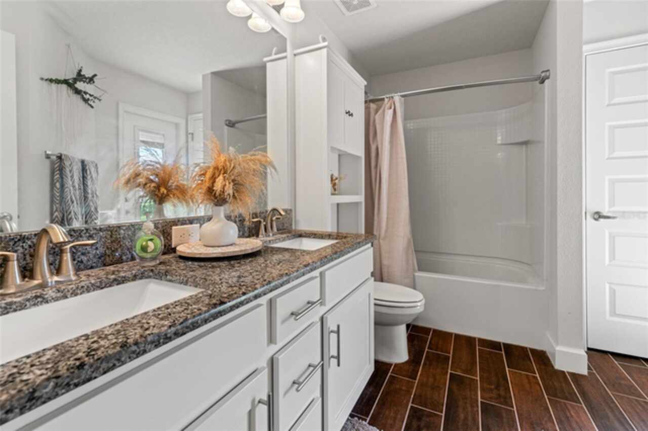 Price Improvemet! Former Model Home! Better than brand new a 2020-built Adams home nestled in the serene gently rolling hills of San Antonio. This stunning home sits on 1/3 acre and offers a split 4 bedrooms, 3 bathrooms, and a 3 car garage, located in the quaint community of Summerfield. A contemporary craftsman exterior with stylish bold colors & stone accents! Once inside the welcoming foyer opens up to a GORGEOUS light, bright and airy great room floor plan with cathedral ceilings in the living room/office area. Your eyes will be drawn to the beautiful easy-care wood look tile throughout the main living areas! Other upgrades include crown molding, 5 1/4" baseboards, beautiful lighting and blinds! The kitchen is the heart of the home and has everything you could want, an oversized center island with a breakfast bar, stainless appliances, granite countertops, pots and pans drawers, a waste basket pull-out, a pantry, and upgraded maple alpine staggered cabinets with tasteful nickel hardware! Your other eating areas include a breakfast nook and a formal dining room. The spacious main bedroom has carpet flooring, two walk-in closets, and a tray ceiling with crown molding and a door to the back patio. The ensuite bath has dual sinks, separate, tub & shower, and a private restroom closet. There is a Jack and Jill bedroom set up with an adjoining bathroom with door to the back patio, and a separate 4th bedroom and bath. Other features are an inside laundry room, sprinkler timer & irrigation! The patio door with an interior blind insert leads to your outdoor sanctuary including a covered lanai great for entertaining/BBQ, there are several plants/trees, a fence across the back yard provided by HOA, and plenty of room for a pool! Energy efficiency was key with the builder of this home with double pane insulated windows and R-38 ceiling insulation, soffit attic ventilation, energy efficient appliances, 15 SEER air conditioner and heat pump with digital thermostat and low volume toilets. You will love the curb appeal of this home which includes a architectural shingled roof, sprinkler system and beautiful landscaping! Easy access to major roads.