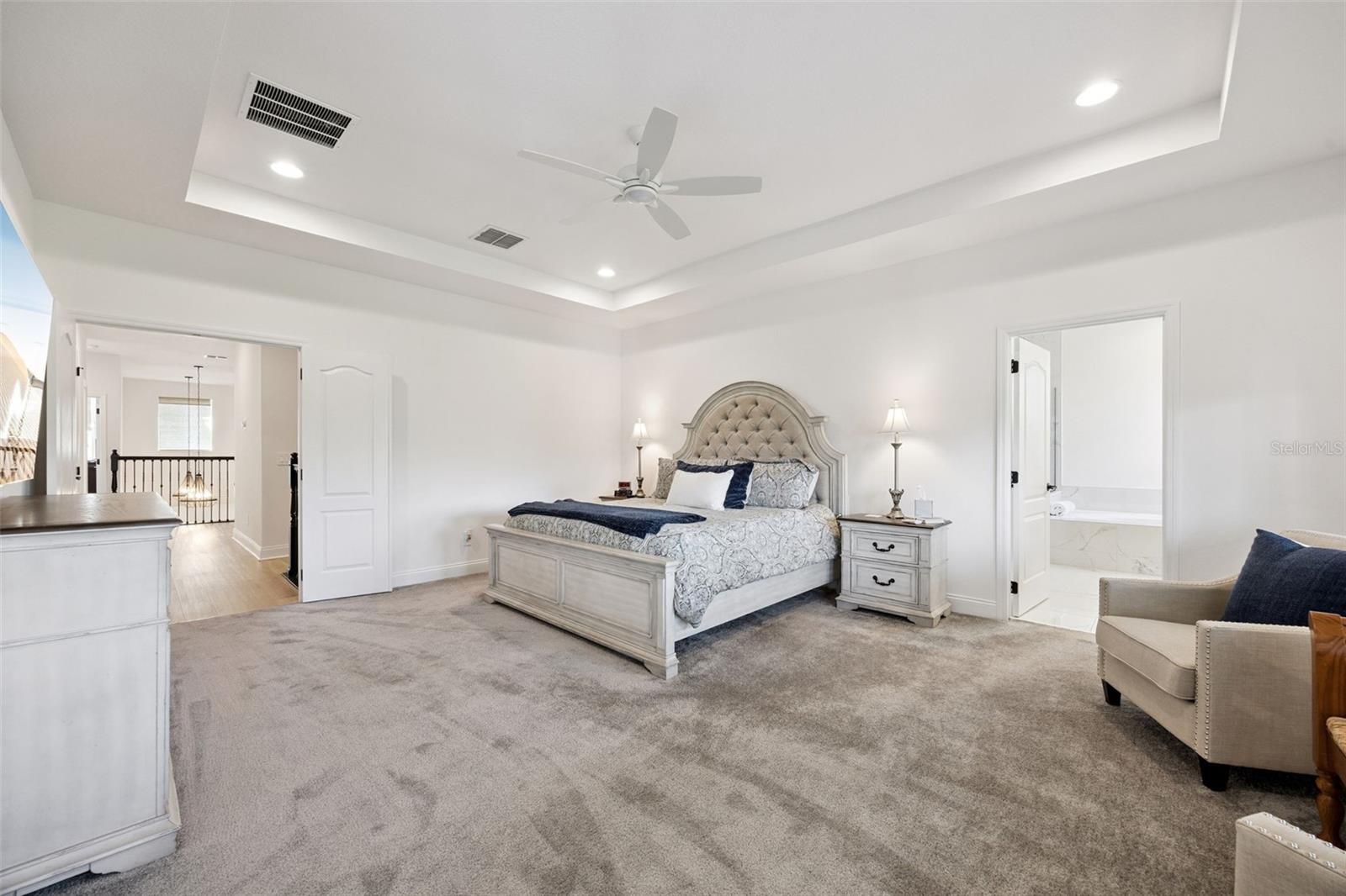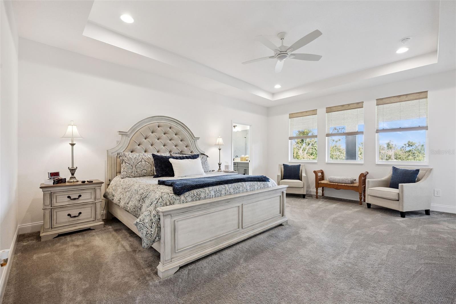 Built-in Features, Ceiling Fans(s), Eat-in Kitchen, High Ceilings, Open Floorplan, Solid Wood Cabinets, Stone Counters, Thermostat, Tray Ceiling(s), Walk-In Closet(s)