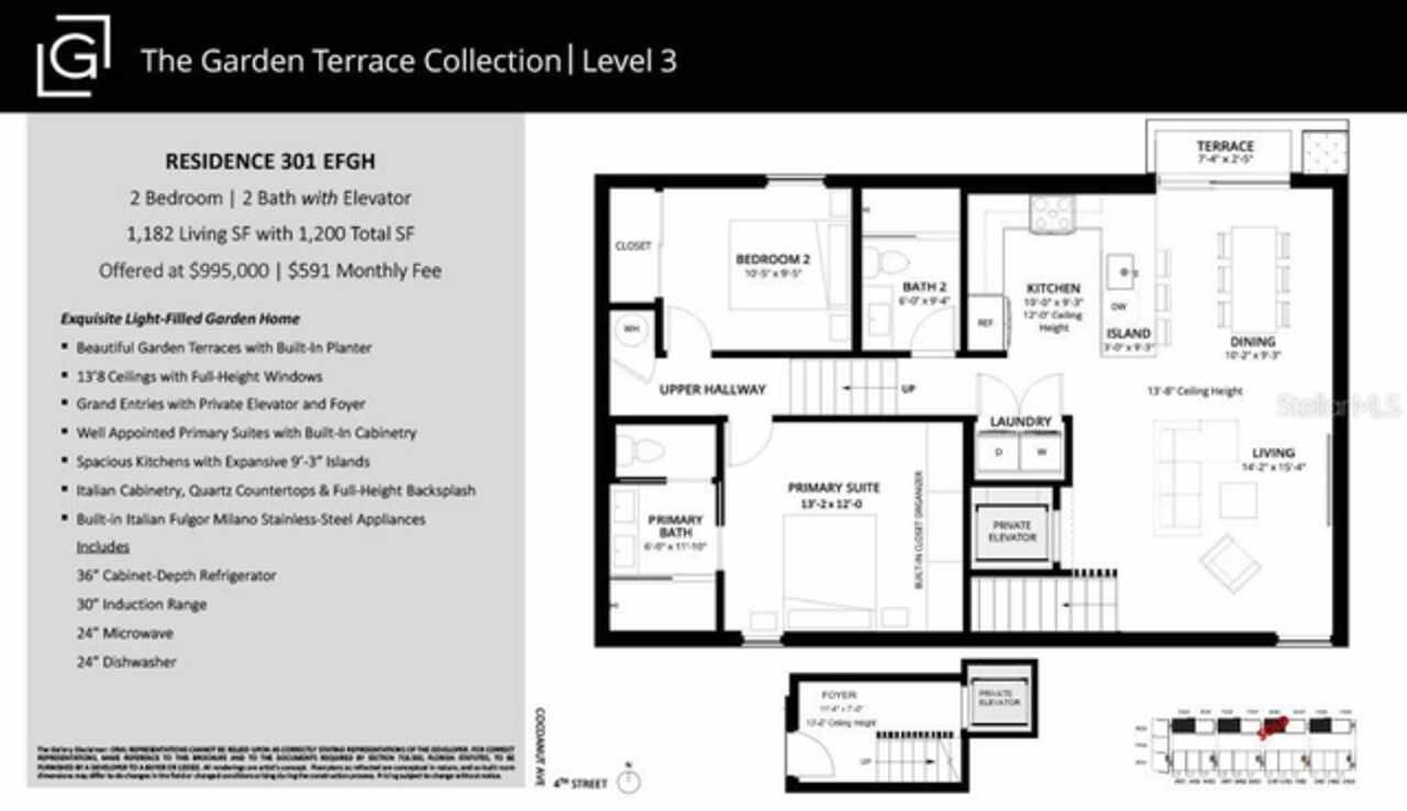 Under Construction. Located downtown 3-blocks from the bay, above floodplain with unparalleled proximity to restaurants, shopping, cultural venues, and the new 53-acre waterfront park. Discover the Garden Terrace Collection at The Gallery Sarasota, where sophistication meets serene modern living. These elegant, light-filled homes redefine luxury with in-suite elevators, 13’-8” soaring ceilings, and beautiful garden terraces, each residence is a masterpiece of contemporary design. Expansive primary suites and meticulously crafted interiors set a new standard for refined comfort and style. The designer integrated kitchen features built-in Italian Fulgor Milano stainless steel appliances, imported Italian flat-panel cabinetry, and a beautiful grand island with gorgeous quartz countertops. Top-tier amenities include a spacious west-facing rooftop pool terrace to soak in the sun's brilliance, social lounge, summer kitchen, and a vast two-room Fitness Center and Yoga Studio equipped with cutting-edge cardio and strength-training equipment. Schedule a private site and showroom tour to view The Gallery’s building/unit models and receive an in-depth look into what we have planned for the condominium and surrounding area. Our showroom is located at 625 S Orange Sarasota, FL 34236 (retail space at Orange Club).