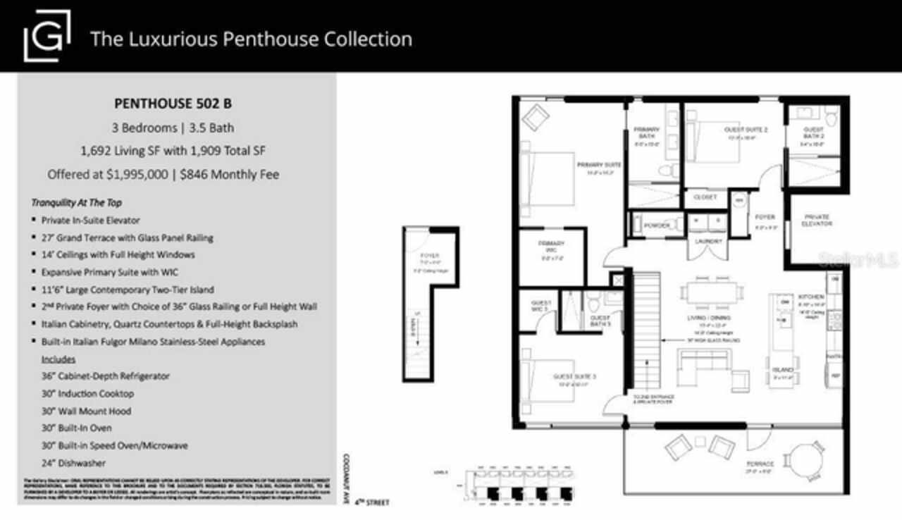 Under Construction. Experience the unparalleled sophistication and serenity of The Gallery’s luxurious south-facing, single-level penthouse, boasting 3 bedrooms and 3.5 baths across 1, 692 square feet of living space (1, 909 total SF), soaring 14’ ceilings with full-height windows, and a 27’ grand terrace with a sleek glass panel railing. The designer integrated kitchen features imported Italian flat-panel cabinetry, quartz countertops, stainless steel appliances, and an extra-long island offering ideal prep space and additional seating. Creating additional privacy, you are greeted with a vestibule to withhold the view of the primary bedroom that features a spacious walk-in closet, floating double vanity, and glass enclosed walk-in shower. Top-tier amenities include a spacious west-facing rooftop pool terrace to soak in the sun's brilliance, social lounge, and a vast two-room Fitness Center and Yoga Studio equipped with cutting-edge cardio and strength-training equipment. Perfectly located on Downtown Sarasota’s west end, above floodplain at 4th & Cocoanut, TheGallerySarasota offers a vibrant, walkable lifestyle with effortless access to premier restaurants, shopping, cultural venues, and the breathtaking 53-acre Bay Park. Amenities include a spacious west-facing rooftop pool terrace with summer kitchen, social lounge, and bay views, along with a vast two-room Fitness Center and Yoga Studio equipped with cutting-edge cardio and strength-training equipment. Schedule a private hardhat and showroom tour to receive an in-depth look into what we have planned for the property and surrounding area. Our showroom is located at 625 S Orange Sarasota, FL 34236 (retail space at Orange Club).