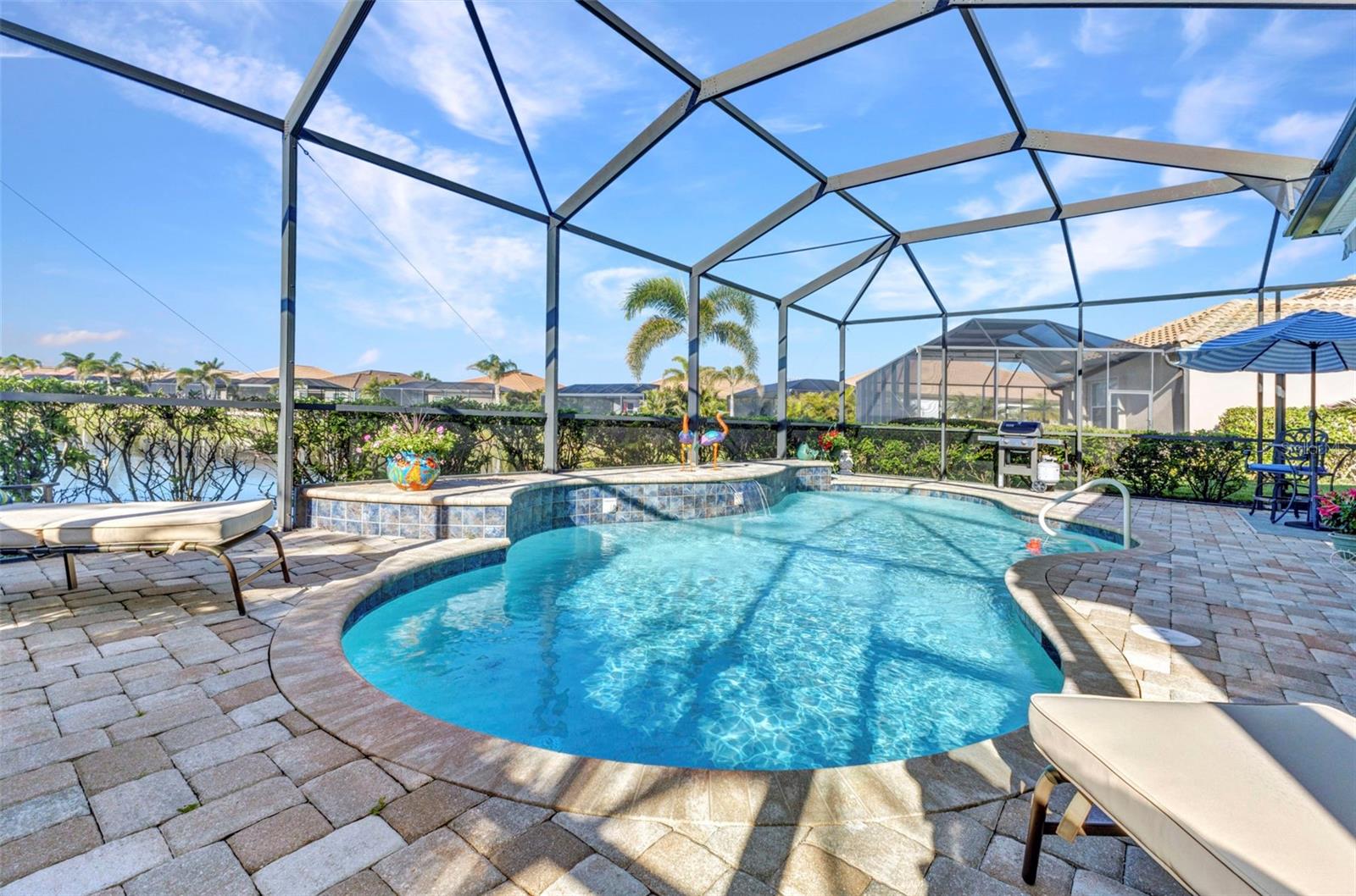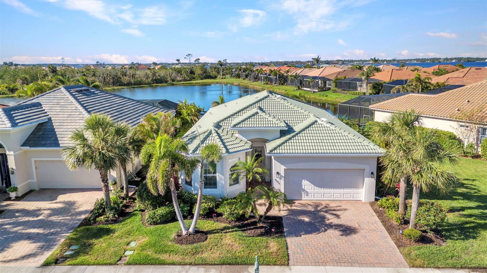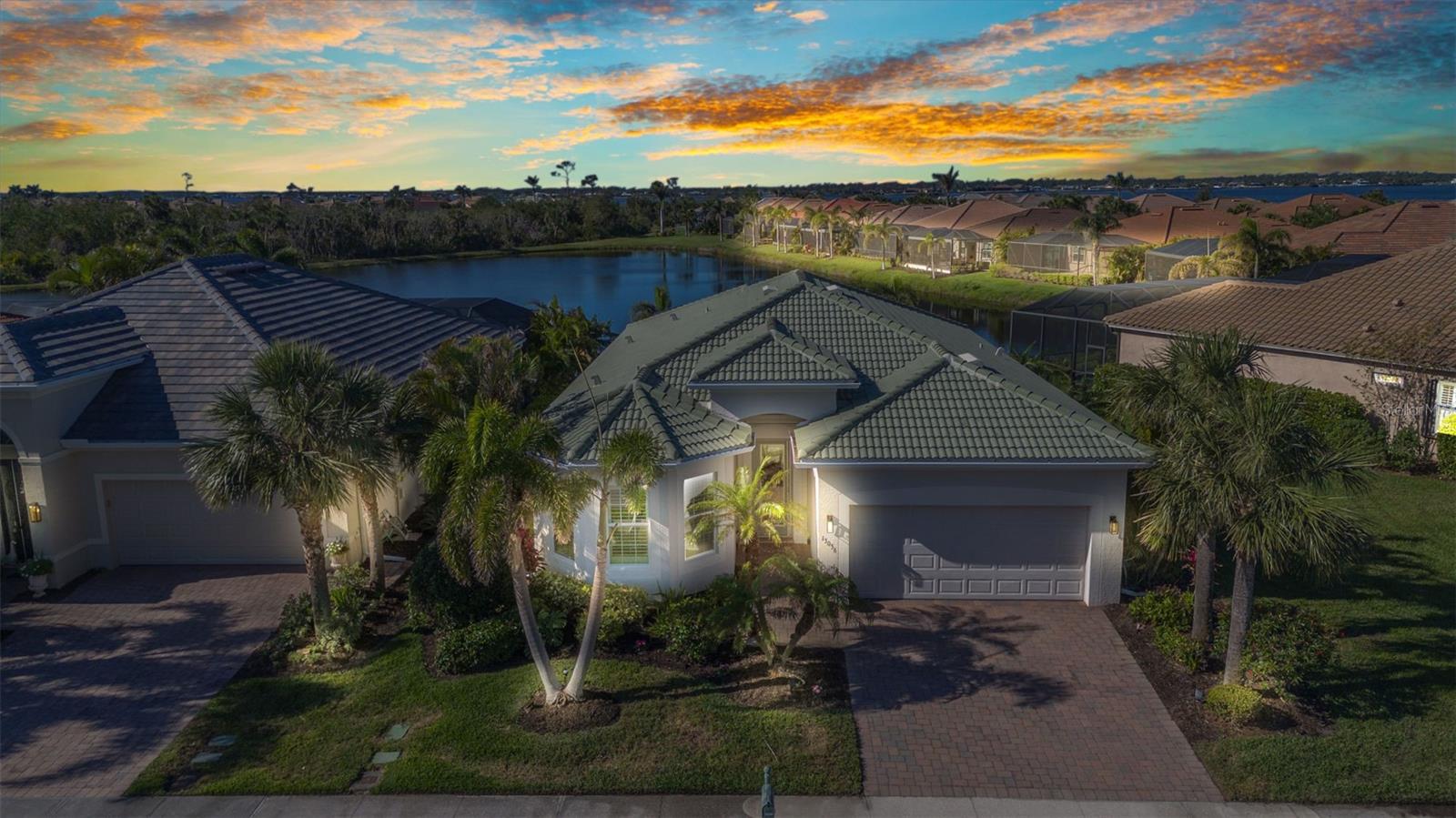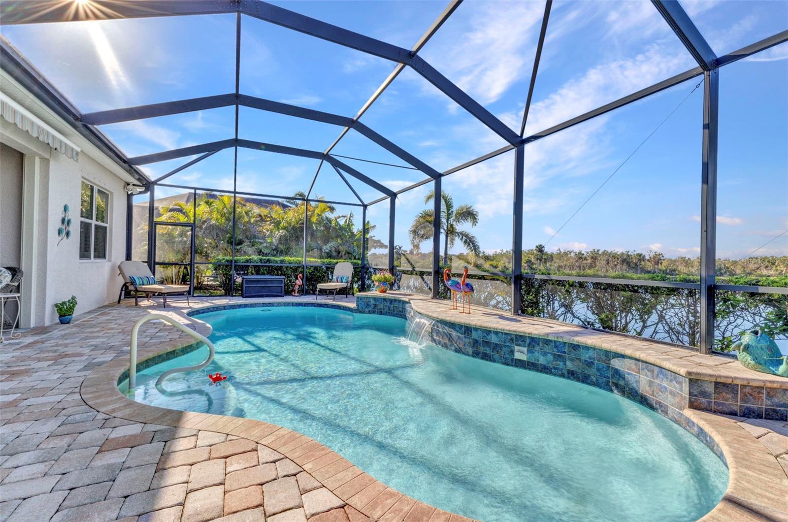 Under contract-accepting backup offers. Discover the finest in Florida living in this beautifully decorated 3-bedroom, 2-bath + office home situated in the sought-after gated golf course community of Riverwood. Overlooking a tranquil pond, this home greets you with a brick paver driveway and fresh coastal colors that establish a light and airy atmosphere throughout. Step inside to find ceramic tile flooring in the main living areas, while the bedrooms and office boast rich solid wood floors. Plantation shutters, crown molding, and a lovely tray ceiling in the living room enhance the open, split-bedroom floor plan. Sliding glass doors open to a spacious 26' x 40' brick lanai, where tranquil water views and a sparkling heated saltwater pool await. The soothing sound of the pool’s water feature adds to the relaxing atmosphere. Recent upgrades include a new pool heater and salt cell, ensuring worry-free enjoyment. Whether you're soaking up the sun or seeking shade, the electric awning has you covered, and the electric roll-down shutter on the lanai provides storm protection and peace of mind. Designed for easy entertaining, the kitchen opens directly to the living area and includes granite counters with a tile backsplash, solid wood soft-close cabinetry, stainless steel appliances, a breakfast bar, and a sunny dining nook. A spacious primary suite with a coffered ceiling and private access to the lanai is en suite, featuring dual sinks, a large tiled walk-in shower, and a generous walk-in closet. Two guest bedrooms and a full guest bath provide plenty of space for family and friends—one guest room even features a charming bay window! You’ll also appreciate the private office/den and the laundry room, with extra storage and a utility sink conveniently located off the kitchen. For added peace of mind, there’s an electric roll-down shutter at the front door, along with shutters for the rest of the home. A spacious 2-car garage completes the package, offering plenty of room for your vehicles and storage needs. Furnishings are negotiable outside of the contract, making this a truly move-in-ready opportunity. As a resident of the vibrant Riverwood community, you’ll enjoy resort-style amenities, including a par 72 championship golf course, a state-of-the-art fitness center, a resort-style pool, pickleball courts, and Har-Tru tennis courts. Just beyond your doorstep, take advantage of world-class fishing, boating, dining, shopping, and the pristine beaches of the Gulf of Mexico. Ideally situated between Sarasota and Ft. Myers on Florida’s scenic West Coast, Riverwood offers the perfect blend of relaxation and adventure. Don’t miss the opportunity to make this beautiful home your own! BEACH CLUB MEMBERSHIP AVAILIABLE!!