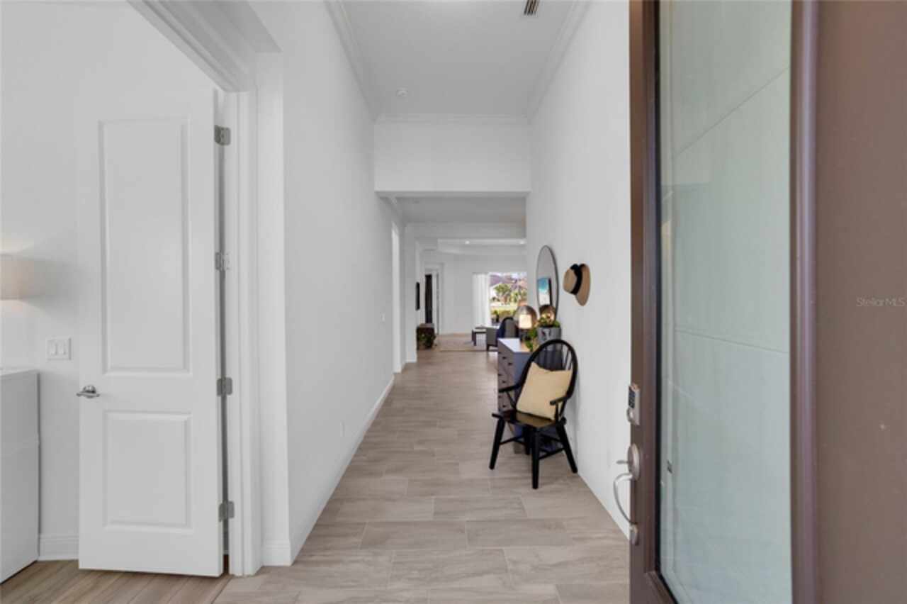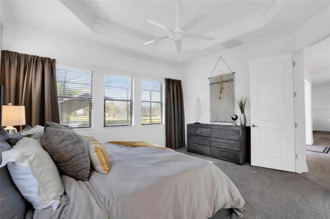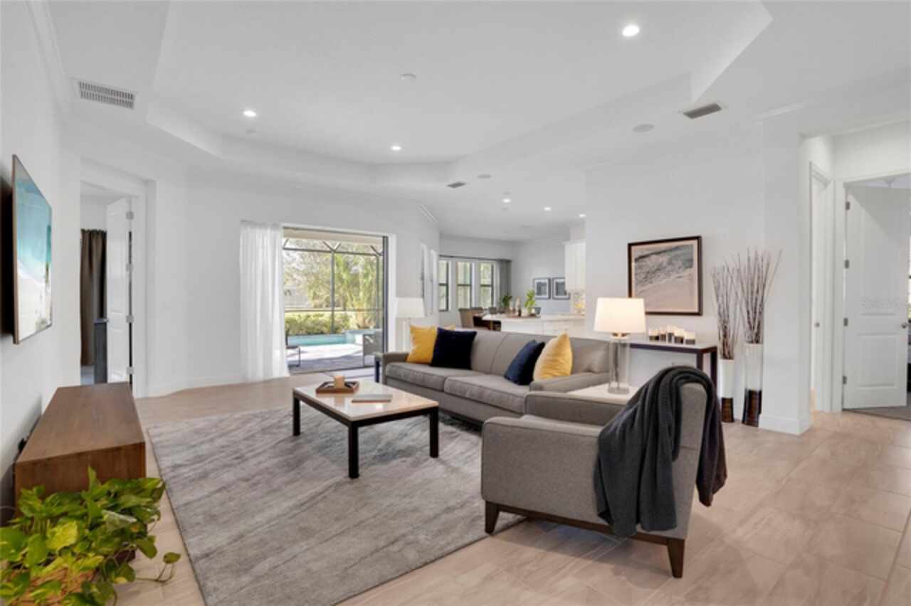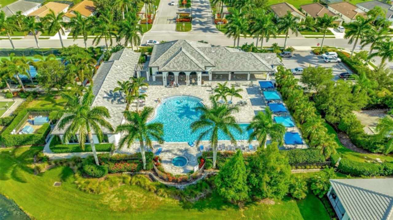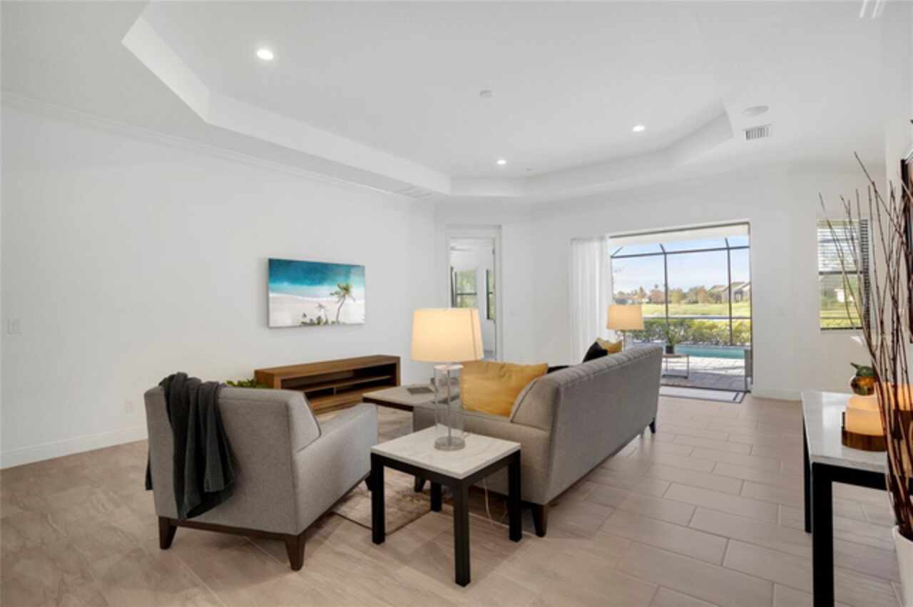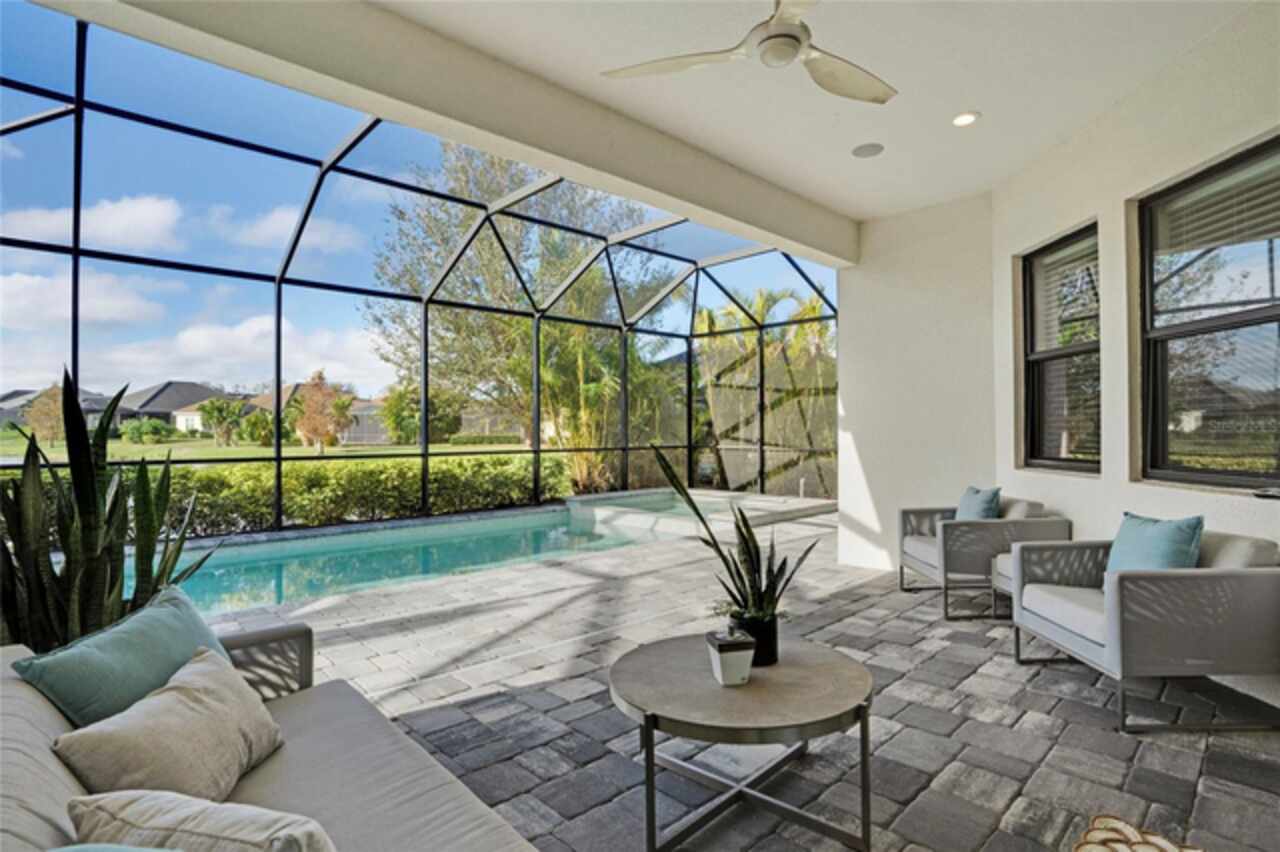 Welcome to your dream home at Indigo by Neal Communities. This furnished WINDSTAR floor plan sits on an oversize homesite with a long water view, offering nearly 2, 900 square feet of living space. This thoughtfully crafted home features 4 bedrooms, 3.5 bathrooms and a versatile den/study. Upon entering, you'll be captivated by the expansive open layout, enhanced by breathtaking views of the pool and peaceful lake beyond. Enjoy picturesque sunsets every evening with the coveted southwest exposure. The elegant living room showcases coffered ceilings, double crown molding & recessed lighting. The kitchen in your new home is a chef's paradise! Featuring premium GE Profile stainless steel appliances, 42" upper cabinets, stunning stone countertops, and an exceptionally spacious walk-in pantry, a large island and a spacious kitchen-dining room combination. The master suite bathroom is a true retreat, offering two walk-in closets, a large soaking tub, 2 generously sized individual vanities, a convenient water closet with a spacious walk-in shower. The stylish laundry room includes a cabinet base wash tub and a matching GE Energy Star washer and dryer. Step outside to your private lanai, where a full-width pool deck invites you to relax. Take a dip in your heated salt water pool that is surrounded by lush palm trees, beautiful landscaping and a water view that creates your very own oasis. This 5-year-old home is equipped with natural gas for the pool heater, cooktop, dryer, and hot water heater. Your 3-car garage showcases quality features, including the builder's upgraded epoxy flooring and practical overhead storage racks. Enjoy peace of mind with Hurricane-Rated Impact Glass Windows and Sliders, designed to withstand storms while contributing to lower insurance rates and enhanced energy efficiency. Additionally, energy efficiency is further optimized with foam-injected concrete block walls and radiant barrier panels in the attic, complete with attic space flooring. Embrace a true maintenance included lifestyle in the sought-after neighborhood of Indigo. Here, residents have access to an impressive array of top-notch amenities. Our Amenity Center features a luxurious Clubhouse with a catering kitchen, a heated resort-style pool with cabanas, a Spa, a 24/7 fitness center, pickleball courts, bocce ball and a playground. The best part? All these amenities are expertly overseen by a dedicated full-time activity's director, ensuring a lively calendar of events and services for our residents—all for an affordable HOA fee. Don't let this extraordinary opportunity pass you by—make Indigo your home, where luxury, comfort, and convenience come together to elevate your everyday living!