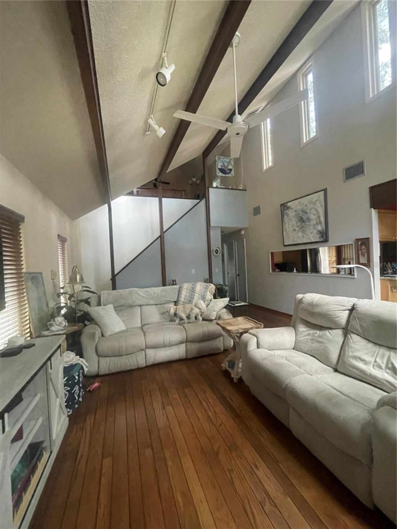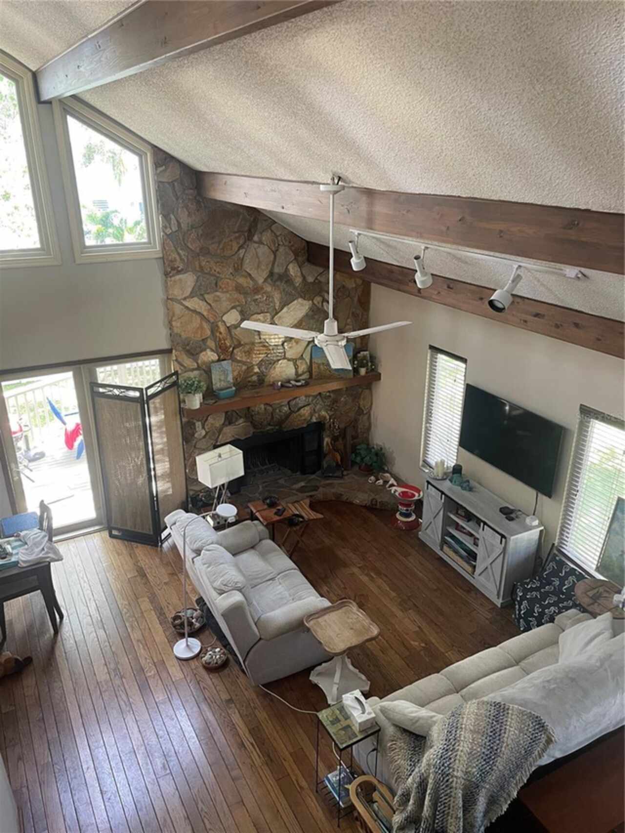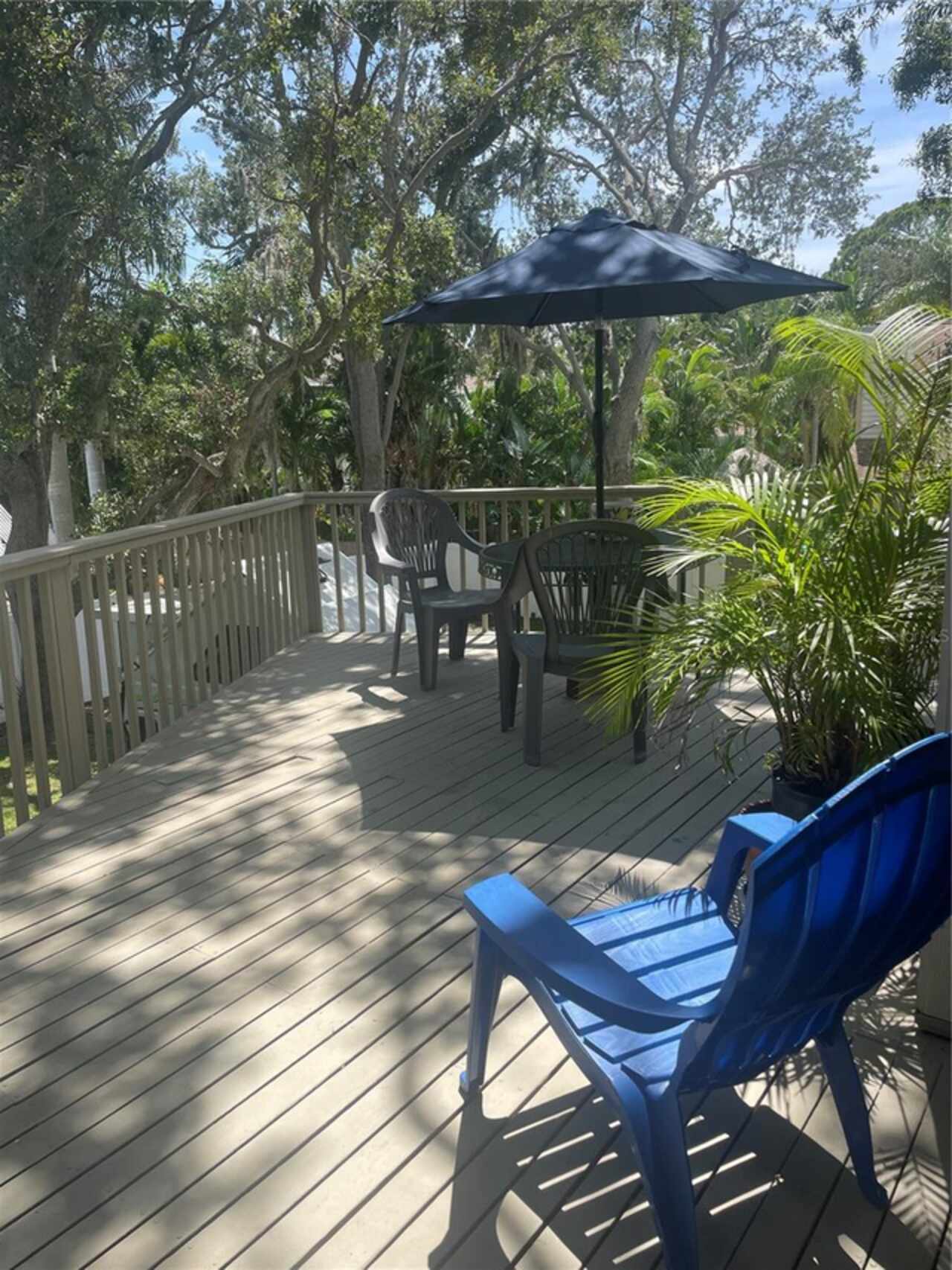 Location! Location! Highly desired Seminole neighborhood. Just minutes from beach, parks, grocery and pharmacies, highly rated public schools and Seminole City Center. Unique contemporary designed home nestled in the shade among a dozen established live oak trees on an oversized lot (1.5x) of average size lot on the street. Deep back yard open for multiple opportunities for your personal desires - custom pool, pickleball court, animal exercise area, putting green - to name a few. Constructed of Hardee board siding and hurricane rated windows. New roof installed and exterior painted in 2022. Open floor plan with 3/4” oak hardwood floors in living and dining room area, newly installed carpet in 3 bedrooms. Post and beam construction. Wood burning fireplace with vents. Ceiling fans throughout. Gorgeous granite countertops and movable island made of solid maple. Propane stove, water heater (replaced 2022), and dryer resulting in lower utility costs, especially in summer. Lots of natural light. An indoor jacuzzi tub on the main floor. Exterior stairwell was rebuilt in 2022 along with renovated deck. There is 662 sq ft of covered area under the 10’ high stilts with space for parking 2 vehicles plus added available space. Concrete driveway was replaced and extended in 2021. 8’ x 10’ storage shed under the deck. The 4th bedroom/office has a Murphy desk/bed on the ground level and was newly finished in 2022 and has it’s own private full bath and exterior entrance. The private deck off the living room extends your enjoyment of being outdoors. You will also enjoy many beautiful sunsets from there.
