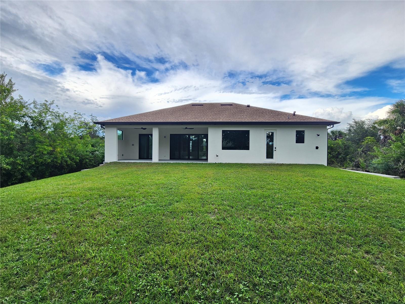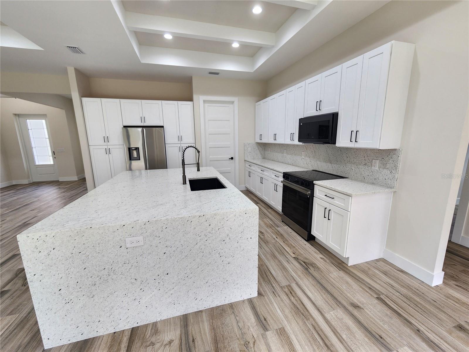 Discover exceptional craftsmanship and modern luxury in the newly built home, designated with high-end finishes and details inside and out. Built for comfort, durability, and style, this residence offers hurricane-impact windows and doors for maximum protection and peace in mind. Step inside to an elegant open-concept layout featuring 10' ceiling with modern step ceiling accents and 8' interior doors, giving every room an elevated, spacious feel. The entire home is finished with beautiful tile flooring, creating a clean and cohesive aesthetic. The gourmet kitchen is a showpiece, highlighted by an impressive granite waterfall island and granite countertops in both the kitchen and bathrooms. Designated with lifestyle in mind, the home includes:-outdoor shower, -rough plumbing for lanai sink, -pre-wired and prepped for a pool, -prepped for a fireplace.Additional upgrades include a double sink in the garage, 12' garage ceilings, and a 32'-wide paver driveway. Paver sidewalk also surrounding the home, enhancing curb appeal and convenience. This home blends luxury features with practical comfort - move-in ready and prepared for furniture enhancements.