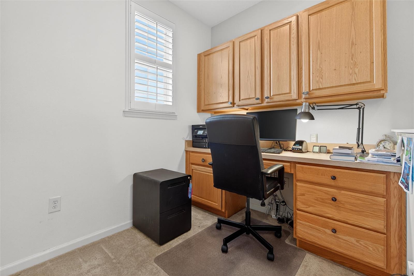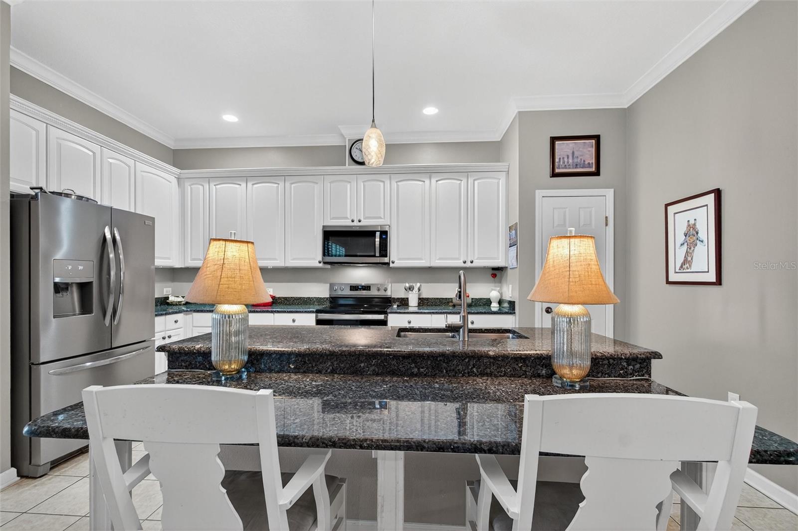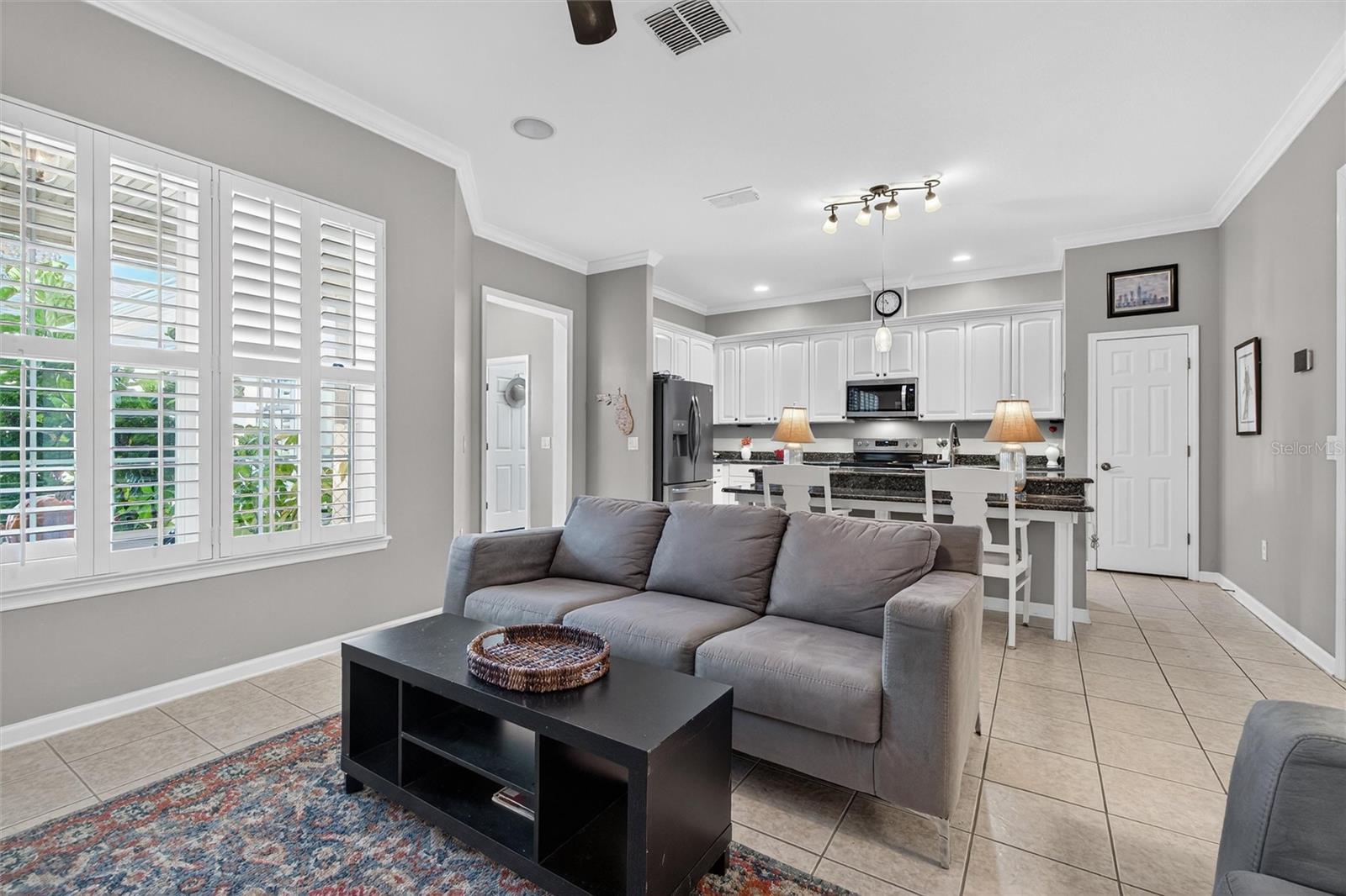 A coveted First Floor Owners' Ensuite Bedroom! The Foyer opens to the Large Open Living/Dining Room combination for large gatherings. Energy Saving Features: a 2025 Zoned Luxury A/C System, 2022 Roof, New Range, New Washer and Dryer. Additional Special Features: 2025 New plush Carpet on stairway and entire 2nd level, Oak Hardwood floors, Crown molding, Wainscoting, Plantation Shutters, Custom Fans and Lighting throughout! The back Porch is Screened for comfort and has a great view of the Private Courtyard with Patio and space for Dining and Grilling. The Courtyard has beautiful flower hedges and mature tropical trees. The KITCHEN features Granite counters, 42" cabinets (some with pull out shelving, a Pantry, Table height Seating for 4 at the Center Island and Stainless appliances. The Owners' First Floor Ensuite has a Walk-in Closet, Wood Floors and Plantation Shutters that afford a view of the Courtyard. The Bathroom has a walk-in Shower, Dual sinks, a Jetted Tub and a private water closet with a window. The Second Level Features Two Large Bedrooms with large closets, a Full Bath, and a Home Office dedicated space with built-in Desk and drawers. The Detached TWO CAR Garage has overhead Storage Racks. With an Acceptable Contract, this Townhome may be purchased with most of the furnishings. The Location is Perfect: a short walk to the Artisan Park Clubhouse, reserved for Artisan Park Residents featuring: A Resort Style Pool and Spa, State-of-the-art Fitness Center, Billiard Room, Full Bar and Restaurant, Banquet Room and popular Activities galore! Be sure and view the Video/Virtual Tour of this mint condition Townhome.