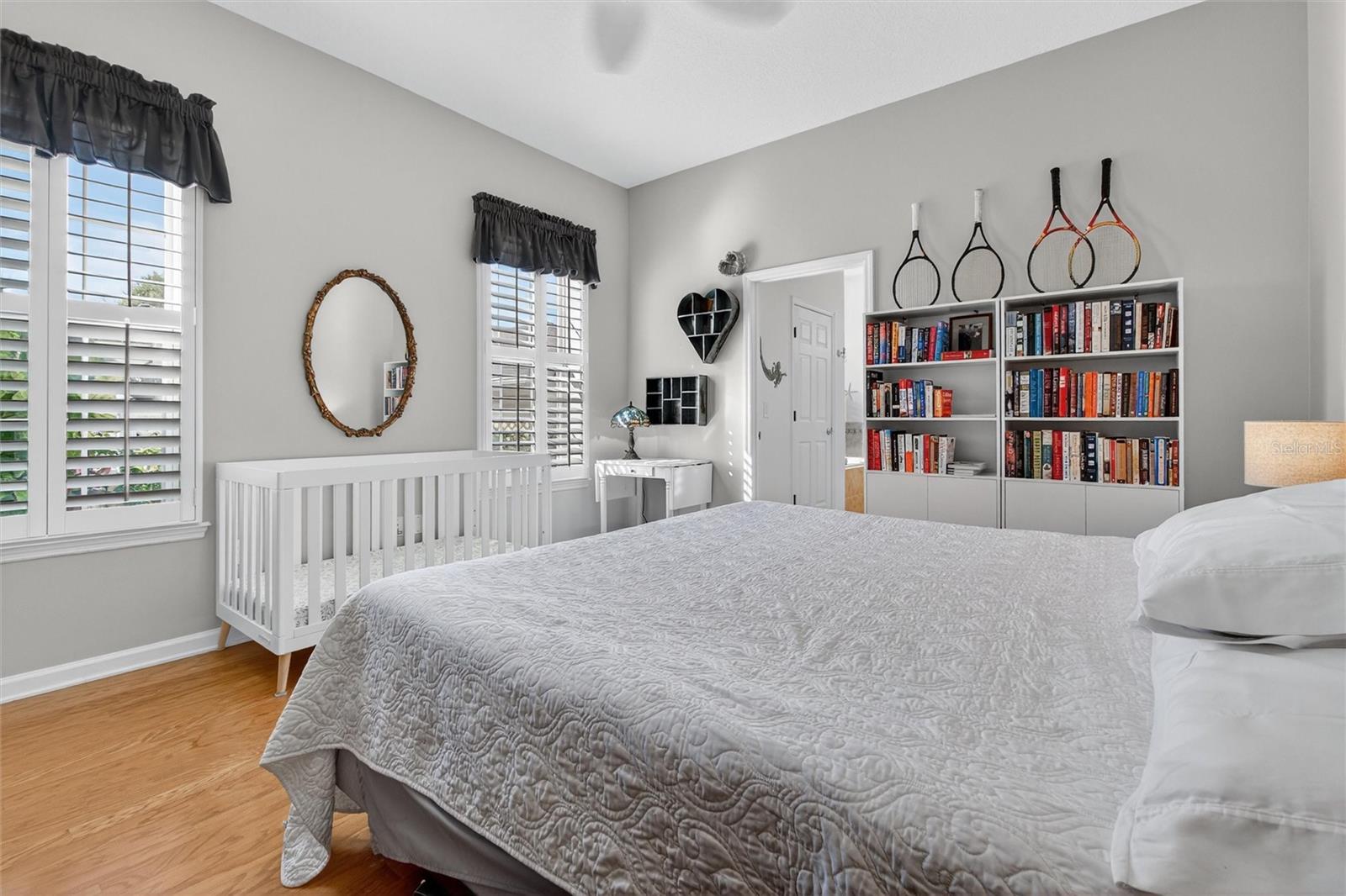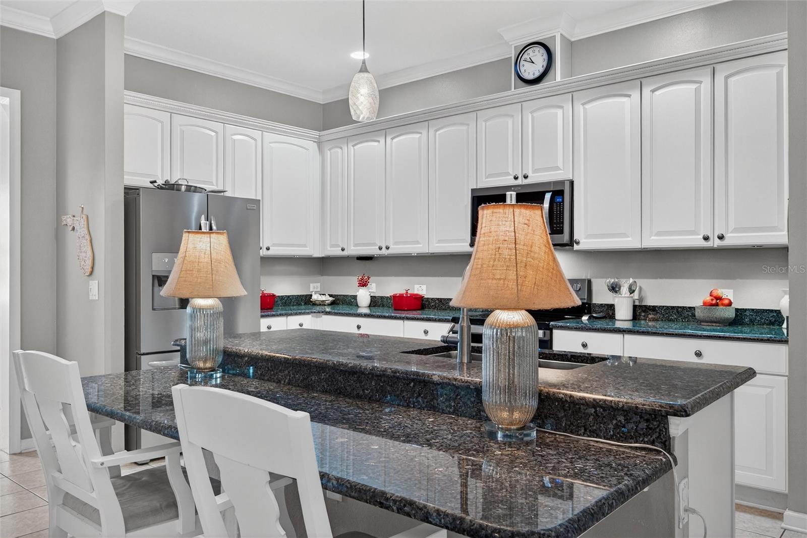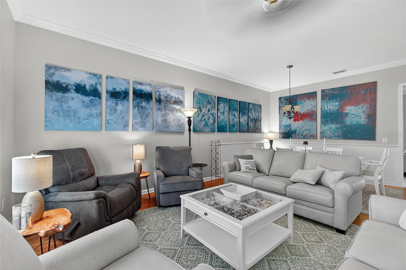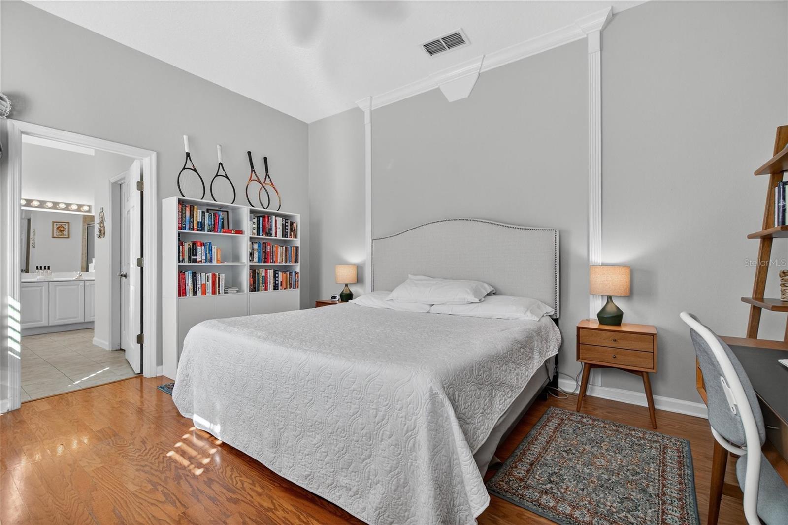 A coveted First Floor Owners' Ensuite Bedroom! The Foyer opens to the Large Open Living/Dining Room combination for large gatherings. Energy Saving Features: a 2025 Zoned Luxury A/C System, 2022 Roof, New Range, New Washer and Dryer. Additional Special Features: 2025 New plush Carpet on stairway and entire 2nd level, Oak Hardwood floors, Crown molding, Wainscoting, Plantation Shutters, Custom Fans and Lighting throughout! The back Porch is Screened for comfort and has a great view of the Private Courtyard with Patio and space for Dining and Grilling. The Courtyard has beautiful flower hedges and mature tropical trees. The KITCHEN features Granite counters, 42" cabinets (some with pull out shelving, a Pantry, Table height Seating for 4 at the Center Island and Stainless appliances. The Owners' First Floor Ensuite has a Walk-in Closet, Wood Floors and Plantation Shutters that afford a view of the Courtyard. The Bathroom has a walk-in Shower, Dual sinks, a Jetted Tub and a private water closet with a window. The Second Level Features Two Large Bedrooms with large closets, a Full Bath, and a Home Office dedicated space with built-in Desk and drawers. The Detached TWO CAR Garage has overhead Storage Racks. With an Acceptable Contract, this Townhome may be purchased with most of the furnishings. The Location is Perfect: a short walk to the Artisan Park Clubhouse, reserved for Artisan Park Residents featuring: A Resort Style Pool and Spa, State-of-the-art Fitness Center, Billiard Room, Full Bar and Restaurant, Banquet Room and popular Activities galore! Be sure and view the Video/Virtual Tour of this mint condition Townhome.