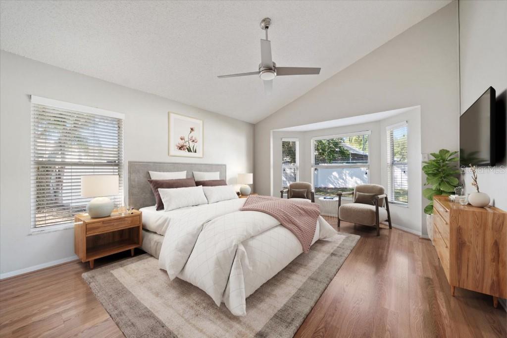 Cathedral Ceiling(s), Ceiling Fans(s), Eat-in Kitchen, Kitchen/Family Room Combo, Living Room/Dining Room Combo, Open Floorplan, Solid Wood Cabinets, Split Bedroom, Stone Counters, Thermostat, Walk-In Closet(s), Window Treatments