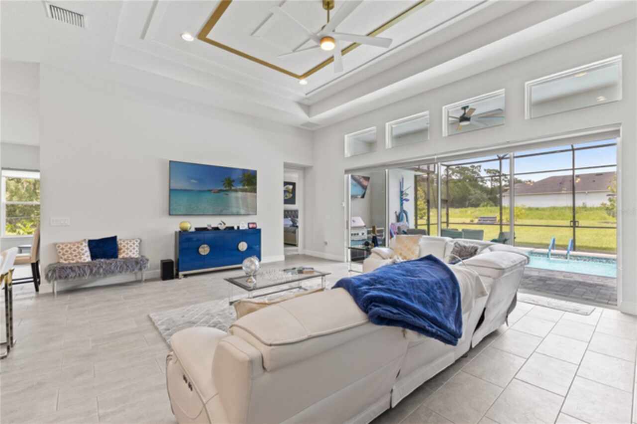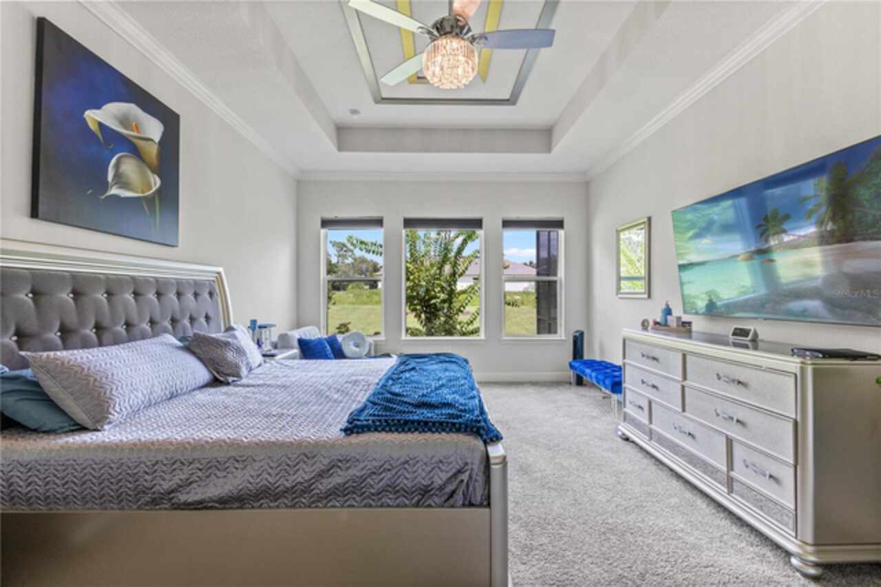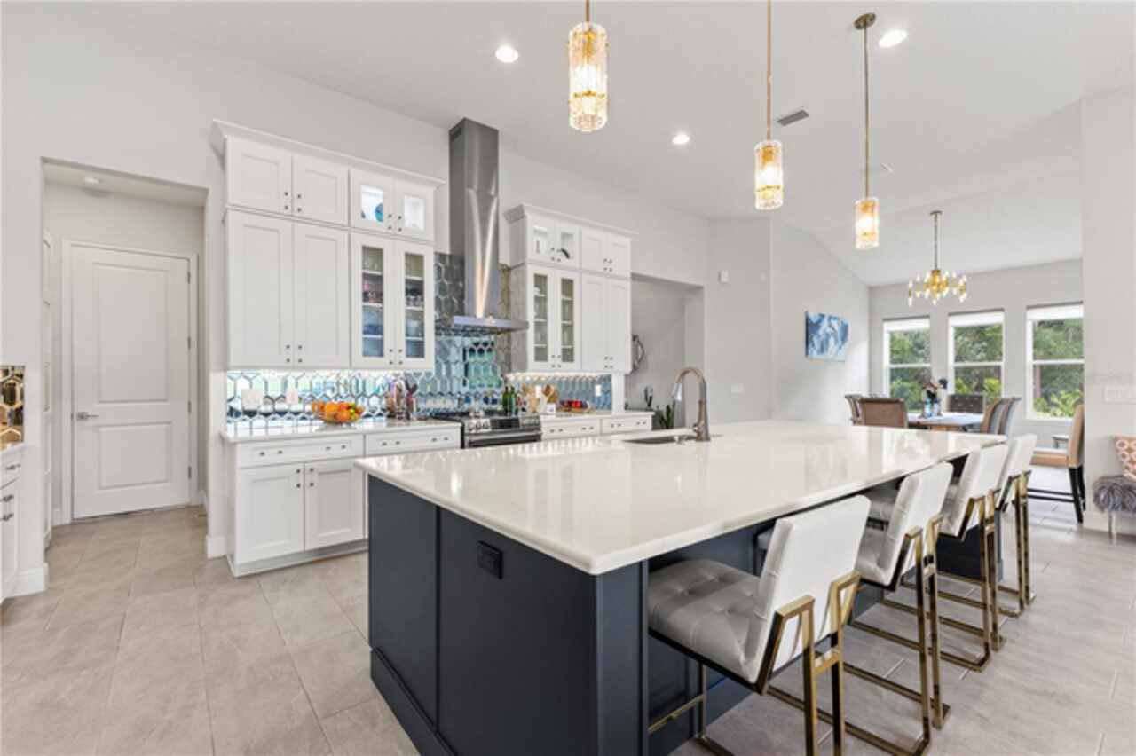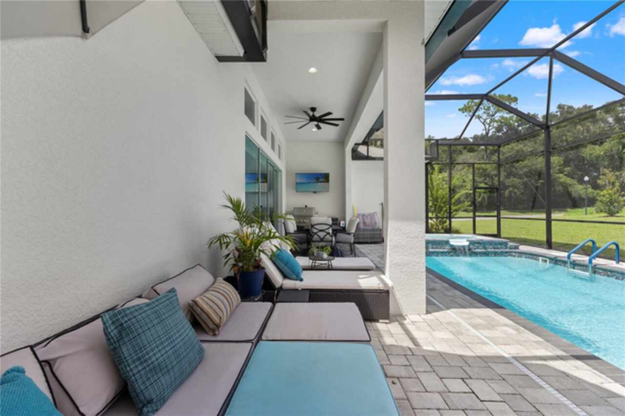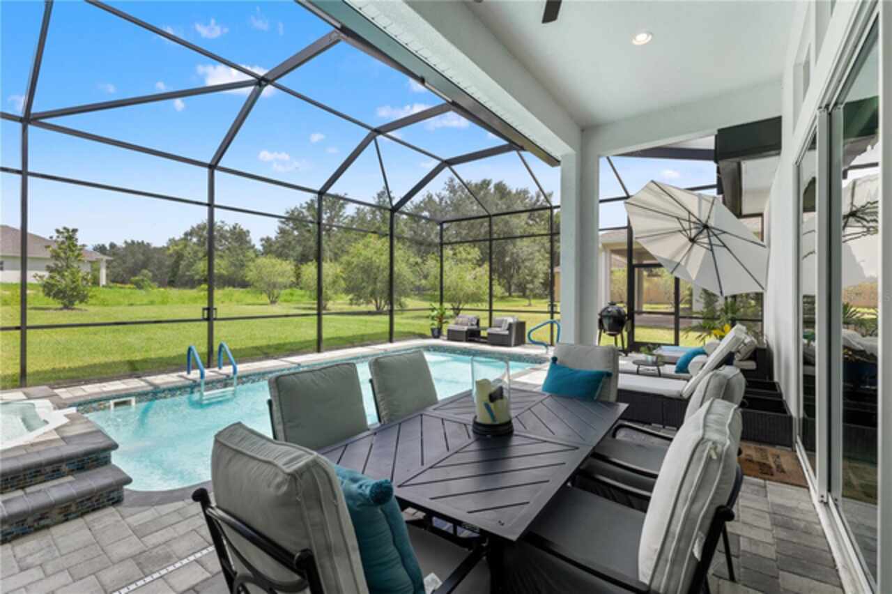 Welcome to 13444 Trailing Moss, a stately residence on a large 1/3-acre corner lot in the prestigious Lake Jovita Golf & Country Club, an upscale, guard-gated community. Known for its scenic rolling hills, sparkling lakes, and resort-style amenities, Lake Jovita features two championship golf courses, tennis and pickleball courts, a fitness center, a community pool, a new dog park, and a beautiful park that sits right in your backyard. The South Course has even hosted USGA U.S. Open local qualifying events, adding to the community’s prestige. With over 3, 000 square feet of living space on a single-story floor plan, this home was designed for both elegance and functionality. The upgraded layout includes three spacious bedrooms, three full bathrooms, and an expanded bonus room with stylish barn doors, perfect for entertaining, a media lounge with surround sound, or even a private retreat. Plus, there’s an additional home office at the front of the home with upgraded hardwood floors, ideal for those working remotely or needing a dedicated workspace. The split-bedroom layout offers exceptional privacy, and the master suite is a true retreat with a spa-like ensuite featuring a free-standing soaking tub, dual vanities, and a massive walk-in closet. At the heart of the home lies the chef’s kitchen, designed to impress both everyday cooks and gourmet entertainers. Outfitted with 42-inch soft-close cabinets and custom uppers, this kitchen offers ample storage and timeless style. The elegant cabinetry is paired with sleek quartz countertops, a large center island with bar seating, and upgraded stainless steel appliances, making meal prep and hosting a delight. Thoughtful touches like a walk-in pantry and custom lighting add both convenience and character. Soaring 12-foot ceilings in the common areas, paired with 10-foot ceilings in the bedrooms and 8-foot doors throughout, create an open, airy atmosphere that enhances the home’s sense of space and luxury. The family room showcases a panoramic slider, allowing seamless indoor/outdoor living and perfect views of the backyard retreat. Step outside into your own private resort. In the expansive backyard, you’ll find a dreamy heated saltwater pool and spa, fully screened-in for year-round enjoyment. The outdoor cooking area is perfect for poolside dining, while the home’s unique location backing up to the park allows you to stroll straight from your backyard into the community’s green space. Additional highlights include exquisite trim work throughout, a three-car tandem garage with abundant storage, an electric vehicle charger, and a whole-home water softener for added comfort. Every detail has been thoughtfully curated to blend luxury, practicality, and timeless style. At 13444 Trailing Moss, you’ll enjoy the perfect balance of refined living and relaxed Florida charm, all in one of the Tampa Bay area’s most sought-after gated golf course communities.