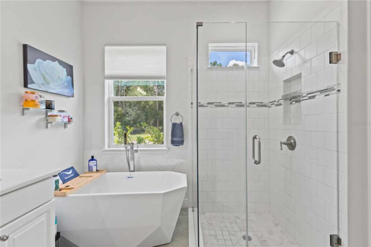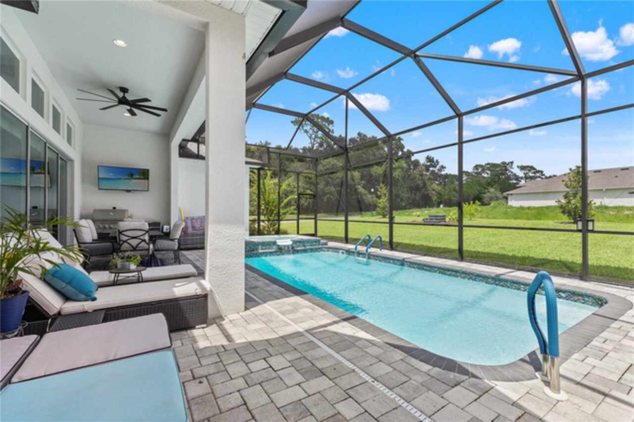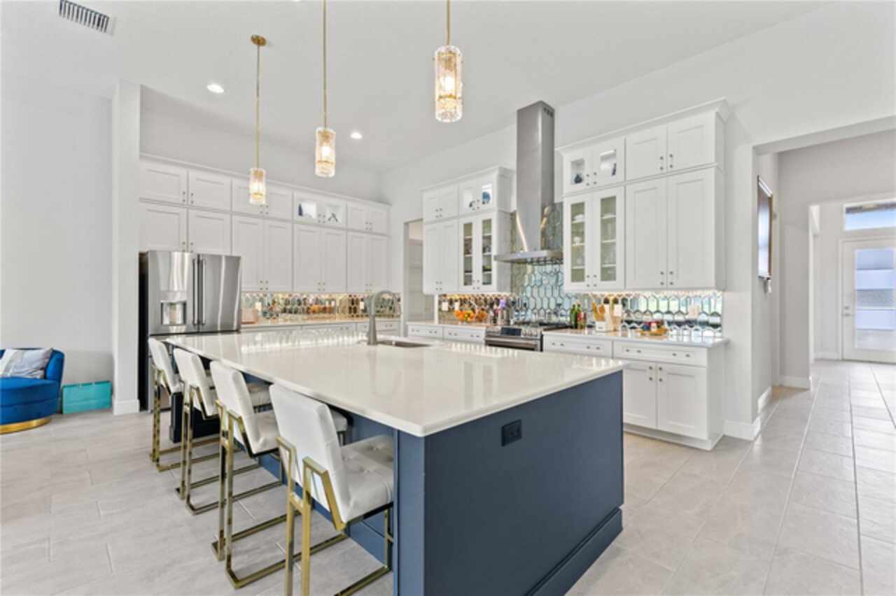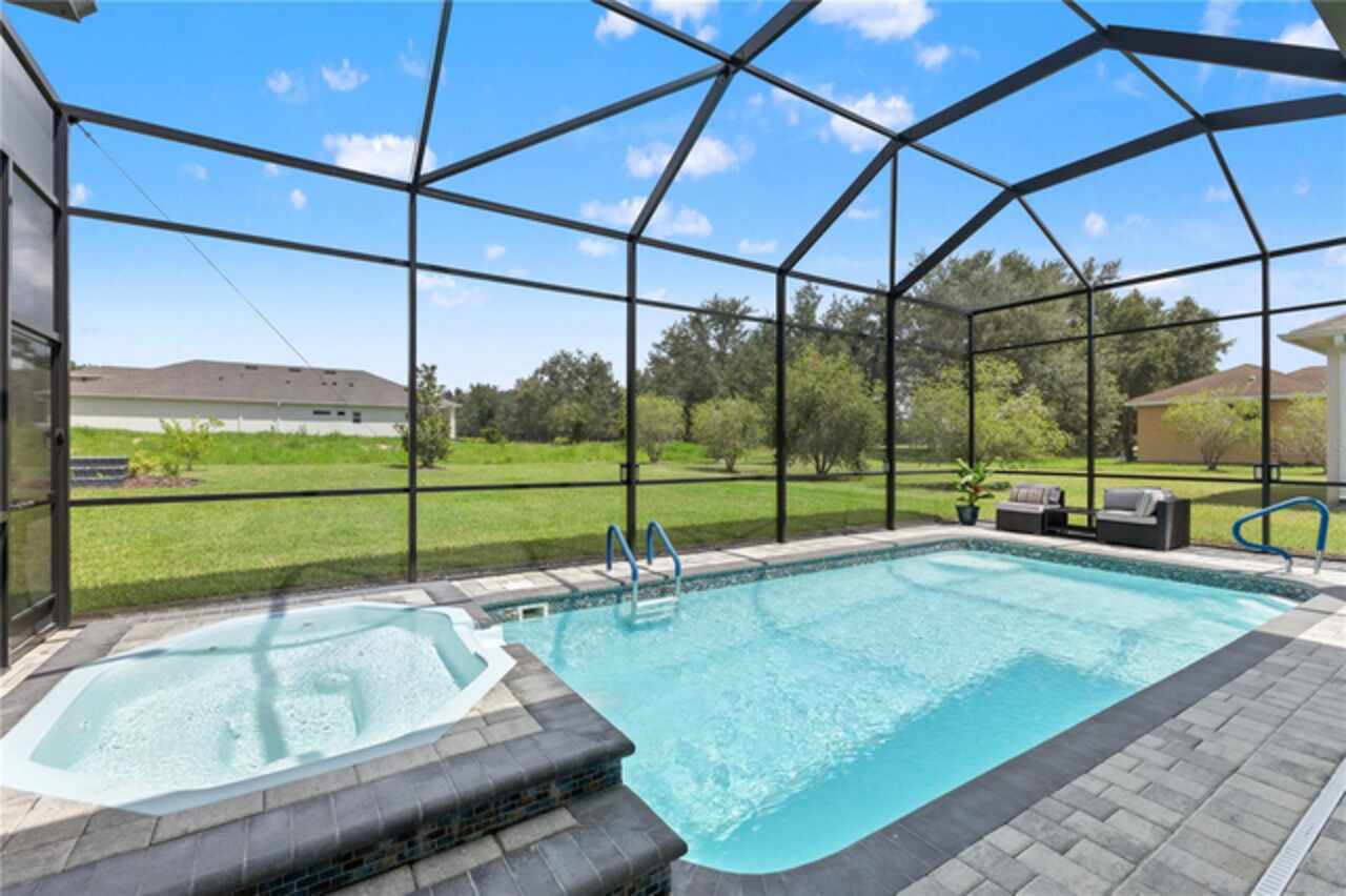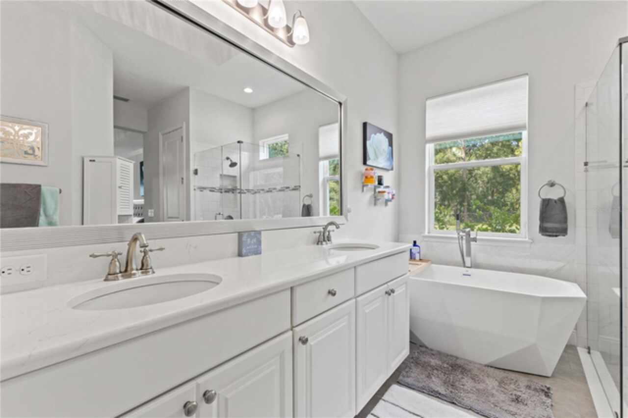 Welcome to 13444 Trailing Moss, a stately residence on a large 1/3-acre corner lot in the prestigious Lake Jovita Golf & Country Club, an upscale, guard-gated community. Known for its scenic rolling hills, sparkling lakes, and resort-style amenities, Lake Jovita features two championship golf courses, tennis and pickleball courts, a fitness center, a community pool, a new dog park, and a beautiful park that sits right in your backyard. The South Course has even hosted USGA U.S. Open local qualifying events, adding to the community’s prestige. With over 3, 000 square feet of living space on a single-story floor plan, this home was designed for both elegance and functionality. The upgraded layout includes three spacious bedrooms, three full bathrooms, and an expanded bonus room with stylish barn doors, perfect for entertaining, a media lounge with surround sound, or even a private retreat. Plus, there’s an additional home office at the front of the home with upgraded hardwood floors, ideal for those working remotely or needing a dedicated workspace. The split-bedroom layout offers exceptional privacy, and the master suite is a true retreat with a spa-like ensuite featuring a free-standing soaking tub, dual vanities, and a massive walk-in closet. At the heart of the home lies the chef’s kitchen, designed to impress both everyday cooks and gourmet entertainers. Outfitted with 42-inch soft-close cabinets and custom uppers, this kitchen offers ample storage and timeless style. The elegant cabinetry is paired with sleek quartz countertops, a large center island with bar seating, and upgraded stainless steel appliances, making meal prep and hosting a delight. Thoughtful touches like a walk-in pantry and custom lighting add both convenience and character. Soaring 12-foot ceilings in the common areas, paired with 10-foot ceilings in the bedrooms and 8-foot doors throughout, create an open, airy atmosphere that enhances the home’s sense of space and luxury. The family room showcases a panoramic slider, allowing seamless indoor/outdoor living and perfect views of the backyard retreat. Step outside into your own private resort. In the expansive backyard, you’ll find a dreamy heated saltwater pool and spa, fully screened-in for year-round enjoyment. The outdoor cooking area is perfect for poolside dining, while the home’s unique location backing up to the park allows you to stroll straight from your backyard into the community’s green space. Additional highlights include exquisite trim work throughout, a three-car tandem garage with abundant storage, an electric vehicle charger, and a whole-home water softener for added comfort. Every detail has been thoughtfully curated to blend luxury, practicality, and timeless style. At 13444 Trailing Moss, you’ll enjoy the perfect balance of refined living and relaxed Florida charm, all in one of the Tampa Bay area’s most sought-after gated golf course communities.