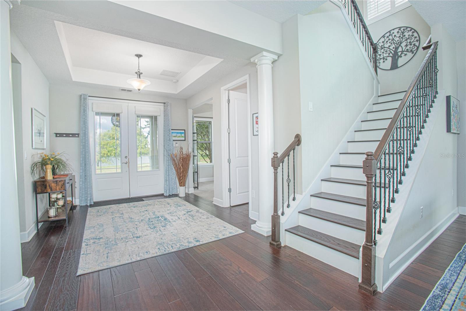 Welcome to Your Private Oasis of Beauty and Serenity! Discover this stunning two-story retreat, offering FIVE bedrooms, THREE-and-a-half baths, and over 3, 200 square feet of thoughtfully designed living space. Every detail of this home blends modern luxury with everyday comfort. A tranquil western WATER VIEW and a two car rear loading garage set the stage for relaxed Florida living. Enjoy the beautifully manicured yard and take in the peaceful surroundings from the charming front porch—perfect for watching the sun set over picturesque Square Lake each evening. Inside, a bright and contemporary interior welcomes you with soaring ceilings, warm wood flooring, and an open, inviting layout. The designer kitchen is a true showpiece for culinary enthusiasts, featuring a gourmet feel with DOUBLE OVENS, expansive granite countertops, a stylish tiled backsplash, a central island with seating, and abundant cabinetry for all your storage needs. The adjoining dining and family rooms create the perfect gathering space for entertaining or simply enjoying time together. On the main floor, you’ll also find a versatile GUEST SUITE with a private bath, a spacious HOME OFFICE with a generous closet, a formal dining/flex space, and a convenient powder room. Upstairs, the LOFT provides a FLEXIBLE SPACE ideal for a media room, play area, or relaxation zone. The owner’s suite is a true sanctuary—complete with a PRIVATE BALCONY where you can unwind while gazing at the moonlight dancing on the water. The spa-inspired ensuite bath offers dual sinks, a soaking tub, a beautifully tiled shower with glass doors, and an EXPANSIVE walk-in CLOSET. Three additional bedrooms and a well-appointed bath are perfect for family or guests, and a second-floor laundry room adds convenience to your daily routine. Every corner of this home features thoughtful upgrades, including plantation shutters, French doors, 10-foot ceilings, recessed lighting, wood soffits, and elegant quartz countertops. Step outside to your COVERED LANAI with a charming paver deck—an inviting space to enjoy OUTDOOR FLORIDA LIVING. Watch your favorite shows on the outdoor big screen or design a dream summer kitchen for effortless entertaining and barbecues. Built by Minto, this Mansfield floor plan exemplifies livability, craftsmanship, and style. Located in the highly desirable Laureate Park community, residents enjoy resort-style amenities including parks, nature trails, tennis courts, popular schools, biking and walking paths, and an aquatic center featuring two resort pools and a lap pool. Look no further, as this home fulfills every aspect of your dream lifestyle. Schedule your private tour today and experience this exceptional home for yourself!