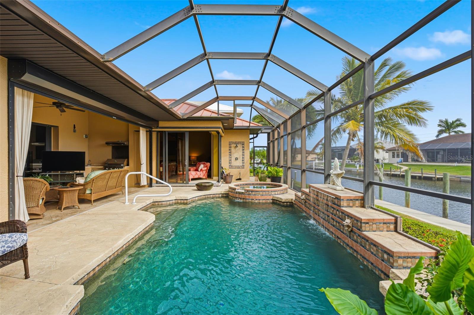 Exquisite Custom-Built Waterfront Home – A True Masterpiece Welcome to this stunning 3-bedr 2 full bath, and 2 half bath home located in one of the most sought-after neighborhoods Punta Gorda Isles. Designed and built in 2007 by Southwest Construction of Florida, this 3, 077 sqft (4, 077 total under roof) masterpiece combines luxury, functionality, and cutting-edge technology, offering a lifestyle of unparalleled comfort. Interior Features: Open & Spacious Design: 14-foot ceilings with 8-foot doors throughout, creating a sense of grandeur. Custom 18" diagonal floor tile flows seamlessly from the interior to the exterior entry. Gourmet Kitchen: Gas kitchen with stainless steel appliances, including a refrigerator/freezer with French doors and bottom freezer. Cambria Quartz countertops, under-cabinet lighting, and a mitered glass bay window elevate this space, complete with a walk-in pantry for ample storage. Master Suite: The expansive master bedroom (20.8’ x 16.2’) features a tray ceiling and direct access to the pool area via zero-corner impact sliders. The en-suite master bath offers dual sinks, a walk-in shower with glass block window, a soaking tub, and a private commode room with pocket doors. Walk-In Closet: The 14’x7’ master closet is a true standout, featuring a custom closet organizer system and pocket doors for seamless access. Media Room: The second-floor media room includes a 52” Samsung TV, surround sound system, wet bar, fridge, and a convenient ½ bath, making it the perfect place for entertainment. Study/Office: The study (11.4’ x 14.8’) is designed with Brazilian Hickory wood floors and vaulted ceilings, providing an ideal workspace or retreat. Built-In Sound System & Security: A whole-house built-in sound system enhances every room, and the home is equipped with a state-of-the-art security system for added peace of mind. Exterior & Waterfront Features: Saltwater Pool & Spa: The outdoor space is a true oasis, featuring a heated saltwater pool with Pebble-Tec finish, water features, and a luxurious heated spa. An outdoor shower with hot and cold water is perfect for rinsing off after a swim. Outdoor Living: A summer kitchen with a built-in JennAir grill, sink, and refrigerator provides the perfect setup for alfresco dining. The covered patio and outdoor space offer sweeping views of the water and surrounding landscape. Dock & Seawall: A 96-foot seawall, maintained by the city, offers direct access to the water, with a concrete dock (87’x10’) equipped with 8 piles for secure boat docking. The southern rear exposure ensures sunshine throughout the day. Additional Features: A 120-gallon propane tank powers the outdoor kitchen and other appliances, while the home’s irrigation system keeps the St. Augustine lawn lush and green year-round. Exterior soffit electric outlets add convenience for seasonal lighting. Technology & Comfort: The home is equipped with a Carrier Puron 4-ton and 2-ton air conditioning system with wireless remote control for year-round comfort. The home features zero-corner impact glass sliders for maximum energy efficiency and storm protection, as well as custom window treatments throughout. This home is more than just a residence – it’s a lifestyle. Perfectly located in Punta Gorda, offering serene waterfront views and a home that blends modern luxury with every comfort you could wish for. Furniture negotiable Schedule your private showing today to experience this one-of-a-kind home!