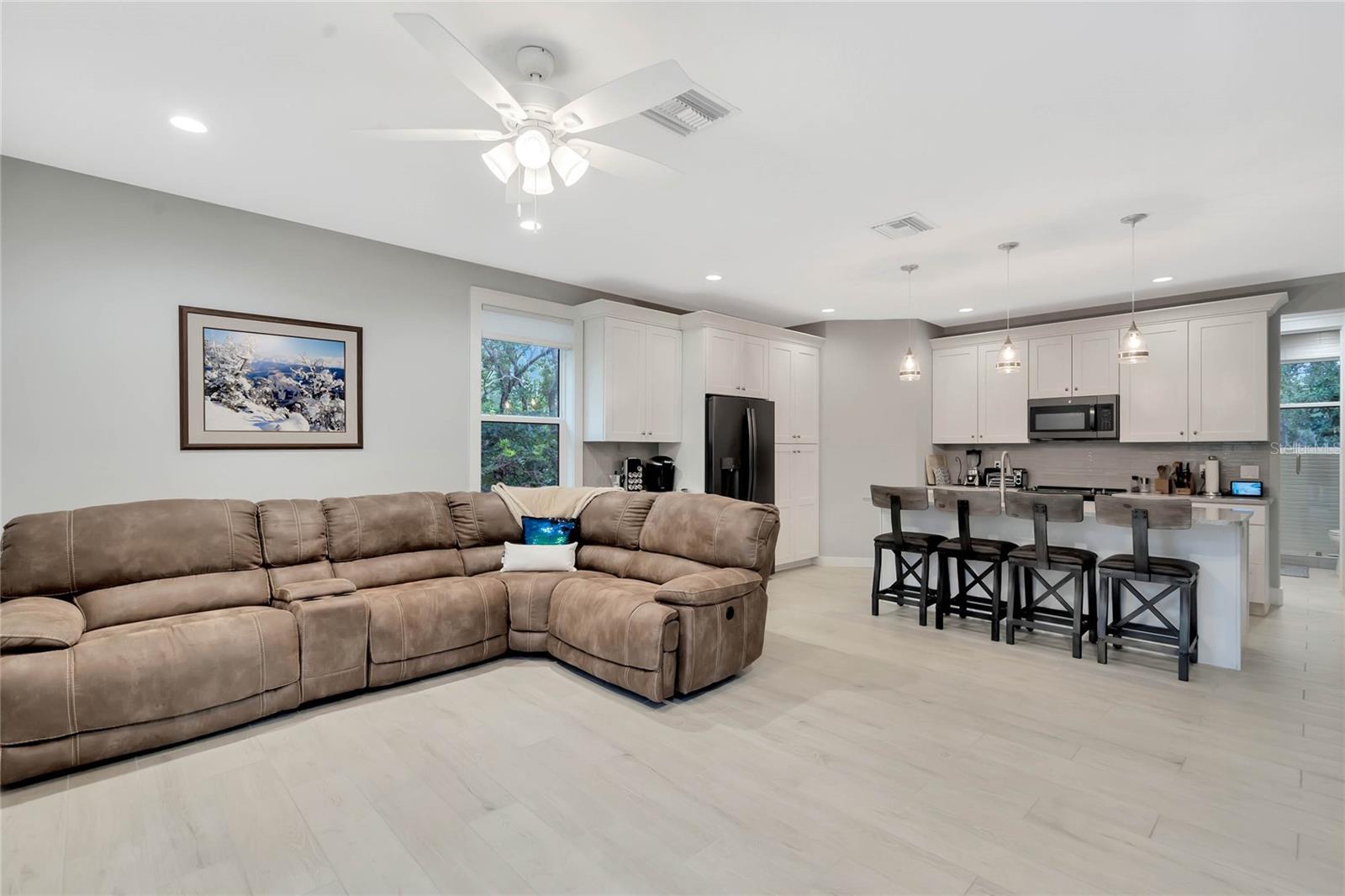 Ceiling Fans(s), Eat-in Kitchen, Elevator, High Ceilings, Kitchen/Family Room Combo, L Dining, Open Floorplan, Primary Bedroom Main Floor, Solid Surface Counters, Solid Wood Cabinets, Split Bedroom, Stone Counters, Walk-In Closet(s), Window Treatments