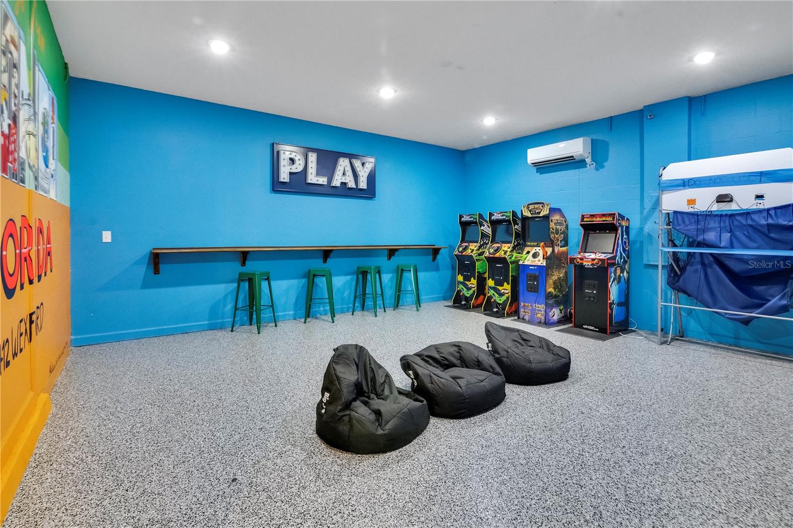 Priced to sell! Welcome to this beautifully decorated 9-bedroom, 5-bath vacation home, ideally located just a short walk to the Oasis Clubhouse and its world-class resort amenities. This property checks every box for today’s guests and owners—prime location, exceptional comfort, and outstanding rental performance. Offering fantastic curb appeal with a stone façade and tile roof, the home opens to a bright and spacious interior designed for both relaxation and entertainment. The gourmet kitchen features upgraded cabinetry, granite countertops, stainless steel appliances, and a large breakfast bar with seating for six. Multiple living areas provide generous space for families and guests to gather comfortably across both levels. The layout includes a first-floor owner’s suite along with a convenient secondary ensuite bedroom downstairs. Upstairs, the bonus room has been thoughtfully converted into a ninth bedroom (no closet), providing excellent flexibility and an ideal bedroom-to-bathroom ratio. The garage has been fully transformed into a themed game room, featuring multiple arcade game machines, a wall-mounted counter with bar-height stools, and bean bag loungers for a fun, relaxed gaming setup. A mini-split AC unit keeps the space comfortable year-round, making it an ideal hangout area for guests of all ages. Step outside to a covered lanai and an upgraded, screen-enclosed west-facing pool and spa, offering year-round sun and ample outdoor space for lounging and dining. This home is a top-performing investment with a strong rental history and an impressive lineup of future bookings that may convey at closing. Additional upgrades include: one HVAC system replaced in 2024, new water heater (2024), mini-split AC (2021), new pool pump (2024), and new pool heater (2024). Don’t miss this rare opportunity—homes this close to the clubhouse, beautifully furnished and truly turn-key, do not last long!