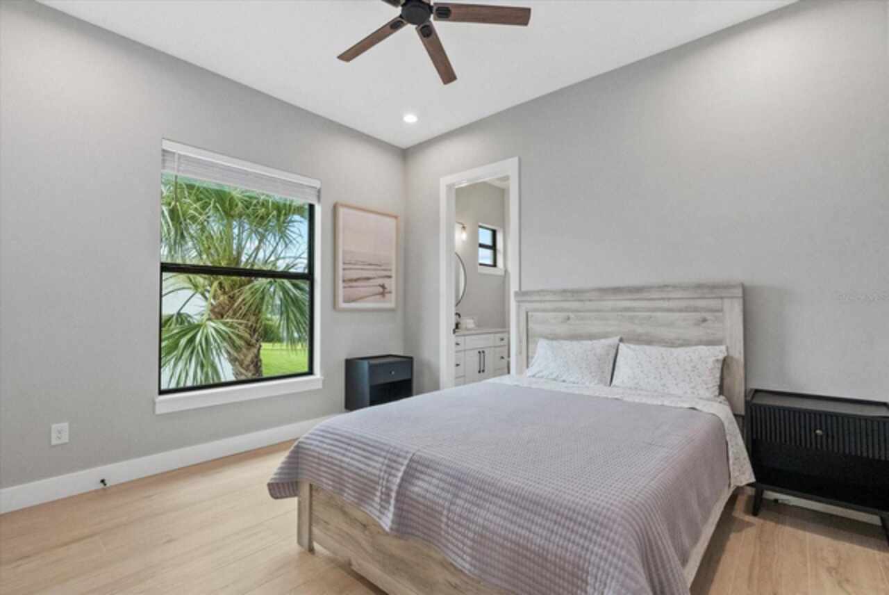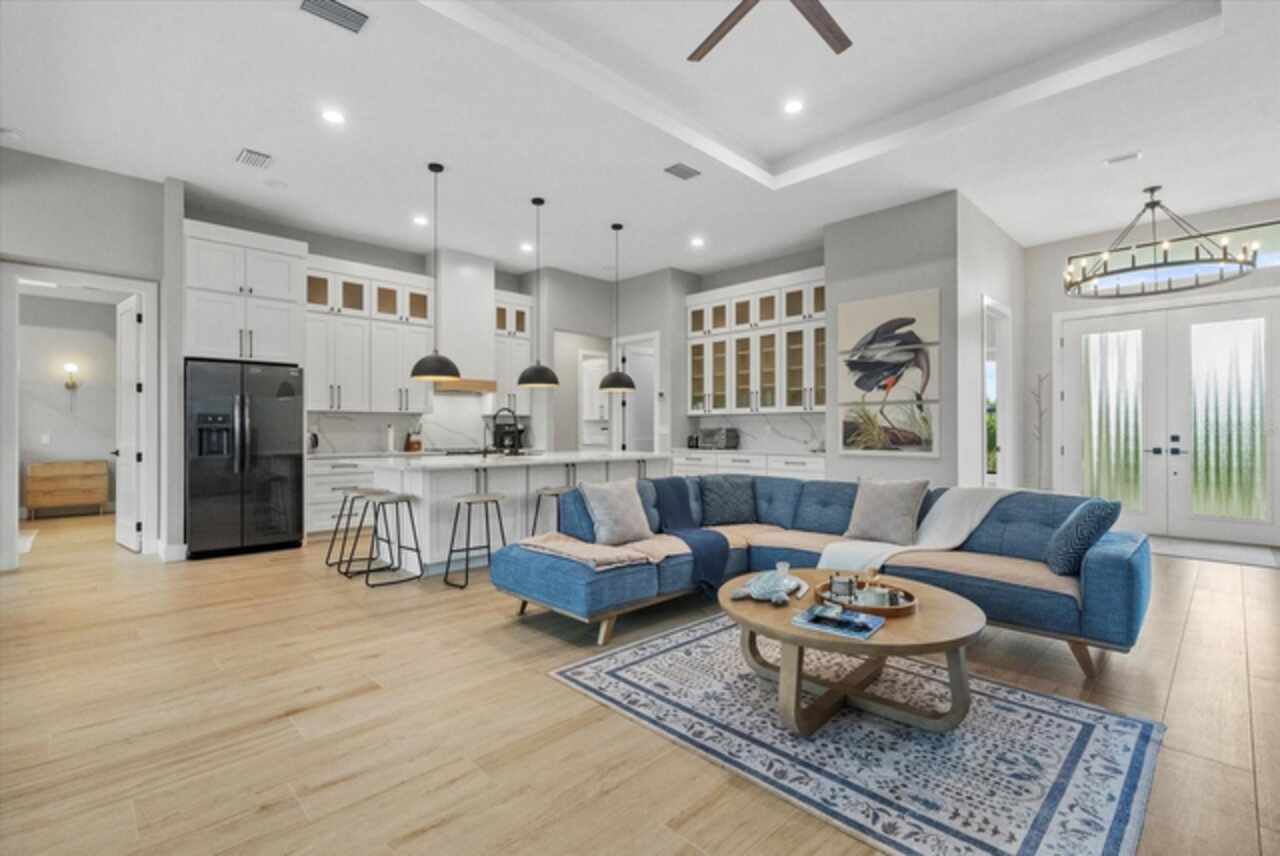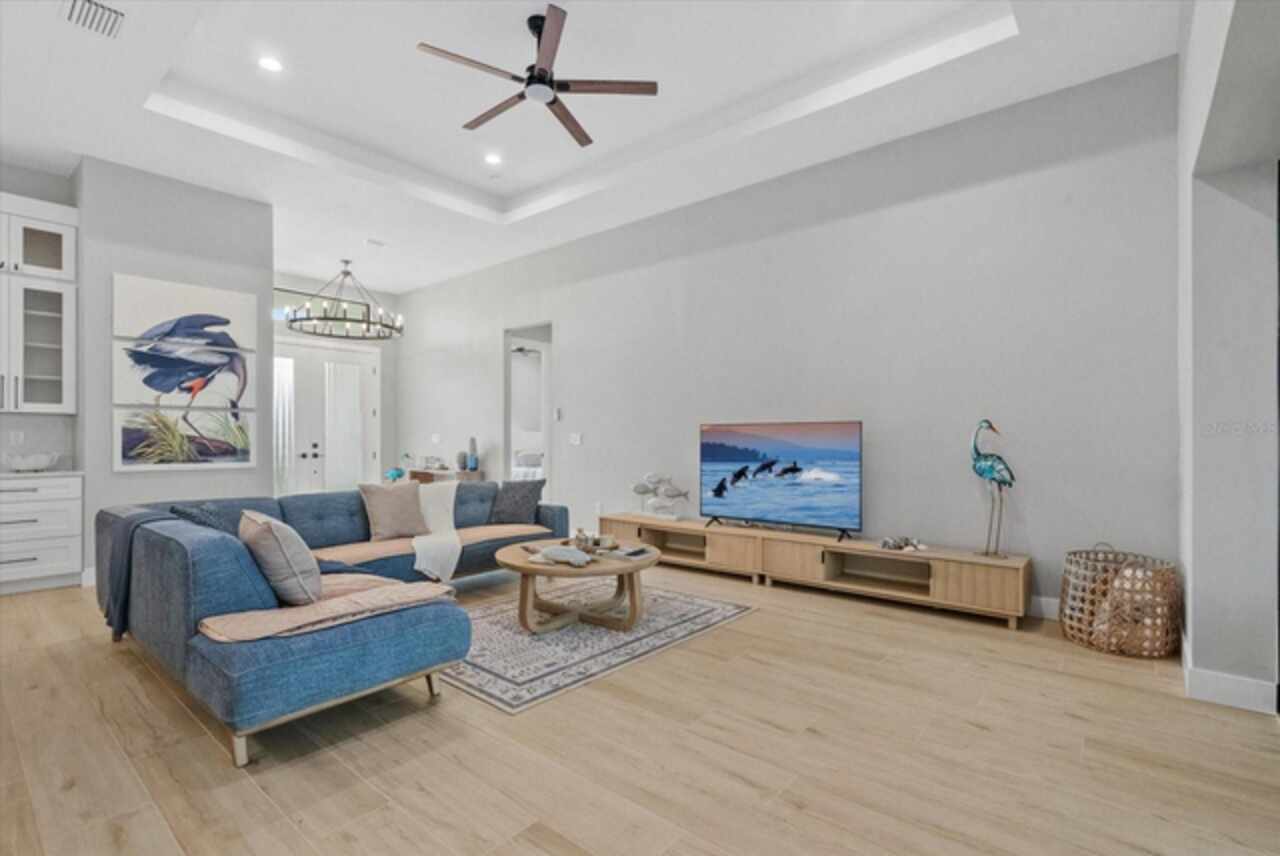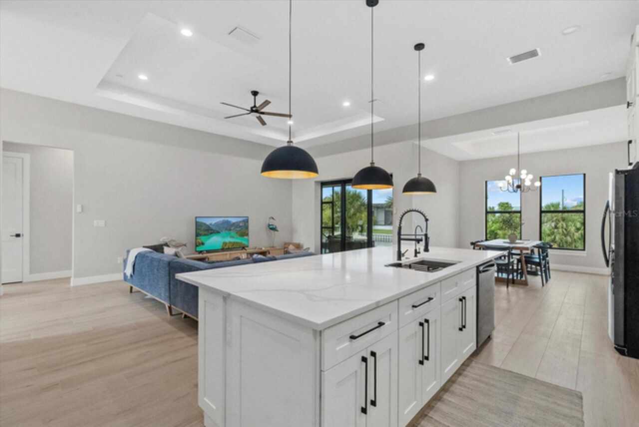 Newly built in 2024 and move-in ready! This stunning WATERFRONT home with GULF ACCESS is packed with high-end features and modern coastal charm. Offering 3 bedrooms + a den, 3 bathrooms, and 2, 166 sq ft of living space, the home is built on a 4-course stem wall for added elevation and features IMPACT WINDOWS AND DOORS throughout. A grand entrance welcomes you with modern GLASS DOUBLE DOORS, leading into a bright and airy space with SOARING CEILINGS, 8’ INTERIOR DOORS, and wood-look plank TILE flooring that flows seamlessly throughout. The chef’s kitchen is a showstopper, featuring QUARTZ COUNTERTOPS with a WATERFALL feature on the island, soft-close cabinetry, and a WALK IN PANTRY with built-in shelving—perfect for both function and style. The primary suite is a true retreat, featuring spacious walk-in closets and a spa-inspired en-suite bathroom with designer tile, a DOUBLE VANITY, and a luxurious walk-in TILED shower. The split floor plan ensures privacy, with two additional bedrooms located on the opposite side of the home—one of which includes its own private en-suite bath, ideal for guests or multigenerational living.The home also features a pavered driveway, pavered walkway all around the home, canal-fed irrigation system, and gutters all around the home for added function and curb appeal. Step outside to take in breathtaking canal views and embrace the best of Florida living—boating, fishing, kayaking, or simply relaxing in the peace and privacy of your own turnkey waterfront retreat. Nestled in the sought-after boating community of South Gulf Cove, this location offers direct access to the Gulf and is just minutes from world-class beaches, top-rated golf courses, and some of the best fishing in Southwest Florida. With an optional HOA of just $120/ year, South Gulf Cove combines relaxed coastal living with unbeatable convenience—a true hidden gem for waterfront lifestyle seekers.