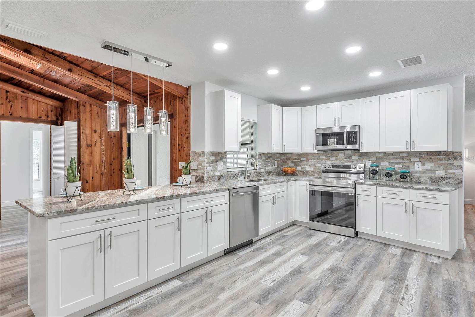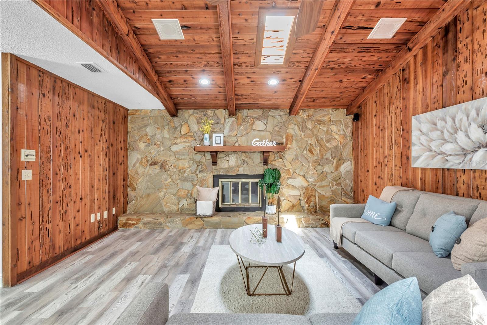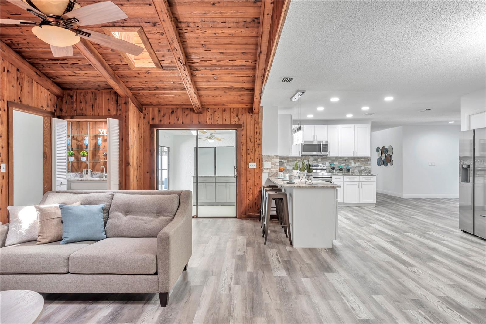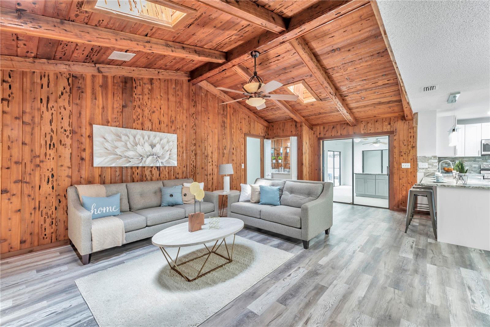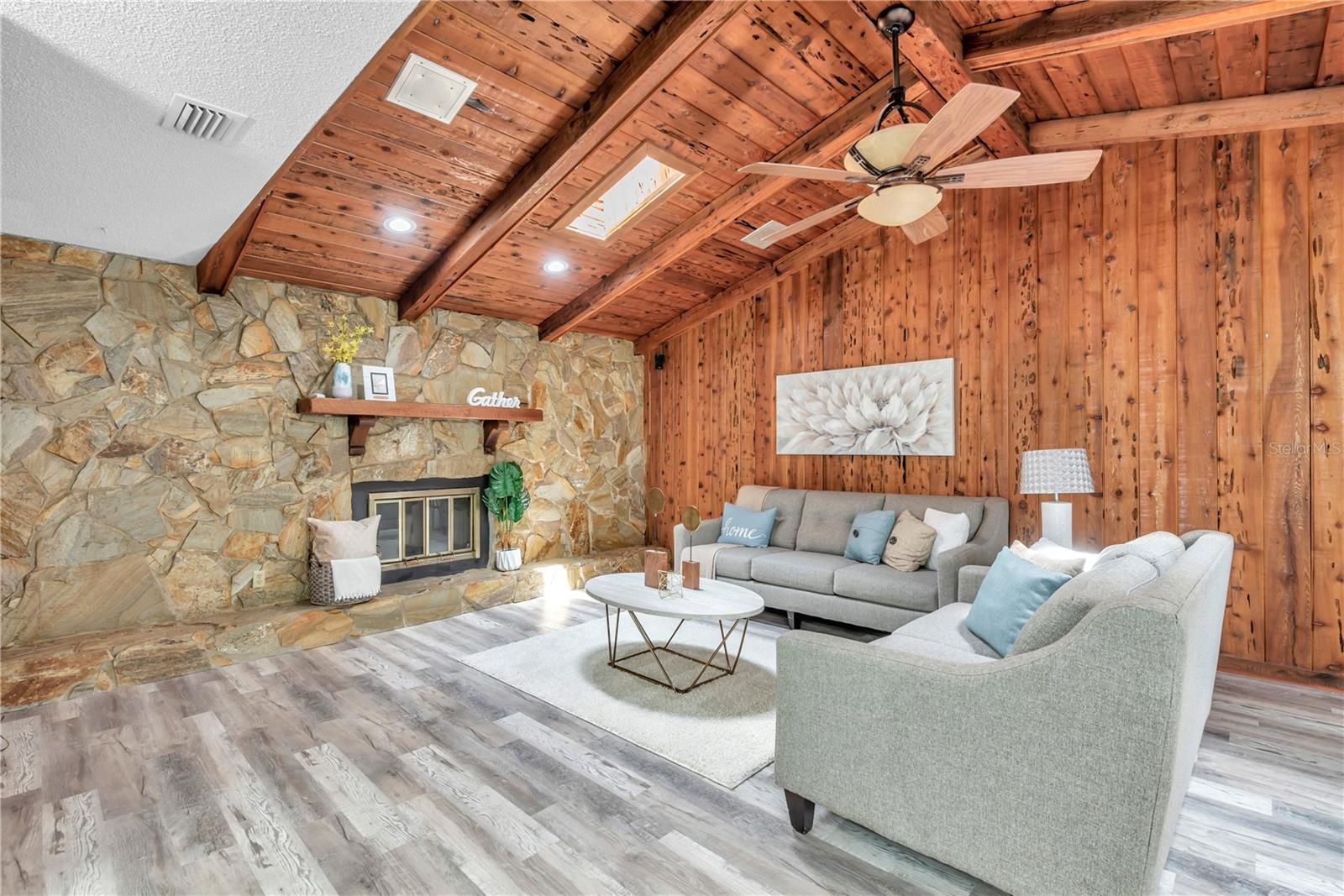 Welcome to this newly renovated BLOCK construction POOL home in the well desired Golfing community of Carrollwood Village. Arriving at the home you first notice the great curb appeal featuring beautiful landscaping. Next you'll notice the new roof (June 2022) fresh coat of paint and new hardie board siding. Once inside you'll appreciate the new flooring throughout complimenting the large split floorplan. The kitchen is also new with wood cabinets, granite, breakfast bar, decorative backsplash and appliances. Off the side of the kitchen is the great room with a wood burning fireplace, wet bar and vaulted peaked ceilings with the perfect amount of natural sunlight from the new skylights. Also located on this side of the home you will find additional bedrooms, the guest bathroom and utility room with storage. On the other side of the home you will enjoy the family room and master suite. The master suite has an inground spa easily accessed from the sliding glass door. The en suite features dual vanities, granite countertops, shower stall and walk in closet with built ins. The outdoor kitchen and pool are centrally located outside the home with access points from multiple points of the home. The outdoor kitchen is the perfect spot for outdoor grilling, entertaining or just relaxing. When its time to cool off from the Florida sun, the deep pool with diving board might be the best spot or even taking a minute to listen to the rock fountain. Not only do you get a great pool to cool off, you also get a large mostly fenced yard. The communities amazing park has exercise stations, walking/jogging paths, dog parks, splash area, pavilions, and restrooms all begging to be used. Close to Busch Gardens, Adventure Island, shopping, many restaurants, good schools, The Tampa Grand Prix as well as easy access to I-275, Veterans expressway, under 15 min to Tampa International Airport, and 30 minutes from the beaches! Schedule your showing today and book your movers as this home is move in ready.