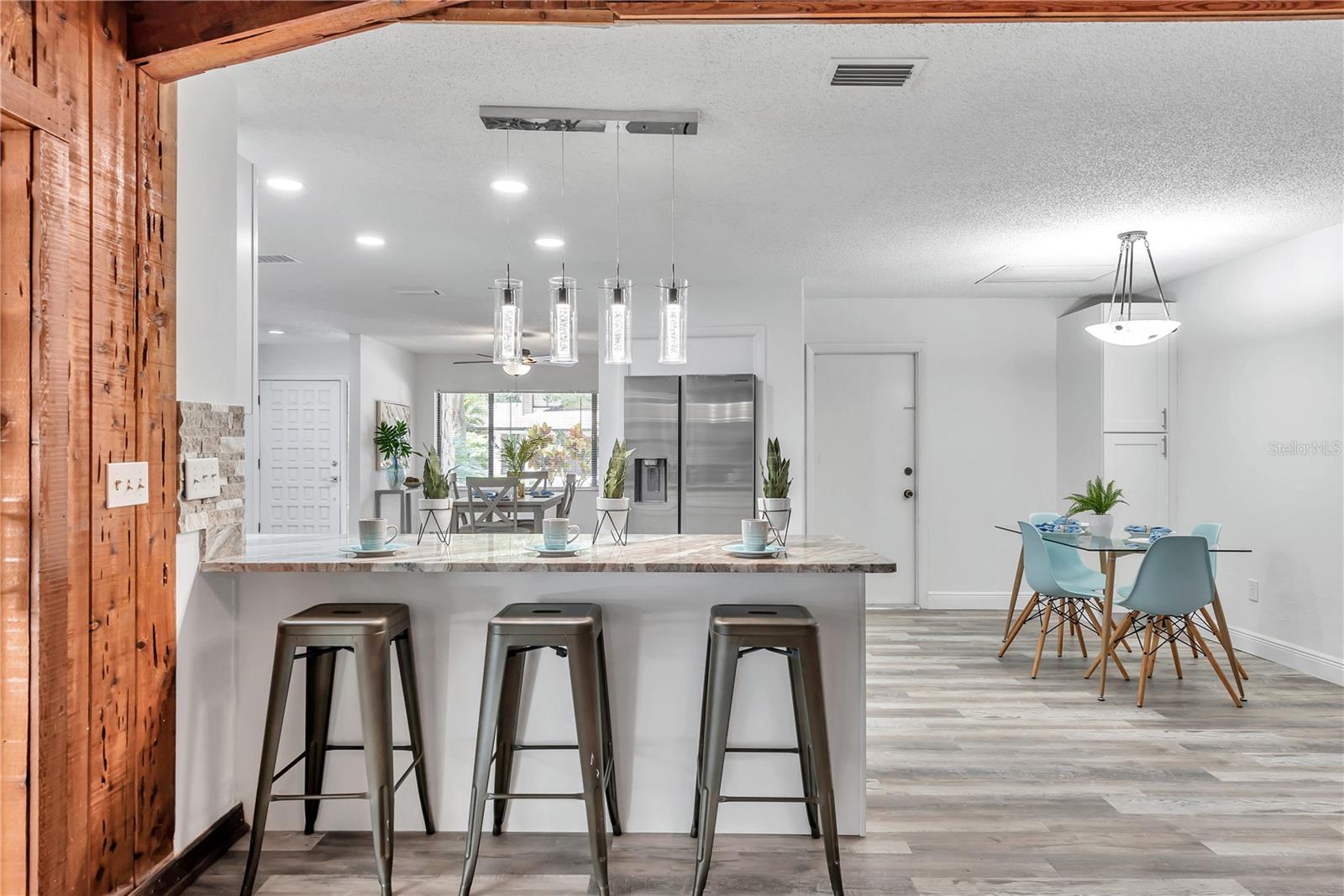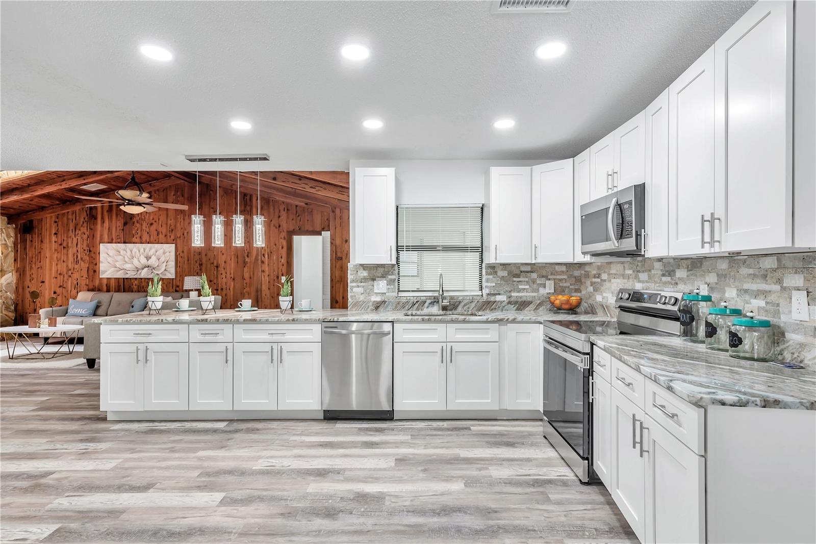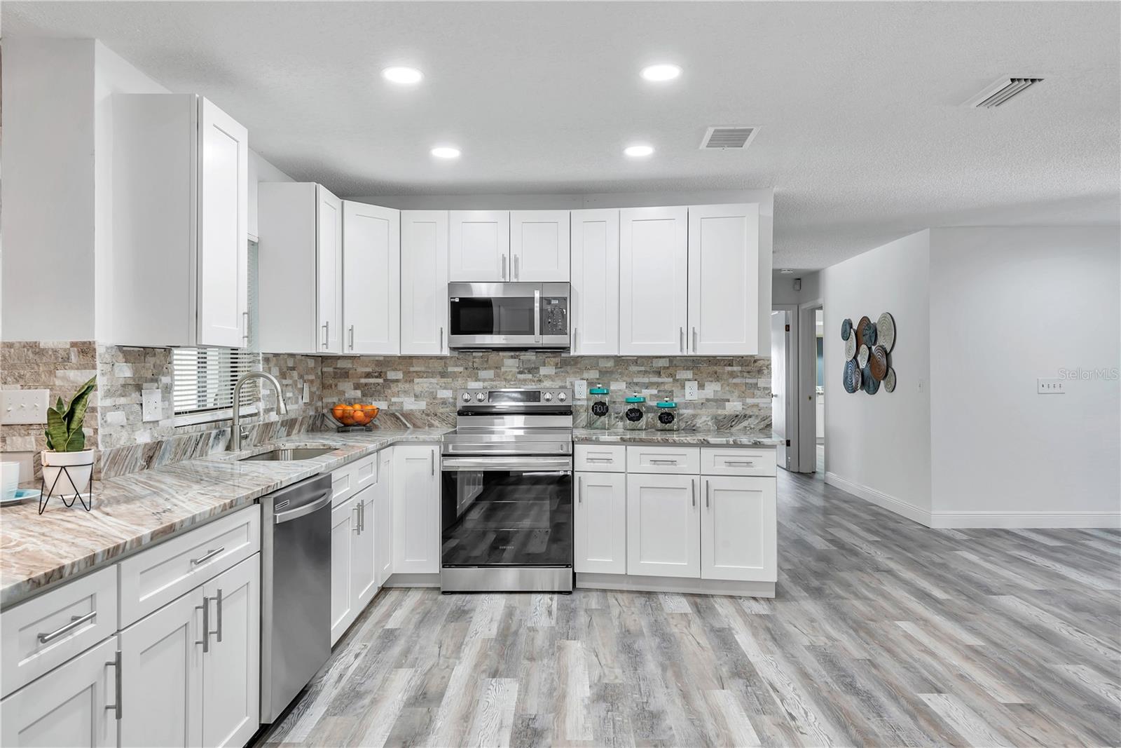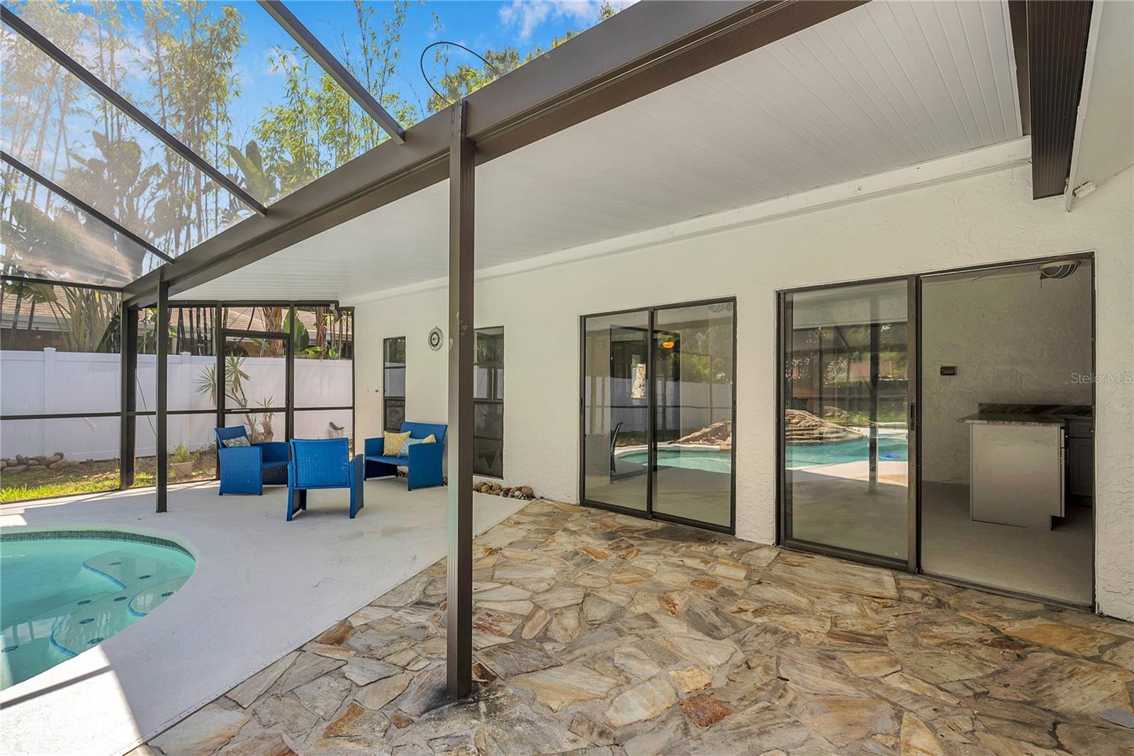 Welcome to this newly renovated BLOCK construction POOL home in the well desired Golfing community of Carrollwood Village. Arriving at the home you first notice the great curb appeal featuring beautiful landscaping. Next you'll notice the new roof (June 2022) fresh coat of paint and new hardie board siding. Once inside you'll appreciate the new flooring throughout complimenting the large split floorplan. The kitchen is also new with wood cabinets, granite, breakfast bar, decorative backsplash and appliances. Off the side of the kitchen is the great room with a wood burning fireplace, wet bar and vaulted peaked ceilings with the perfect amount of natural sunlight from the new skylights. Also located on this side of the home you will find additional bedrooms, the guest bathroom and utility room with storage. On the other side of the home you will enjoy the family room and master suite. The master suite has an inground spa easily accessed from the sliding glass door. The en suite features dual vanities, granite countertops, shower stall and walk in closet with built ins. The outdoor kitchen and pool are centrally located outside the home with access points from multiple points of the home. The outdoor kitchen is the perfect spot for outdoor grilling, entertaining or just relaxing. When its time to cool off from the Florida sun, the deep pool with diving board might be the best spot or even taking a minute to listen to the rock fountain. Not only do you get a great pool to cool off, you also get a large mostly fenced yard. The communities amazing park has exercise stations, walking/jogging paths, dog parks, splash area, pavilions, and restrooms all begging to be used. Close to Busch Gardens, Adventure Island, shopping, many restaurants, good schools, The Tampa Grand Prix as well as easy access to I-275, Veterans expressway, under 15 min to Tampa International Airport, and 30 minutes from the beaches! Schedule your showing today and book your movers as this home is move in ready.