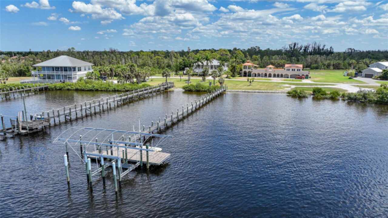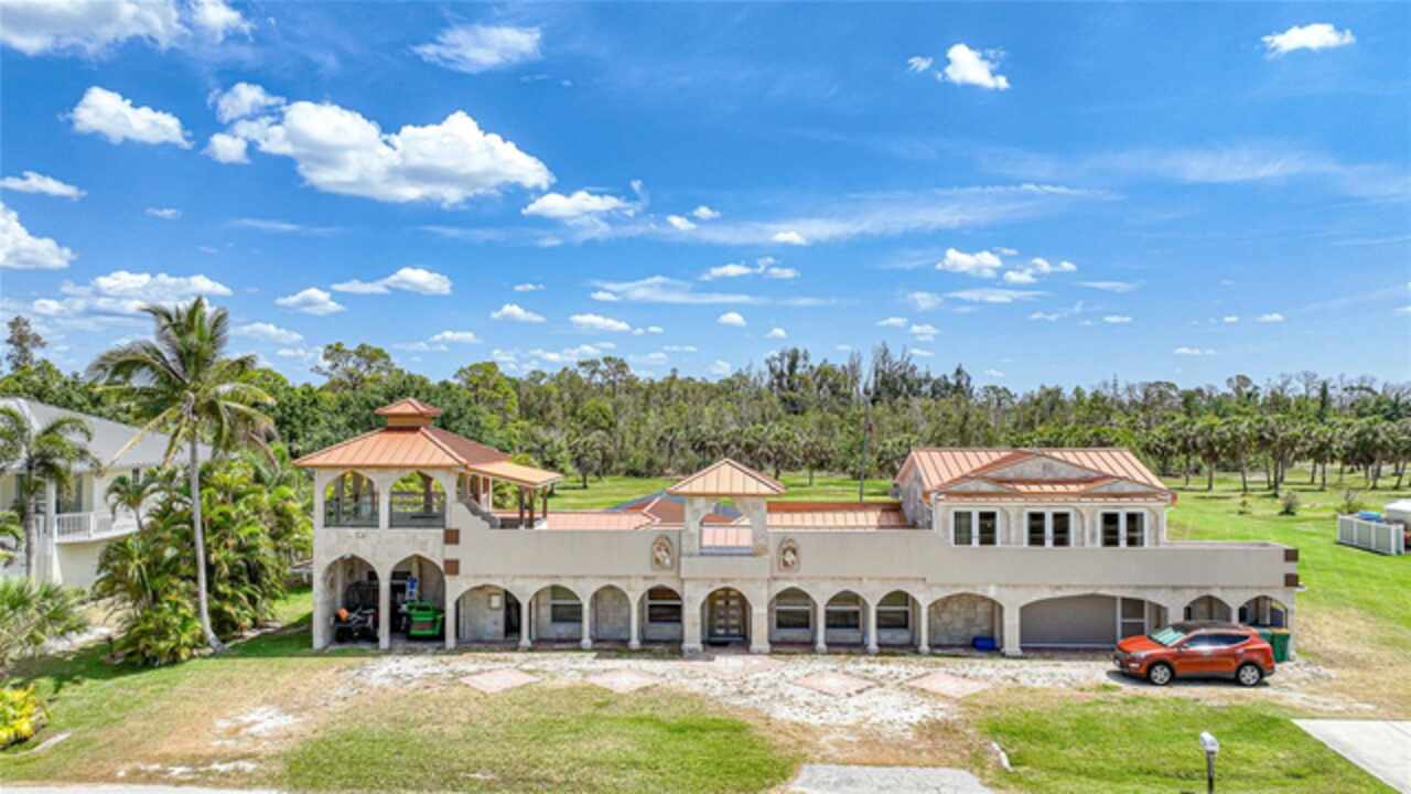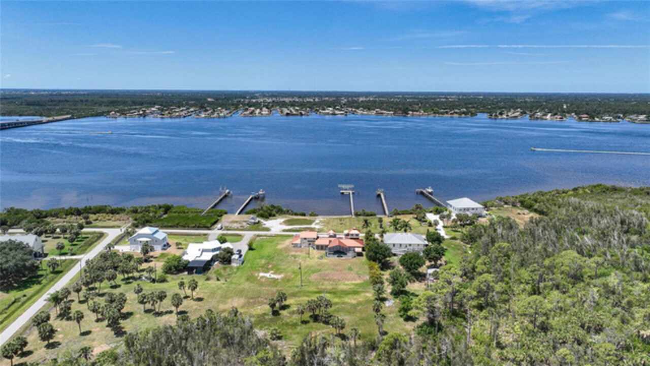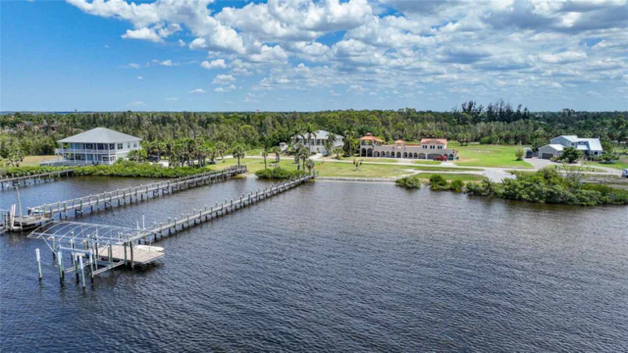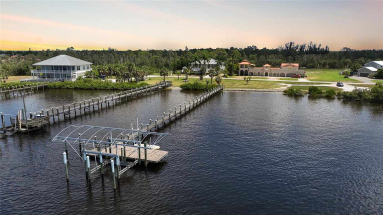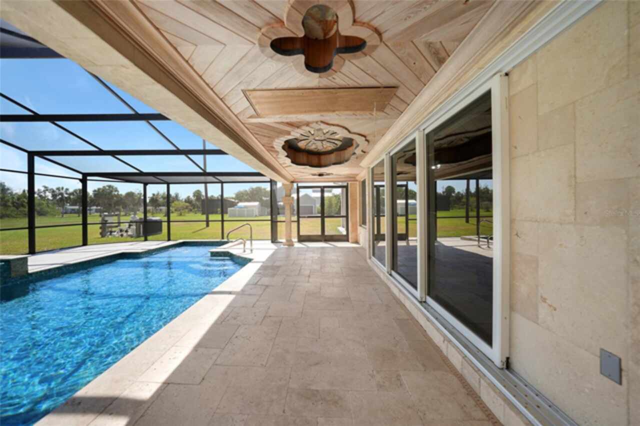 Unique is an understatement in describing this 4 bedroom, 3 bathroom Myakka River front home that its exterior and interior walls, along with floors, are Travertine. This gives the home a castle-like feel. The intricately handpainted, handcarved doors and ceiling panels brought in from various parts of the world, are found in every room in the home, along with a circular mosaic as a common theme. The kitchen is a great set-up for friends and family to cook and gather. The home is long and easily flows from each room. The 3 guest rooms and 2 bathrooms are located down a short hallway from the kitchen and family room. The caged pool and spa were added in 2019, and is conveniently accessible through sliding glass doors off of the family room. Beyond this room is an expansive more formal living room. On one end is a built in wall shelving unit that lights up. There are many nooks within the home that light up to add to the serene feel of the evening hours. Off of the formal living room is a formal dining room with wood caved table and chairs. As you move through the home, you will come to a laundry room, a door to the garage with its newly painted epoxy floor. A little way past this area is a bonus room that could be a den, or execise room. Before the laundry room is a stairway to the primary suite and upper deck that overlooks the river. There is an area off the kitchen that opens out to a staircase that also leads to the upper deck. Currently the sellers are getting quotes to fix this area. There is 200 feet of Myakka River water front and a dock that is 230 feet long with a 20, 000 lbs boat lift with a canvas cover. The El Jobean Fishing Pier is down the road. And though you can see the El Jobean bridge, you do not hear the traffic. It is nicely serene, but close to other attractions such as golf, Gulf beaches, dining and shopping, hiking, and of course boating. The home is being sold turnkey. A few art pieces may not convey. Neiher will the John Deere mower, ATV nor jet ski. They will be removed. This home is a must see to appreciate its uniqueness and location on 1.46 acres of Myakka River frontage. Paradise awaits!