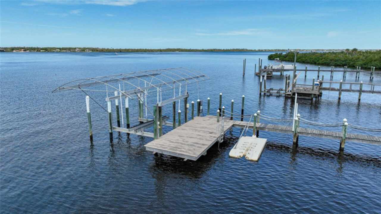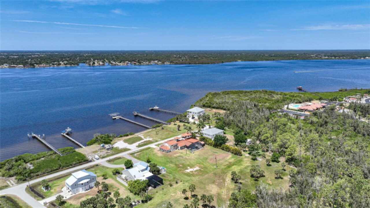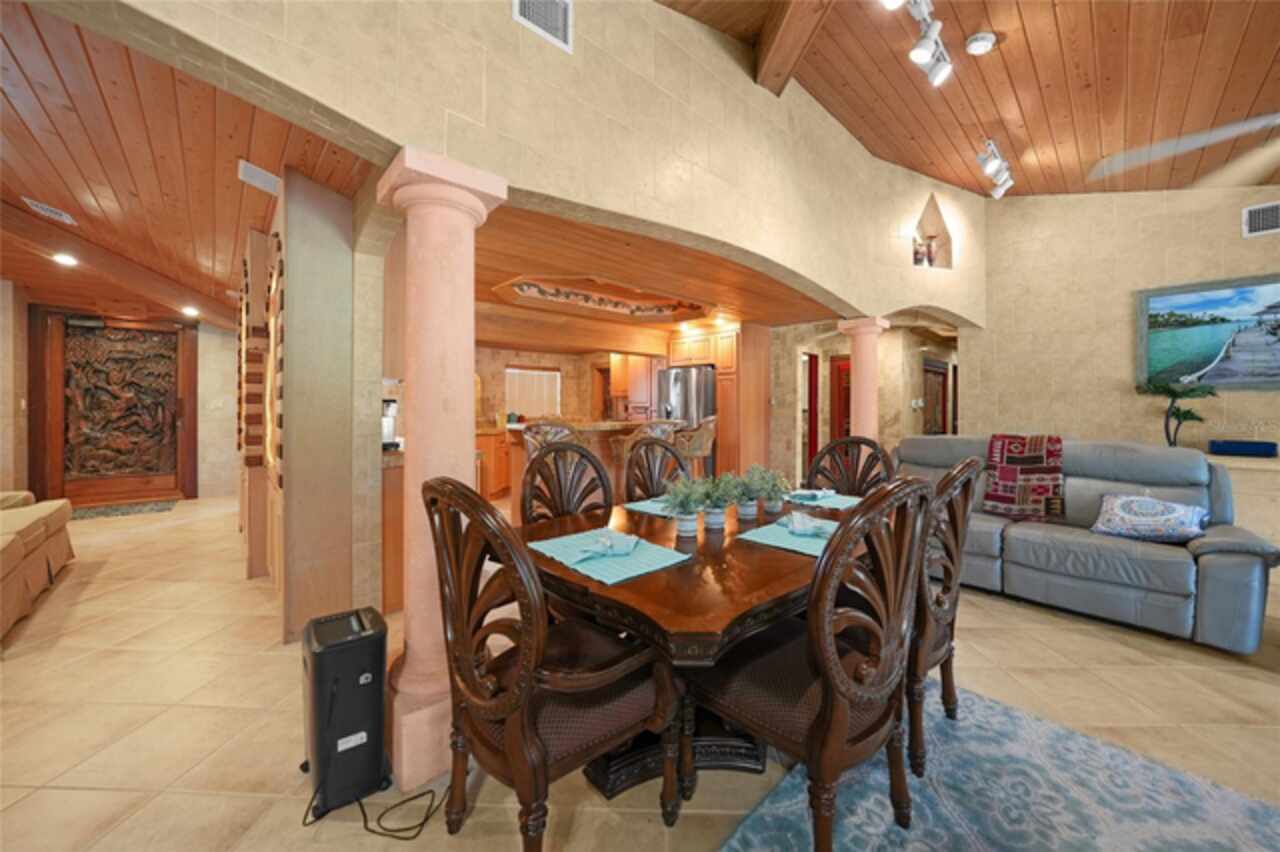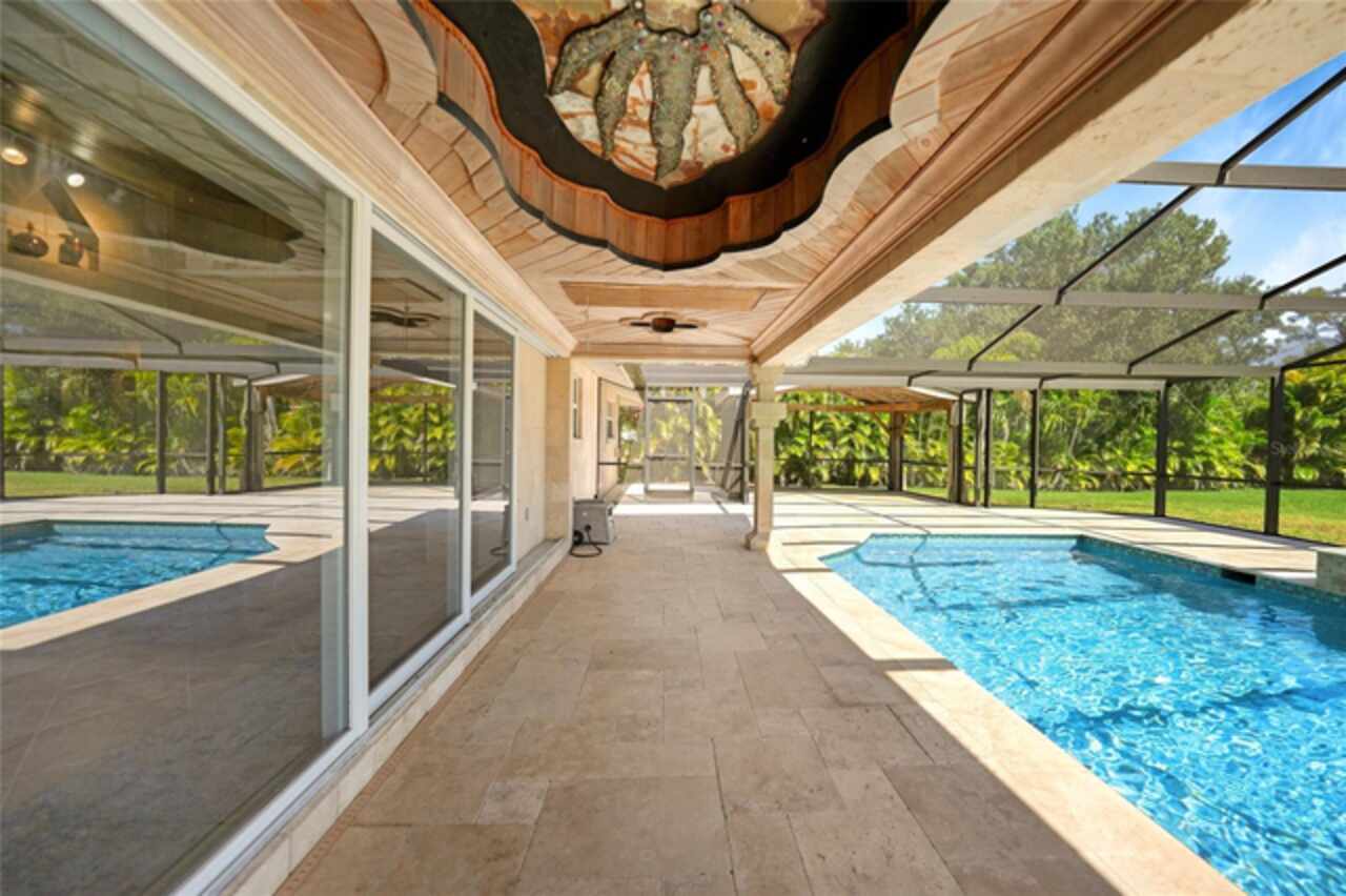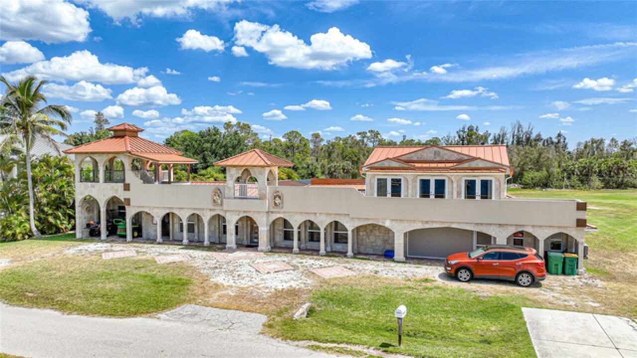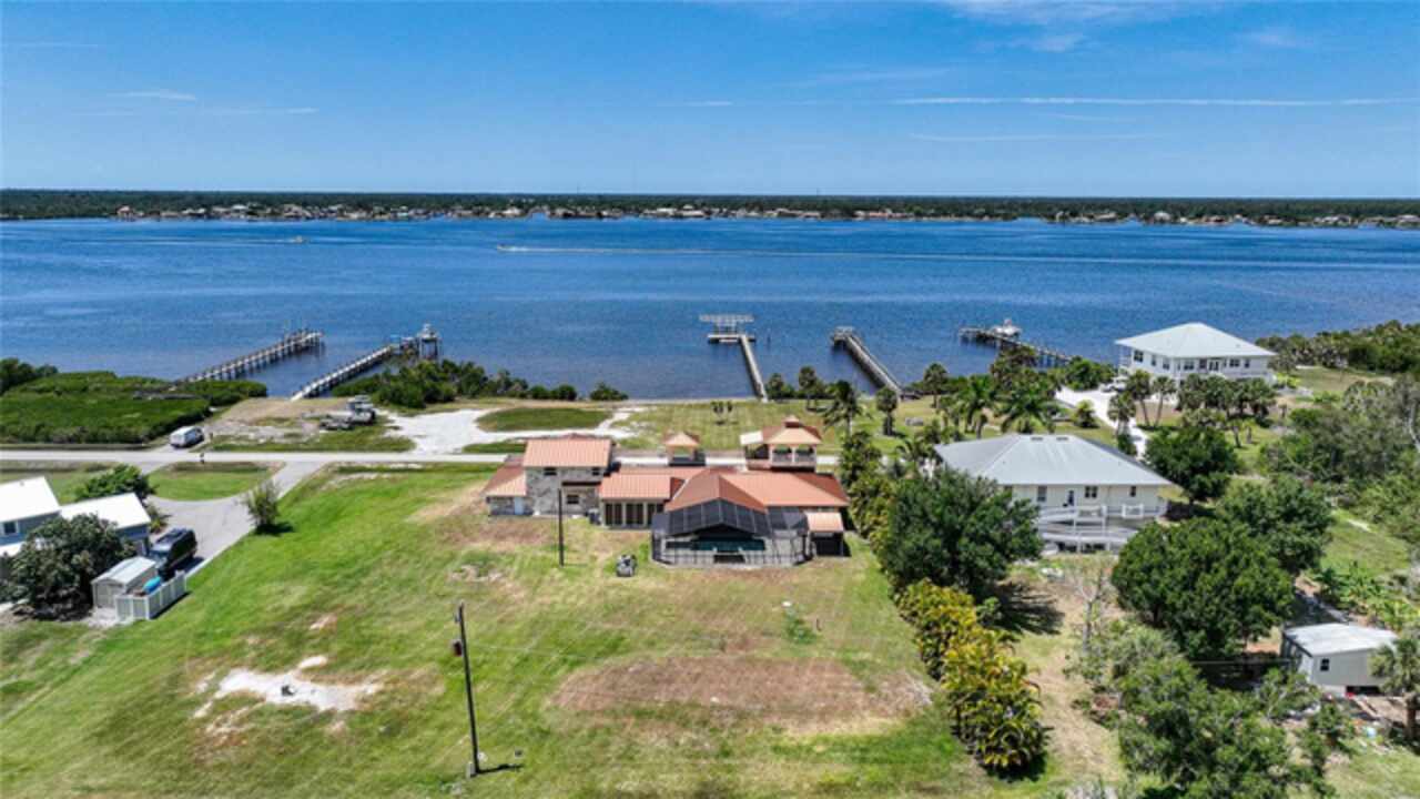 Unique is an understatement in describing this 4 bedroom, 3 bathroom Myakka River front home that its exterior and interior walls, along with floors, are Travertine. This gives the home a castle-like feel. The intricately handpainted, handcarved doors and ceiling panels brought in from various parts of the world, are found in every room in the home, along with a circular mosaic as a common theme. The kitchen is a great set-up for friends and family to cook and gather. The home is long and easily flows from each room. The 3 guest rooms and 2 bathrooms are located down a short hallway from the kitchen and family room. The caged pool and spa were added in 2019, and is conveniently accessible through sliding glass doors off of the family room. Beyond this room is an expansive more formal living room. On one end is a built in wall shelving unit that lights up. There are many nooks within the home that light up to add to the serene feel of the evening hours. Off of the formal living room is a formal dining room with wood caved table and chairs. As you move through the home, you will come to a laundry room, a door to the garage with its newly painted epoxy floor. A little way past this area is a bonus room that could be a den, or execise room. Before the laundry room is a stairway to the primary suite and upper deck that overlooks the river. There is an area off the kitchen that opens out to a staircase that also leads to the upper deck. Currently the sellers are getting quotes to fix this area. There is 200 feet of Myakka River water front and a dock that is 230 feet long with a 20, 000 lbs boat lift with a canvas cover. The El Jobean Fishing Pier is down the road. And though you can see the El Jobean bridge, you do not hear the traffic. It is nicely serene, but close to other attractions such as golf, Gulf beaches, dining and shopping, hiking, and of course boating. The home is being sold turnkey. A few art pieces may not convey. Neiher will the John Deere mower, ATV nor jet ski. They will be removed. This home is a must see to appreciate its uniqueness and location on 1.46 acres of Myakka River frontage. Paradise awaits!
