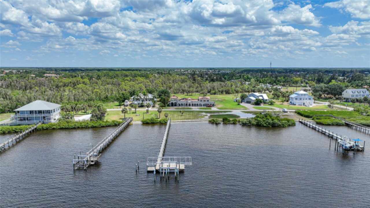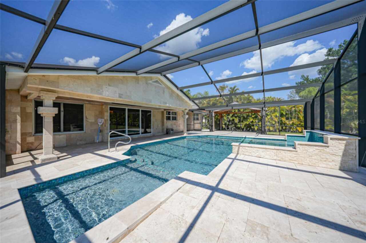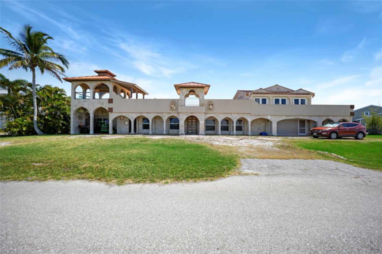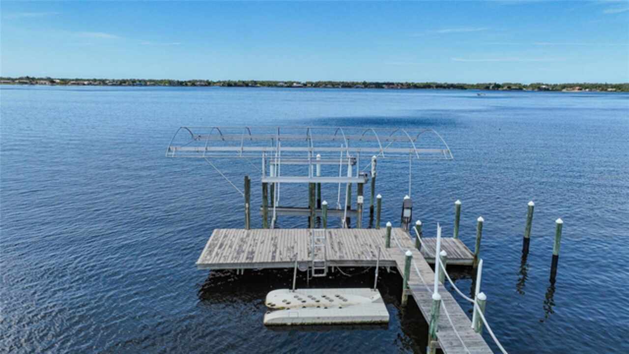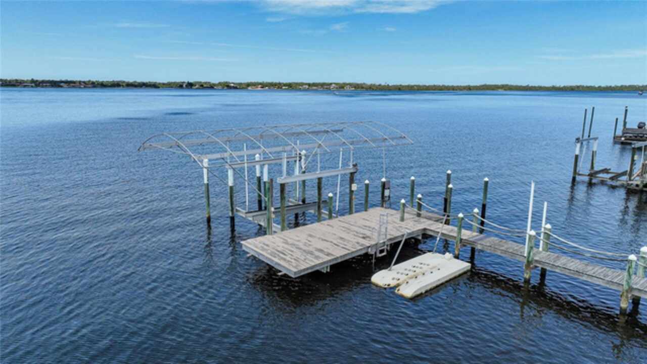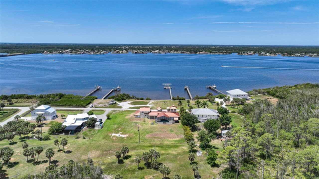 Unique is an understatement in describing this 4 bedroom, 3 bathroom Myakka River front home that its exterior and interior walls, along with floors, are Travertine. This gives the home a castle-like feel. The intricately handpainted, handcarved doors and ceiling panels brought in from various parts of the world, are found in every room in the home, along with a circular mosaic as a common theme. The kitchen is a great set-up for friends and family to cook and gather. The home is long and easily flows from each room. The 3 guest rooms and 2 bathrooms are located down a short hallway from the kitchen and family room. The caged pool and spa were added in 2019, and is conveniently accessible through sliding glass doors off of the family room. Beyond this room is an expansive more formal living room. On one end is a built in wall shelving unit that lights up. There are many nooks within the home that light up to add to the serene feel of the evening hours. Off of the formal living room is a formal dining room with wood caved table and chairs. As you move through the home, you will come to a laundry room, a door to the garage with its newly painted epoxy floor. A little way past this area is a bonus room that could be a den, or execise room. Before the laundry room is a stairway to the primary suite and upper deck that overlooks the river. There is an area off the kitchen that opens out to a staircase that also leads to the upper deck. Currently the sellers are getting quotes to fix this area. There is 200 feet of Myakka River water front and a dock that is 230 feet long with a 20, 000 lbs boat lift with a canvas cover. The El Jobean Fishing Pier is down the road. And though you can see the El Jobean bridge, you do not hear the traffic. It is nicely serene, but close to other attractions such as golf, Gulf beaches, dining and shopping, hiking, and of course boating. The home is being sold turnkey. A few art pieces may not convey. Neiher will the John Deere mower, ATV nor jet ski. They will be removed. This home is a must see to appreciate its uniqueness and location on 1.46 acres of Myakka River frontage. Paradise awaits!