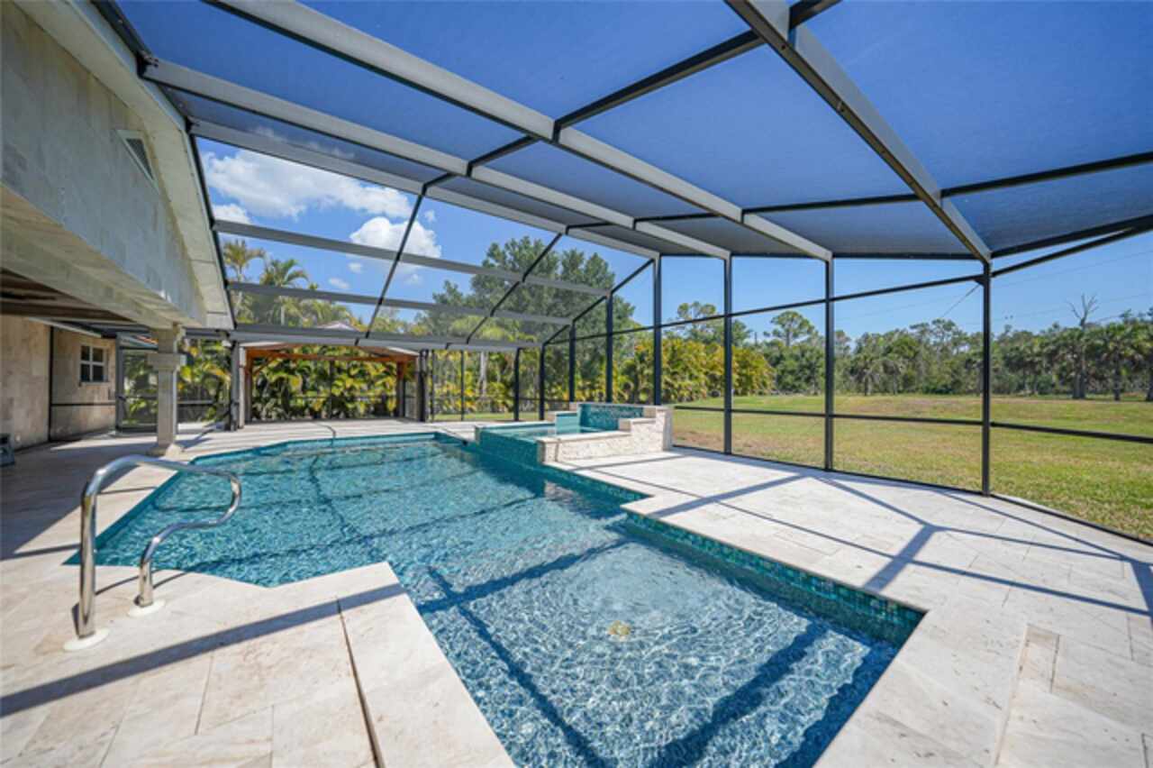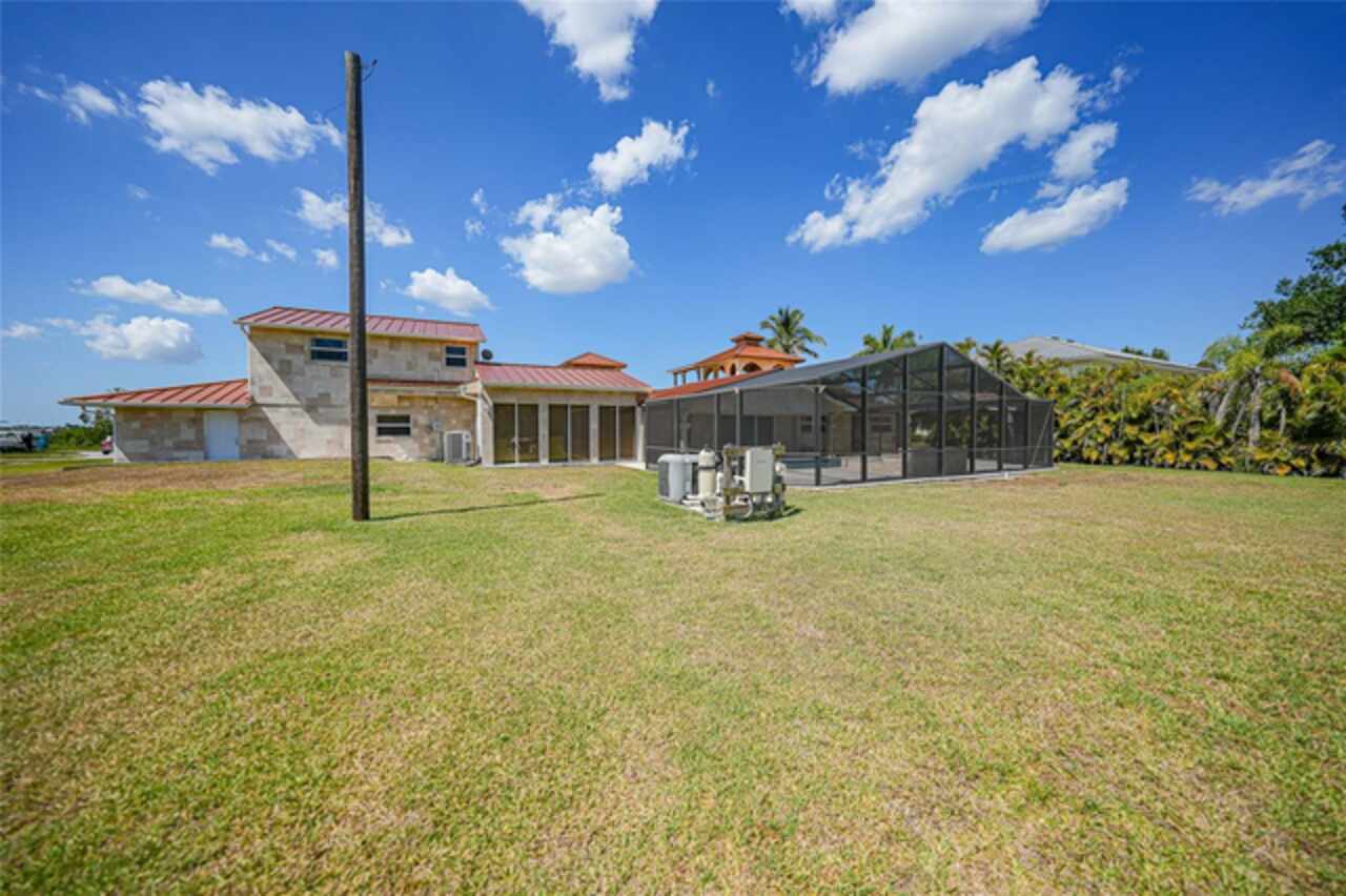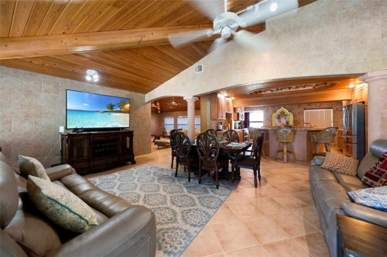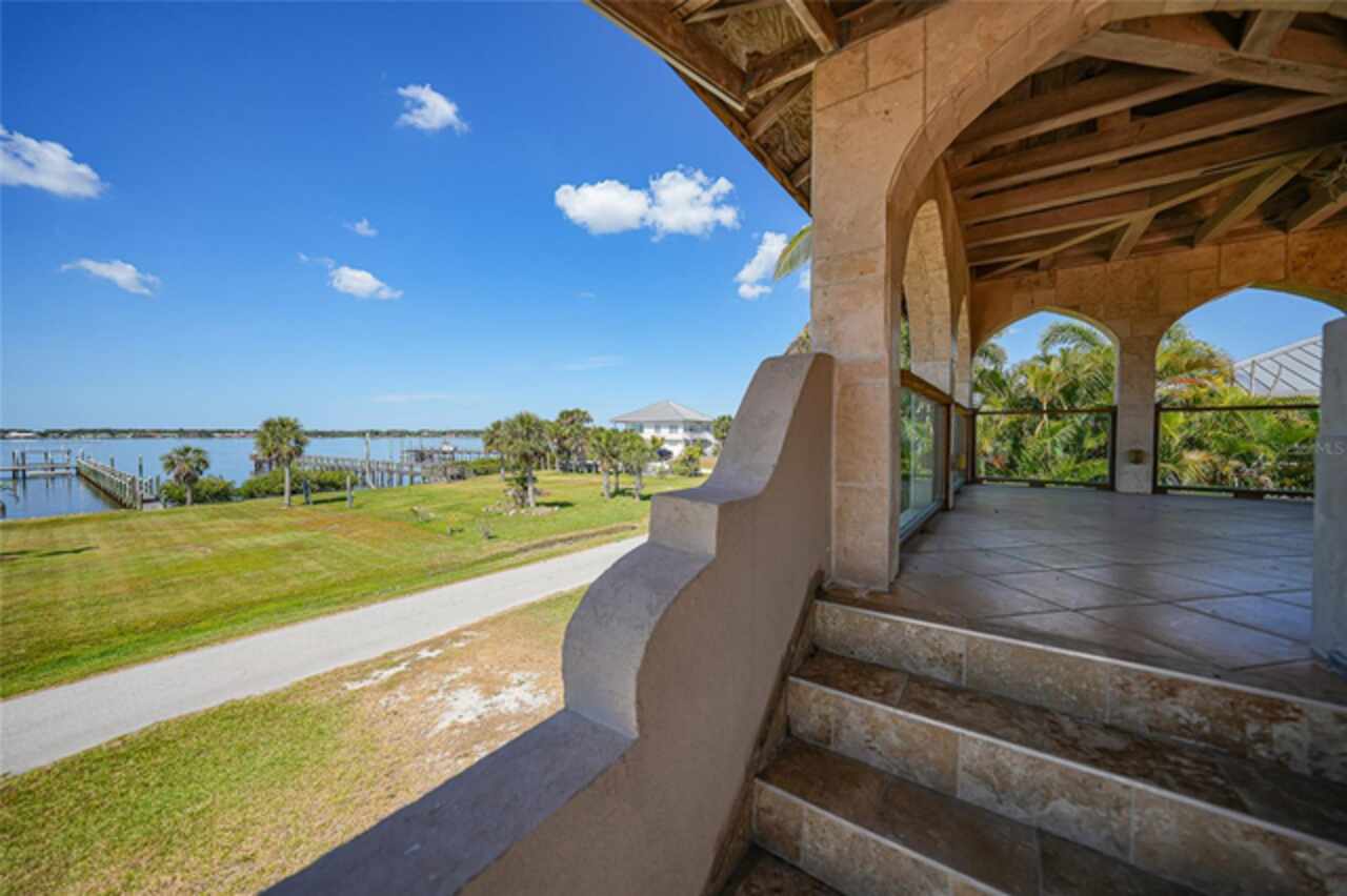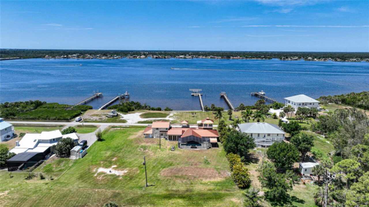 Unique is an understatement in describing this 4 bedroom, 3 bathroom Myakka River front home that its exterior and interior walls, along with floors, are Travertine. This gives the home a castle-like feel. The intricately handpainted, handcarved doors and ceiling panels brought in from various parts of the world, are found in every room in the home, along with a circular mosaic as a common theme. The kitchen is a great set-up for friends and family to cook and gather. The home is long and easily flows from each room. The 3 guest rooms and 2 bathrooms are located down a short hallway from the kitchen and family room. The caged pool and spa were added in 2019, and is conveniently accessible through sliding glass doors off of the family room. Beyond this room is an expansive more formal living room. On one end is a built in wall shelving unit that lights up. There are many nooks within the home that light up to add to the serene feel of the evening hours. Off of the formal living room is a formal dining room with wood caved table and chairs. As you move through the home, you will come to a laundry room, a door to the garage with its newly painted epoxy floor. A little way past this area is a bonus room that could be a den, or execise room. Before the laundry room is a stairway to the primary suite and upper deck that overlooks the river. There is an area off the kitchen that opens out to a staircase that also leads to the upper deck. Currently the sellers are getting quotes to fix this area. There is 200 feet of Myakka River water front and a dock that is 230 feet long with a 20, 000 lbs boat lift with a canvas cover. The El Jobean Fishing Pier is down the road. And though you can see the El Jobean bridge, you do not hear the traffic. It is nicely serene, but close to other attractions such as golf, Gulf beaches, dining and shopping, hiking, and of course boating. The home is being sold turnkey. A few art pieces may not convey. Neiher will the John Deere mower, ATV nor jet ski. They will be removed. This home is a must see to appreciate its uniqueness and location on 1.46 acres of Myakka River frontage. Paradise awaits!