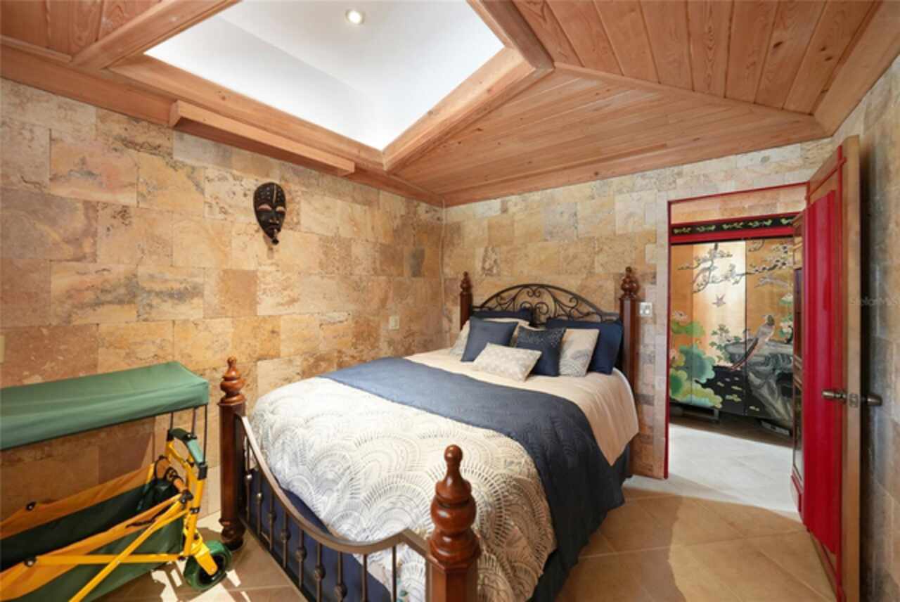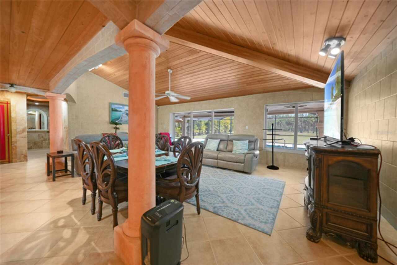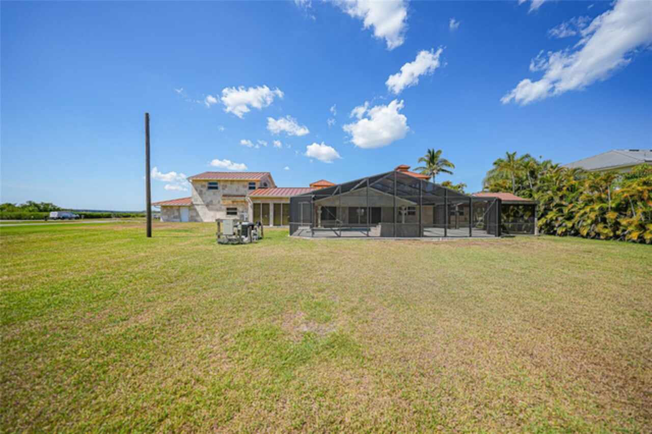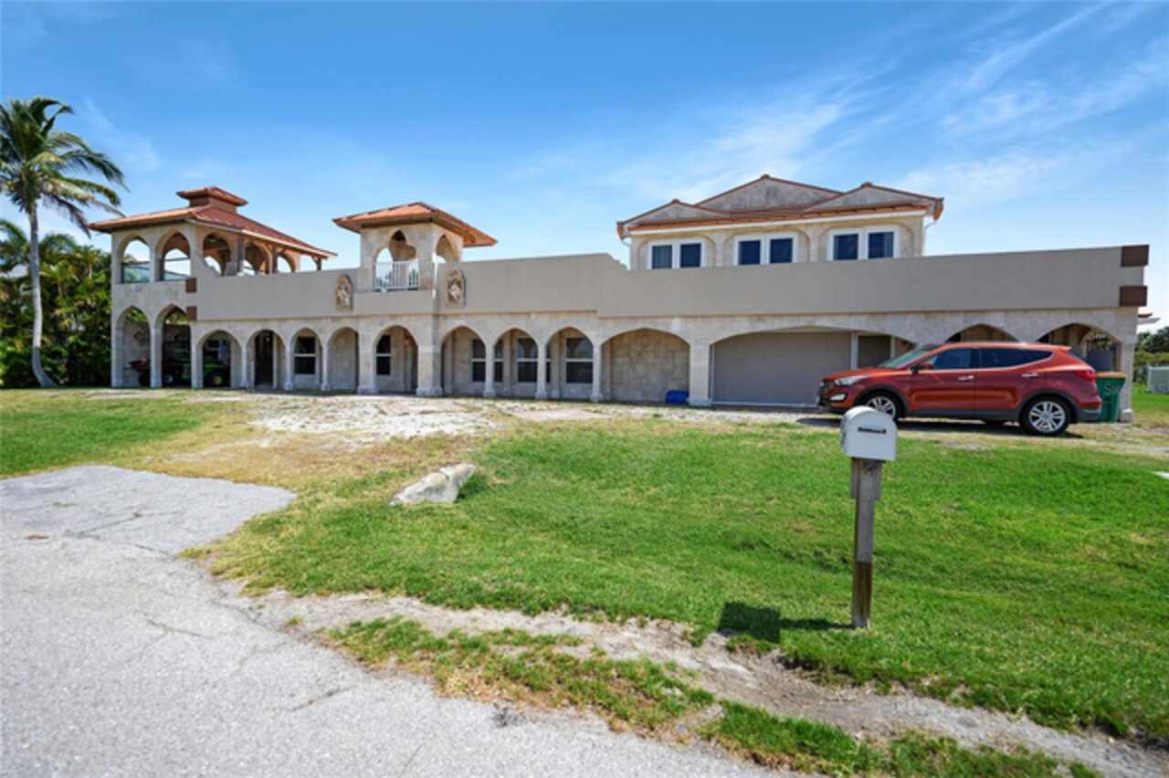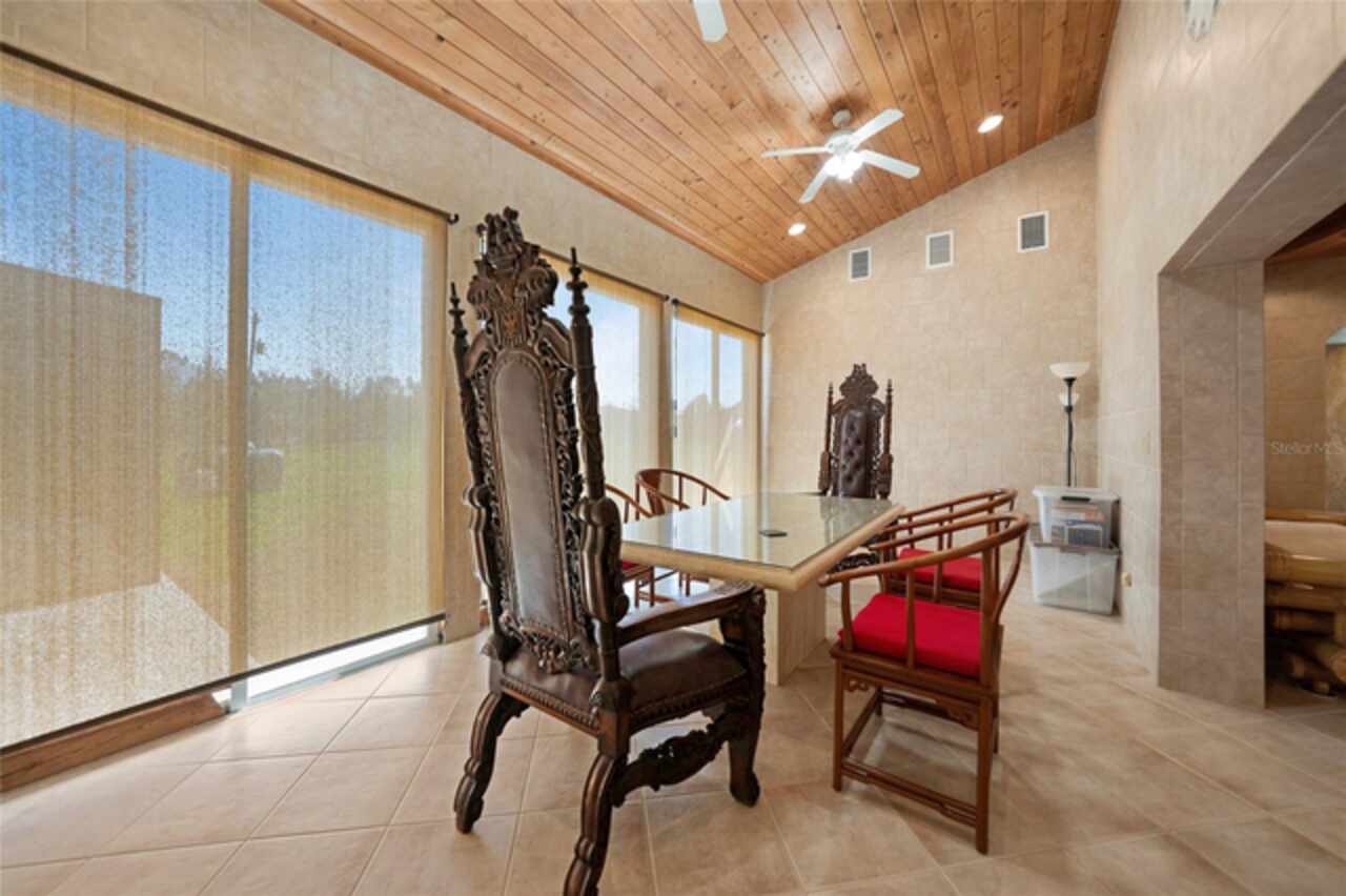Unique is an understatement in describing this 4 bedroom, 3 bathroom Myakka River front home that its exterior and interior walls, along with floors, are Travertine. This gives the home a castle-like feel. The intricately handpainted, handcarved doors and ceiling panels brought in from various parts of the world, are found in every room in the home, along with a circular mosaic as a common theme. The kitchen is a great set-up for friends and family to cook and gather. The home is long and easily flows from each room. The 3 guest rooms and 2 bathrooms are located down a short hallway from the kitchen and family room. The caged pool and spa were added in 2019, and is conveniently accessible through sliding glass doors off of the family room. Beyond this room is an expansive more formal living room. On one end is a built in wall shelving unit that lights up. There are many nooks within the home that light up to add to the serene feel of the evening hours. Off of the formal living room is a formal dining room with wood caved table and chairs. As you move through the home, you will come to a laundry room, a door to the garage with its newly painted epoxy floor. A little way past this area is a bonus room that could be a den, or execise room. Before the laundry room is a stairway to the primary suite and upper deck that overlooks the river. There is an area off the kitchen that opens out to a staircase that also leads to the upper deck. Currently the sellers are getting quotes to fix this area. There is 200 feet of Myakka River water front and a dock that is 230 feet long with a 20, 000 lbs boat lift with a canvas cover. The El Jobean Fishing Pier is down the road. And though you can see the El Jobean bridge, you do not hear the traffic. It is nicely serene, but close to other attractions such as golf, Gulf beaches, dining and shopping, hiking, and of course boating. The home is being sold turnkey. A few art pieces may not convey. Neiher will the John Deere mower, ATV nor jet ski. They will be removed. This home is a must see to appreciate its uniqueness and location on 1.46 acres of Myakka River frontage. Paradise awaits!