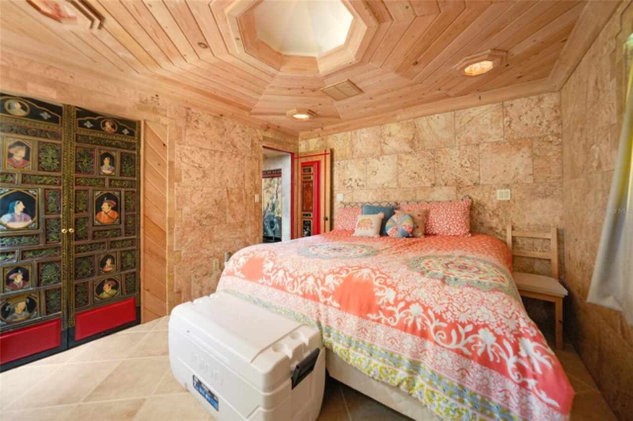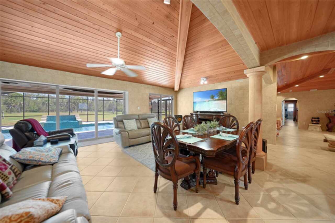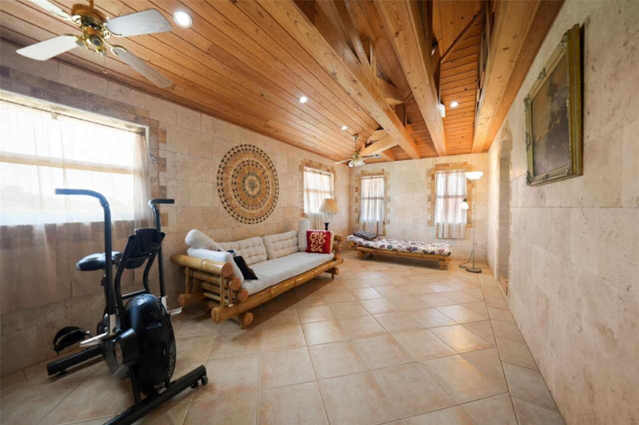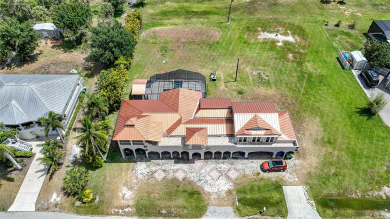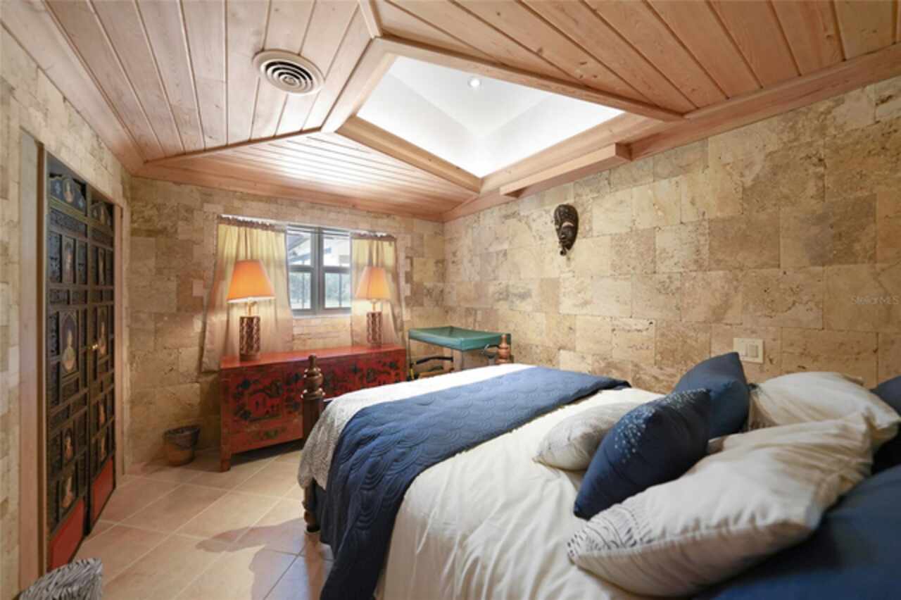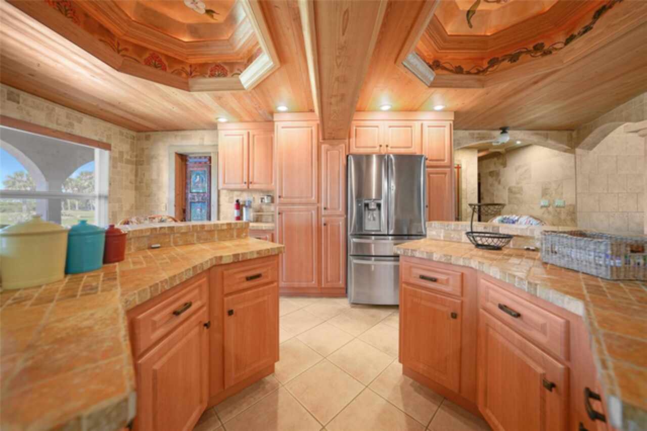 Unique is an understatement in describing this 4 bedroom, 3 bathroom Myakka River front home that its exterior and interior walls, along with floors, are Travertine. This gives the home a castle-like feel. The intricately handpainted, handcarved doors and ceiling panels brought in from various parts of the world, are found in every room in the home, along with a circular mosaic as a common theme. The kitchen is a great set-up for friends and family to cook and gather. The home is long and easily flows from each room. The 3 guest rooms and 2 bathrooms are located down a short hallway from the kitchen and family room. The caged pool and spa were added in 2019, and is conveniently accessible through sliding glass doors off of the family room. Beyond this room is an expansive more formal living room. On one end is a built in wall shelving unit that lights up. There are many nooks within the home that light up to add to the serene feel of the evening hours. Off of the formal living room is a formal dining room with wood caved table and chairs. As you move through the home, you will come to a laundry room, a door to the garage with its newly painted epoxy floor. A little way past this area is a bonus room that could be a den, or execise room. Before the laundry room is a stairway to the primary suite and upper deck that overlooks the river. There is an area off the kitchen that opens out to a staircase that also leads to the upper deck. Currently the sellers are getting quotes to fix this area. There is 200 feet of Myakka River water front and a dock that is 230 feet long with a 20, 000 lbs boat lift with a canvas cover. The El Jobean Fishing Pier is down the road. And though you can see the El Jobean bridge, you do not hear the traffic. It is nicely serene, but close to other attractions such as golf, Gulf beaches, dining and shopping, hiking, and of course boating. The home is being sold turnkey. A few art pieces may not convey. Neiher will the John Deere mower, ATV nor jet ski. They will be removed. This home is a must see to appreciate its uniqueness and location on 1.46 acres of Myakka River frontage. Paradise awaits!