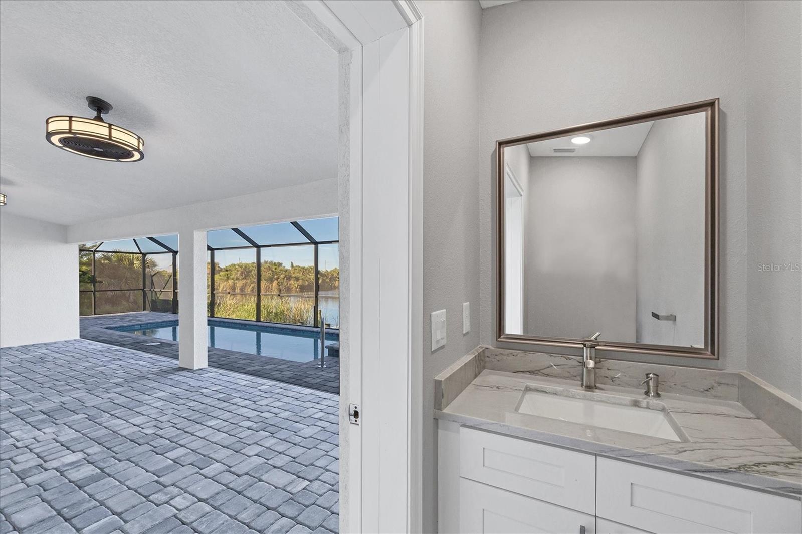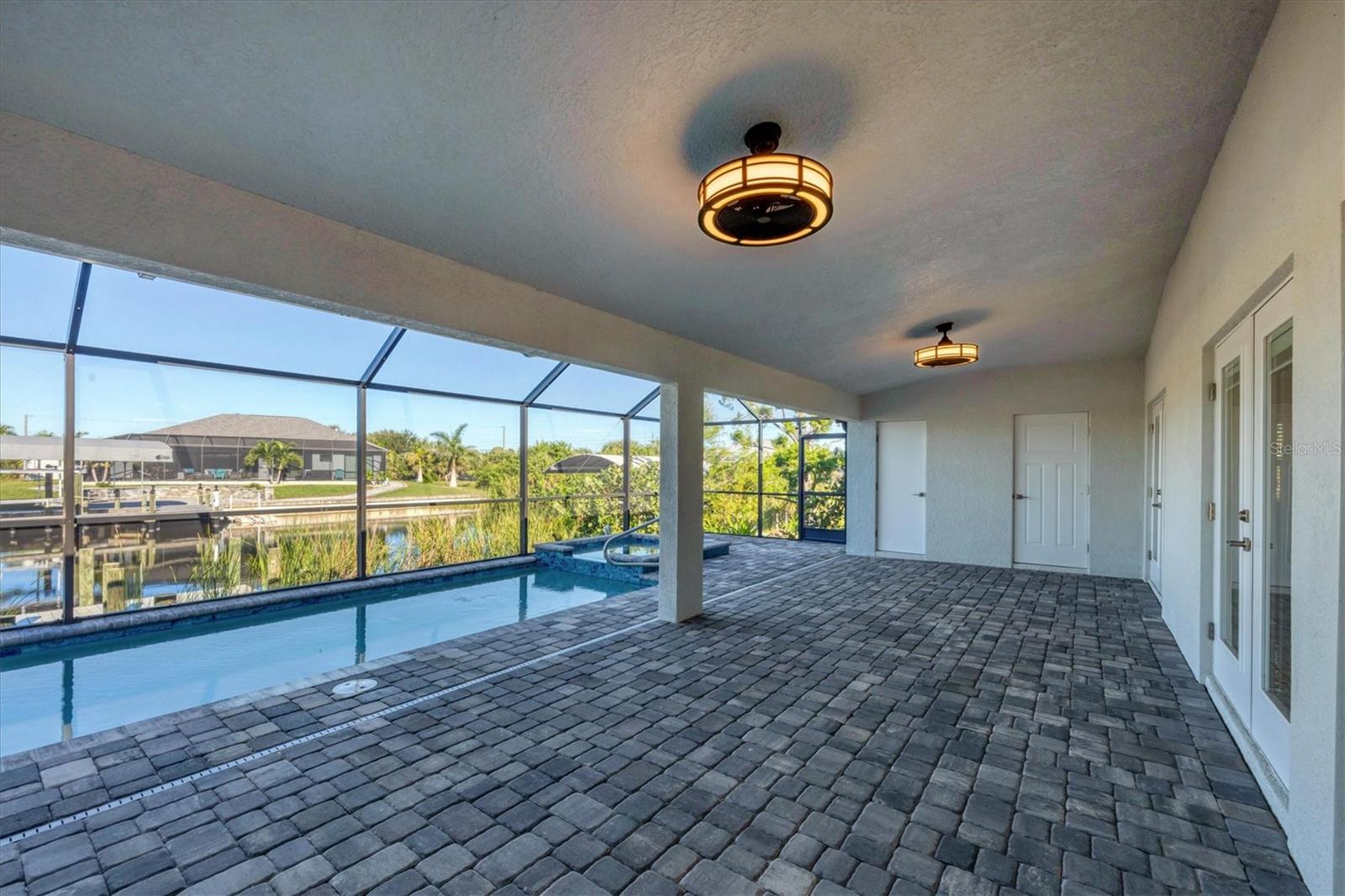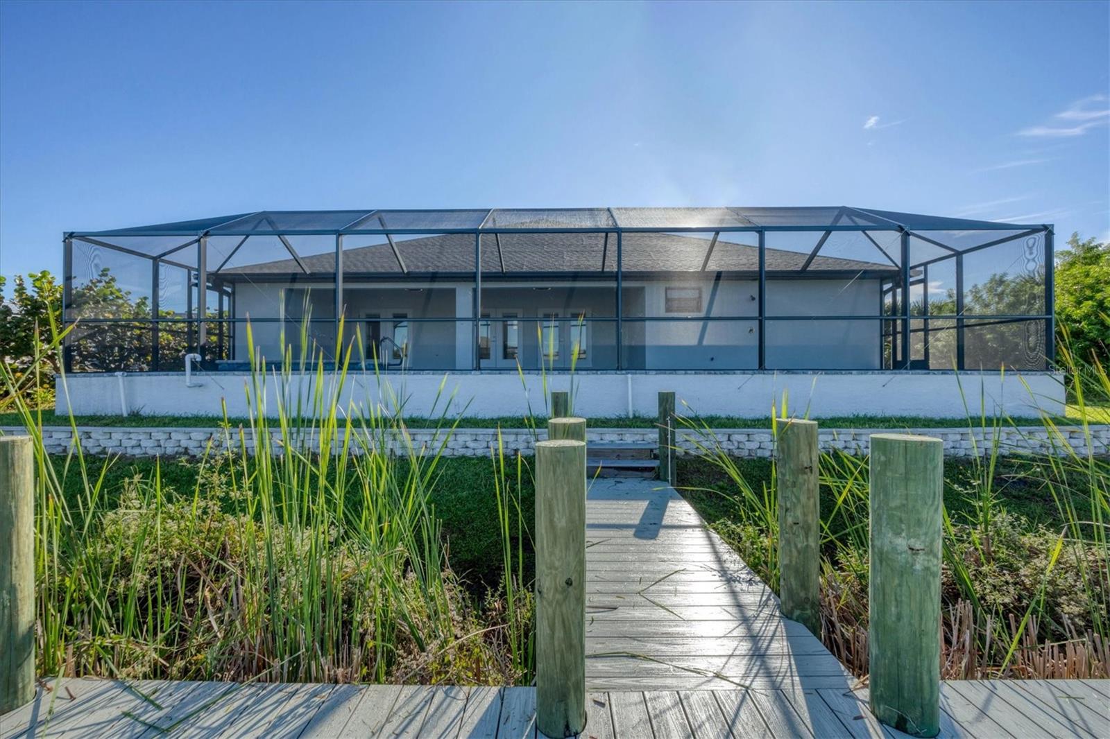 Brand-New Spectacular Waterfront Home with Sailboat Access! This stunning 3-bedroom, 2.5-bath home with a den (or optional 4th bedroom/nursery) delivers the ultimate Florida lifestyle with no-bridge access to Interceptor Lagoon, the Myakka River, and the Gulf of Mexico. The open great room design features tray ceilings in the living, dining, and primary suite, recessed lighting inside and out, 24x48” porcelain tile, impact-rated low-E windows and doors, and plantation shutters. The chef’s kitchen is a showpiece with a waterfall island with seating, granite counters, farmhouse sink, slow-close drawers and doors, glass mosaic backsplash, and above/below cabinet lighting. The primary suite includes dual walk-in closets, a spa-inspired bath with dual sinks, walk-in shower with shampoo shelf, while the secondary bath features a relaxing tub. Bedrooms 2 and 3 also have custom walk-in closets. Outdoor living is exceptional with a caged pool and smart spa, paver-wrapped deck, 30x12 covered lanai with dual fans and lights, outdoor shower, half pool bath, and a security fence around the screen enclosure. A triple-wide paver driveway leads to a 3-car garage with epoxy flooring. Additional highlights include Swiss Madison toilets, French doors with inset blinds, large ceiling fans, and a convenient laundry storage area. Dock is place, ready for your boat! Move-in ready and packed with luxury upgrades, this brand-new home is a boater’s paradise—schedule your private showing today!
