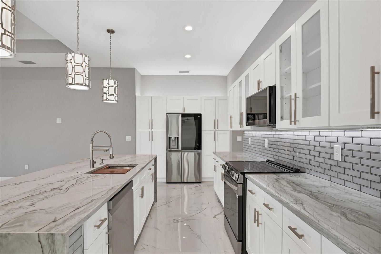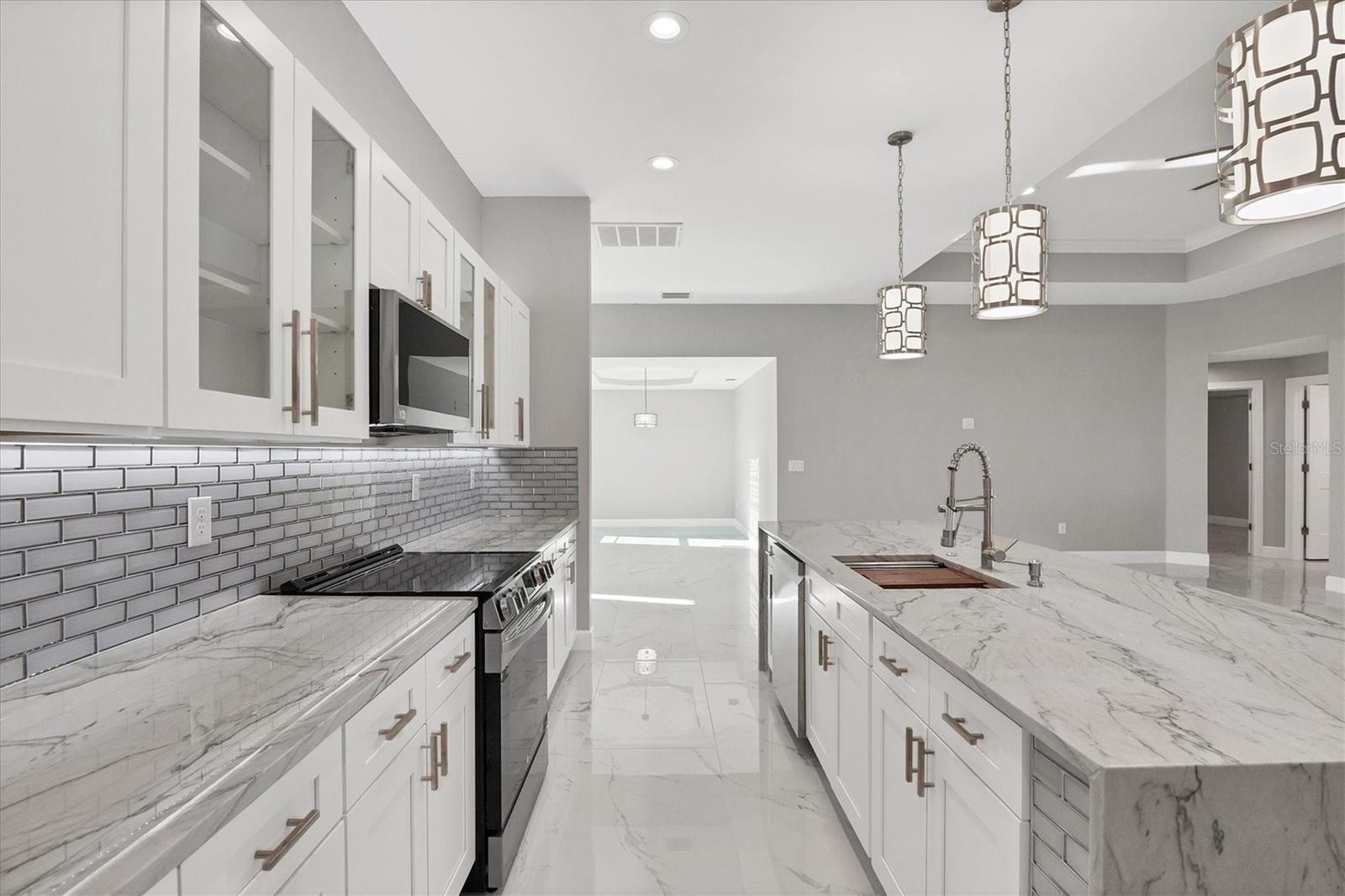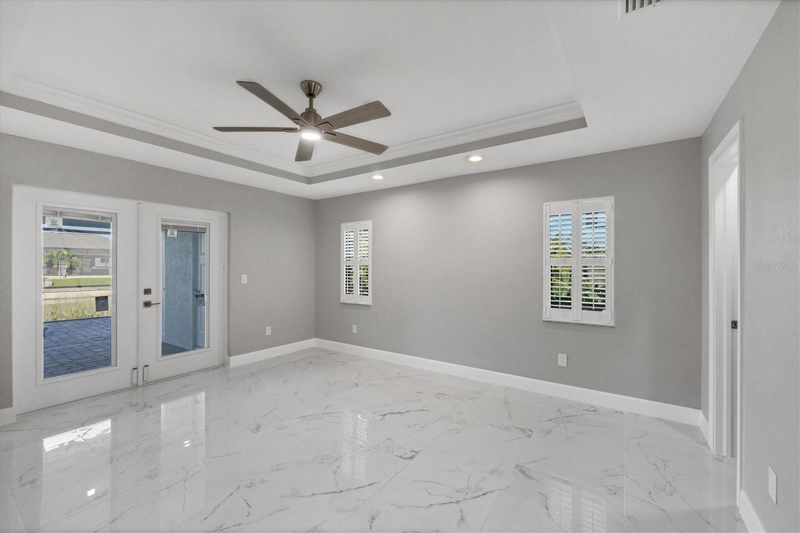 Brand-New Spectacular Waterfront Home with Sailboat Access! This stunning 3-bedroom, 2.5-bath home with a den (or optional 4th bedroom/nursery) delivers the ultimate Florida lifestyle with no-bridge access to Interceptor Lagoon, the Myakka River, and the Gulf of Mexico. The open great room design features tray ceilings in the living, dining, and primary suite, recessed lighting inside and out, 24x48” porcelain tile, impact-rated low-E windows and doors, and plantation shutters. The chef’s kitchen is a showpiece with a waterfall island with seating, granite counters, farmhouse sink, slow-close drawers and doors, glass mosaic backsplash, and above/below cabinet lighting. The primary suite includes dual walk-in closets, a spa-inspired bath with dual sinks, walk-in shower with shampoo shelf, while the secondary bath features a relaxing tub. Bedrooms 2 and 3 also have custom walk-in closets. Outdoor living is exceptional with a caged pool and smart spa, paver-wrapped deck, 30x12 covered lanai with dual fans and lights, outdoor shower, half pool bath, and a security fence around the screen enclosure. A triple-wide paver driveway leads to a 3-car garage with epoxy flooring. Additional highlights include Swiss Madison toilets, French doors with inset blinds, large ceiling fans, and a convenient laundry storage area. Dock is place, ready for your boat! Move-in ready and packed with luxury upgrades, this brand-new home is a boater’s paradise—schedule your private showing today!