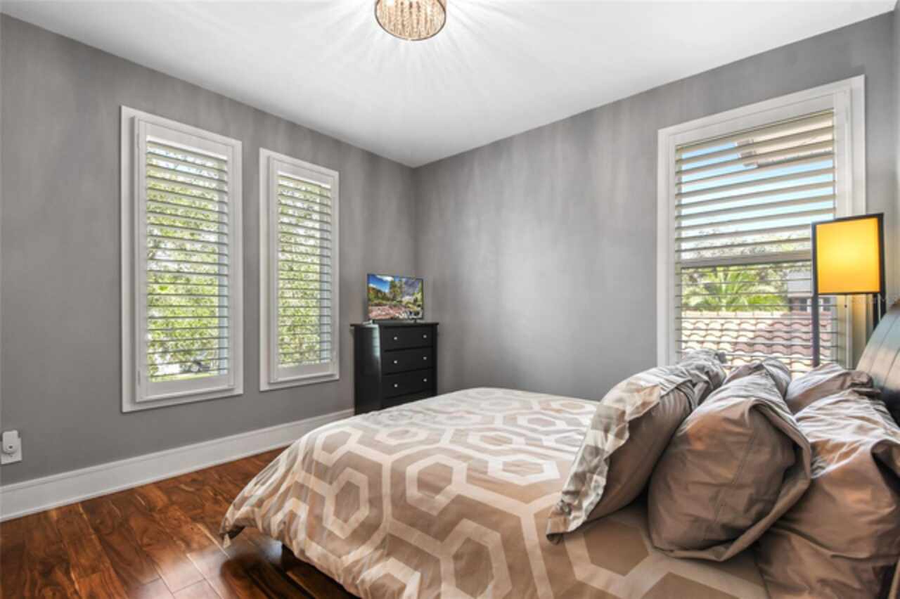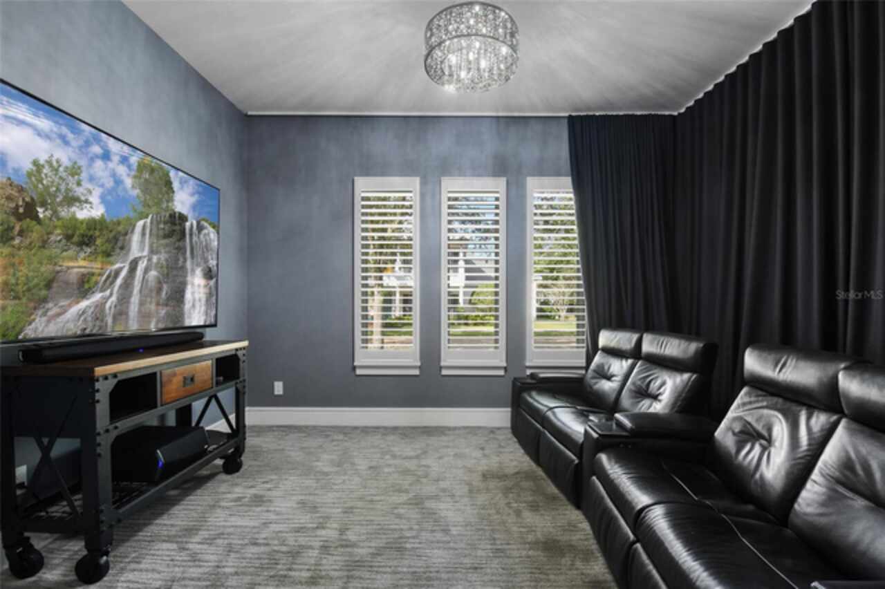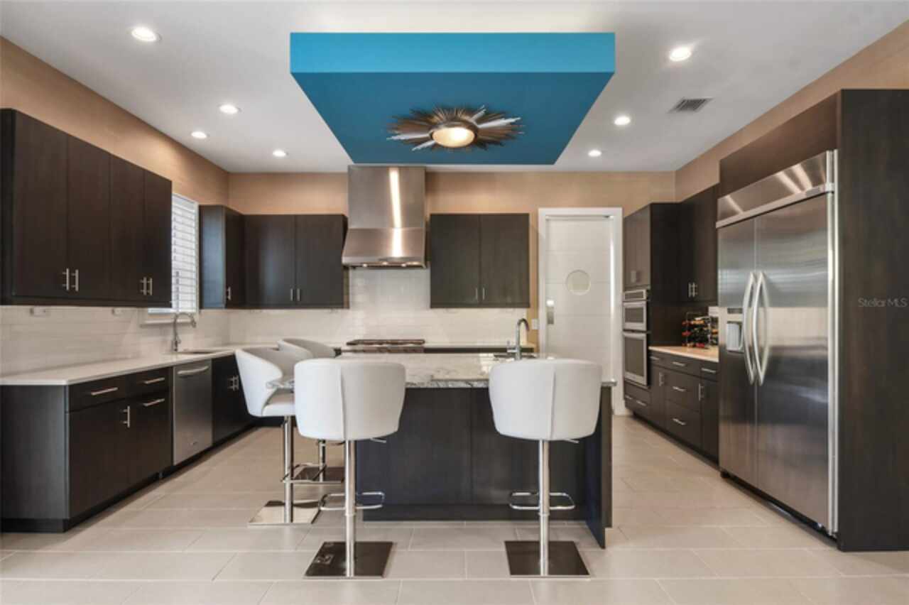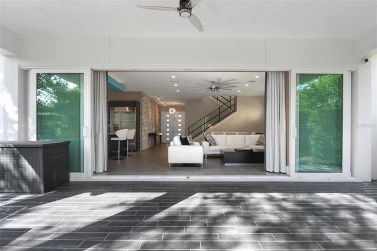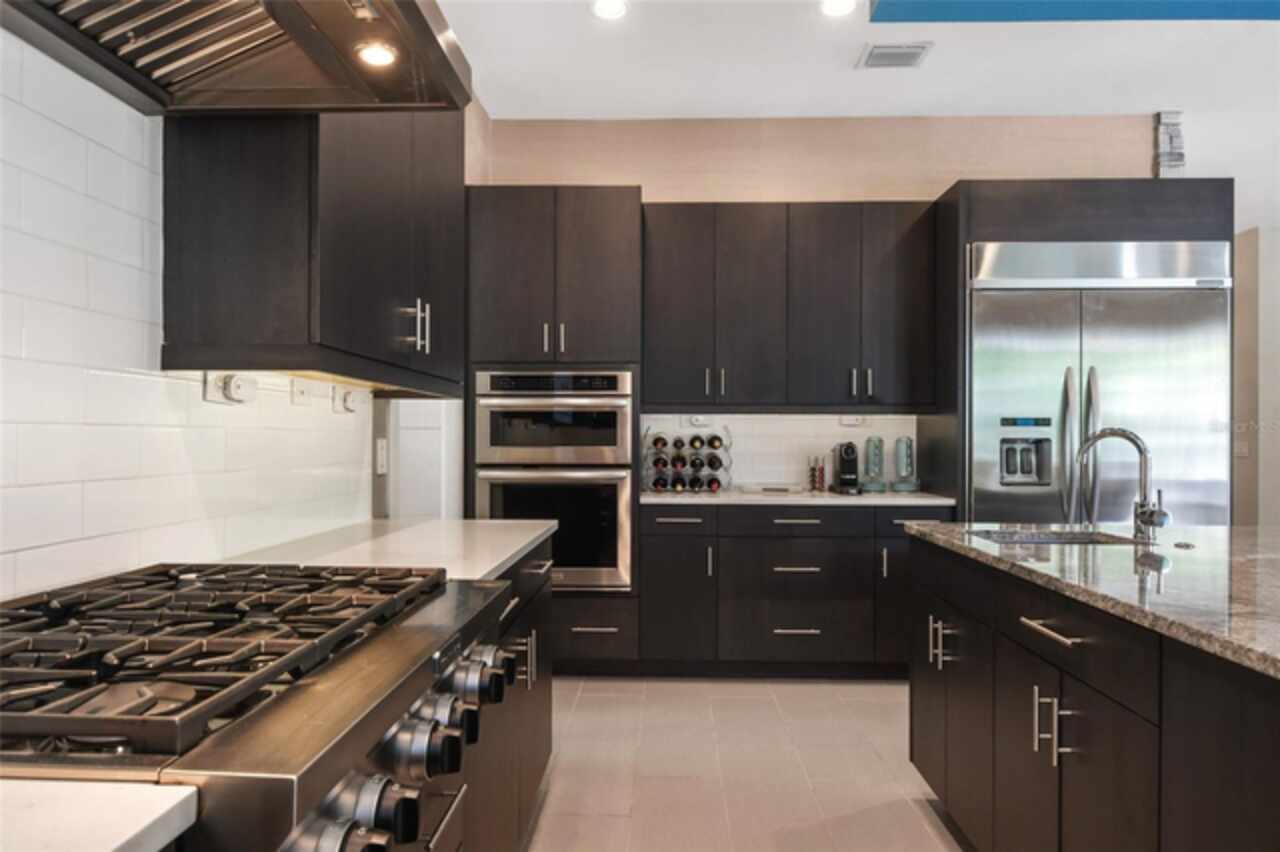 Exceptional Phil Kean-designed contemporary masterpiece in Winter Park's prestigious Windsong community. This sophisticated 4-bedroom, 4-bathroom residence seamlessly blends modern luxury with practical living across two thoughtfully planned levels. The striking exterior features geometric lines, stacked stone accents, and dramatic double entry doors, setting the tone for the remarkable interior. A grand foyer with continuing stone elements welcomes you into an open-concept main level, perfect for both entertaining and daily living. Walls of 8-foot sliding glass doors blur the lines between indoor and outdoor spaces, opening to a covered 12' x 25' lanai. The showstopping gourmet kitchen serves as the heart of the home, featuring a commanding 6' x 6' granite island, KitchenAid stainless steel appliances including a professional 6-burner gas cooktop, generous walk-in pantry, and sleek dark cabinetry contrasting with the subway tile backsplash and white countertops. A sophisticated blue ceiling detail and sunburst light fixture add artistic flair to this culinary haven. The main level includes a private en-suite guest room, while the upper level houses the primary suite, two additional en-suite bedrooms, a versatile loft workspace, and laundry facilities. Recent premium upgrades include a whole-home generator, surge protection system, EV charging outlet, hardwood flooring in upstairs guest rooms, home theater electronics, whole-home audio, and security system with integrated smoke detection. Located in the amenity-rich Windsong community, residents enjoy chain of lakes access, multiple community pools, and playground facilities. Minutes from the vibrant dining scenes of Audubon Park Garden District, Mills 50, and Winter Park's renowned Park Avenue. This masterfully designed residence offers the perfect balance of sophisticated style, modern convenience, and prime location.