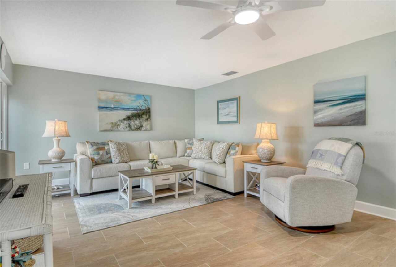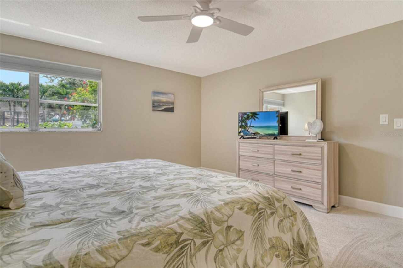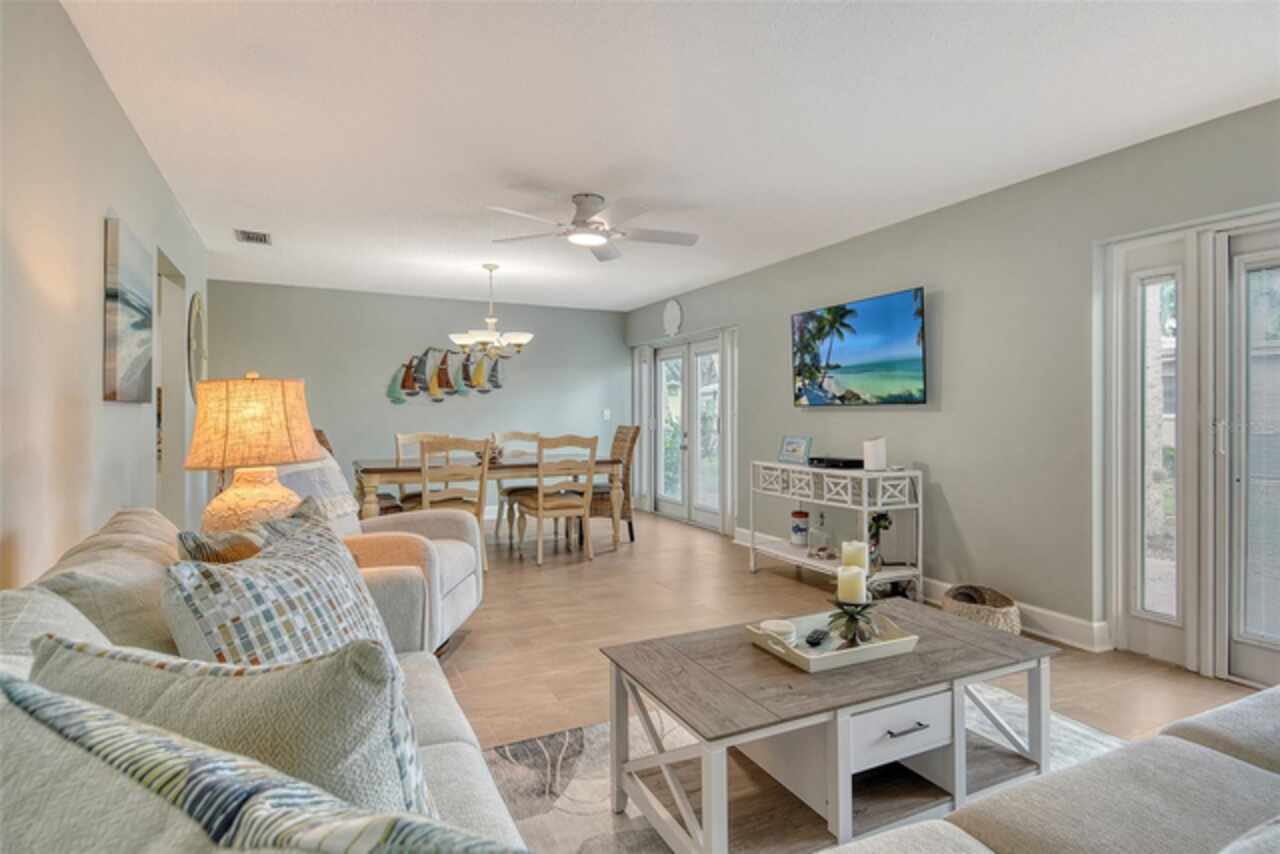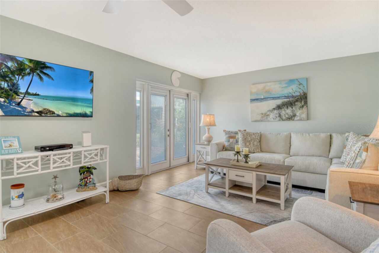 PERFECTION! Enjoy effortless coastal living in this beautifully REMODELED, 2 bed/2 bath GULFSIDE villa with GARAGE, offered TURNKEY FURNISHED - with BRAND NEW 2025 furniture and furnishings! From the moment you arrive, you'll appreciate the thoughtful updates and fresh cohesive coastal decor that make this residence a stunner - and completely move-in ready. The all NEW galley kitchen boasts white custom cabinetry, granite countertops & backsplash, recessed lighting, and brand new GE appliances - perfect for preparing easy meals after a day at the beach. The well appointed, open concept living and dining areas flow seamlessly to the open air patio through two sets of French doors, creating an inviting indoor/outdoor feel. NEW porcelain tile floors throughout the main living areas add a touch of sophistication, while the bedrooms offer comfort with NEW plush carpeting. Both bathrooms have been stylishly remodeled with new cabinets, granite counters, and modern fixtures. The ensuite primary bathroom provides a bit of luxury with dual sinks, granite counters, a separate vanity, a spacious walk-in closet, and a linen storage closet. A NEW full-sized washer & dryer adds convenience, and the attached ONE CAR GARAGE also offers extra storage for your bikes or beach essentials. NEW 2025 VILLA ROOF. Located just around the corner from the beautiful clubhouse pool and only a short stroll to 800’ of your own PRIVATE quartz sand beach on the GULF and a second, beachside pool. And with Siesta Key Village’s vibrant shops and restaurants right next door, this villa is also perfectly positioned for enjoying the best of Siesta Key. Whispering Sands is a premier 55+ GULF FRONT complex offering its own private beach, 2 pools, clubhouse (currently being remodeled), canoe/kayak storage, shuffleboard, onsite management & maintenance staff, and security. Whether you're seeking a serene full-time residence or a seasonal retreat, this exceptional, well priced villa offers the ultimate in island living!