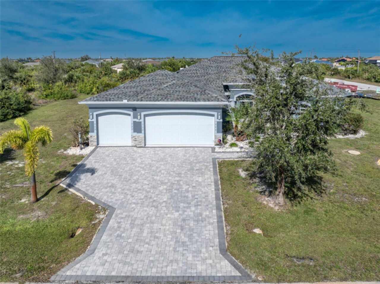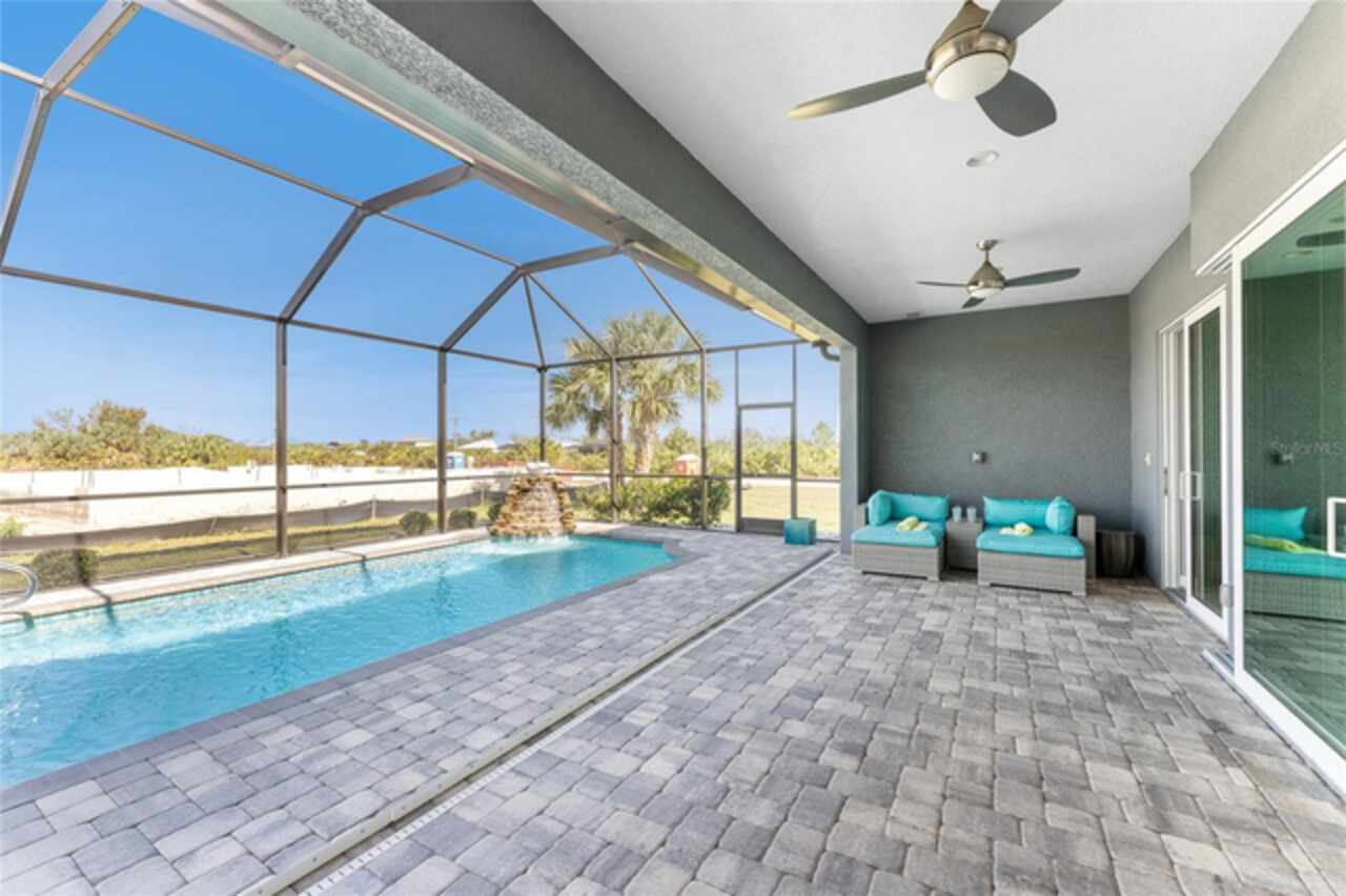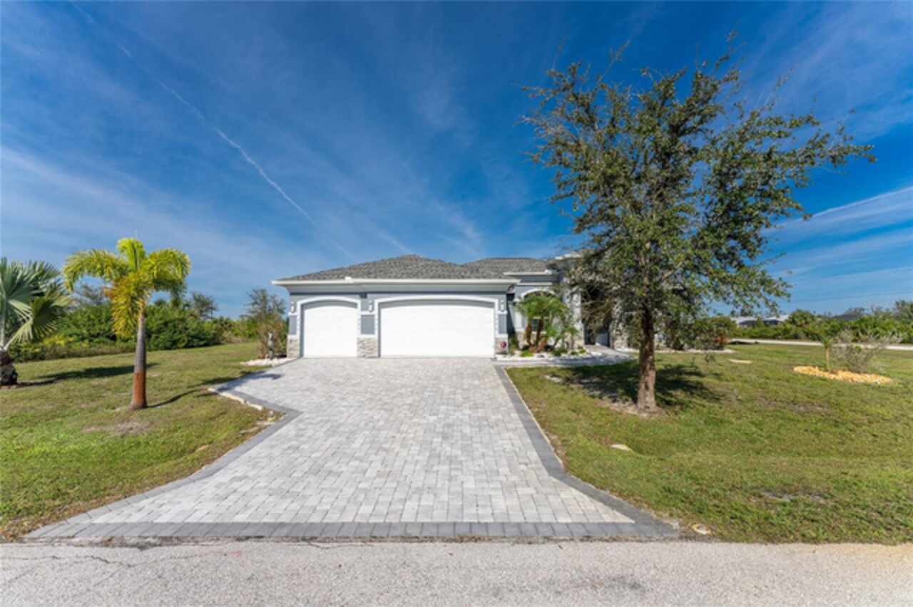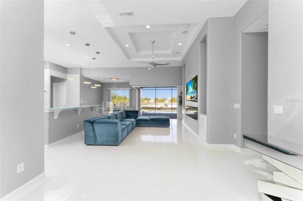 Welcome to this meticulously maintained 3-bedroom, 2-bathroom home plus den that offers an impressive 2, 115 sq. ft. of living space. Set on a large double lot, this home has been thoughtfully designed, blending modern amenities with luxurious finishes. Boasting a new HVAC V/S motor and deluxe UV light installed in February 2022, along with fresh interior and exterior paint, this home is move-in ready and perfect for anyone looking for a stylish, worry-free lifestyle. The culinary kitchen, is a true chef’s paradise! This gourmet kitchen is outfitted with stunning aqua onyx countertops, a beautiful glass tile backsplash, and an expansive double island—perfect for entertaining or casual family meals. The sleek glass cooktop and abundance of soft-close cabinets and drawers provide both style and function, making cooking a true joy. This open and airy floor plan is enhanced by soaring high ceilings and elegant touches, including double tray ceilings in the living area, a circular tray ceiling in the dining room, and tray ceilings in the foyer. The open concept seamlessly connects the living room, dining area, and kitchen, with pocket sliding doors leading to the gorgeous pool area, perfect for enjoying Florida’s indoor-outdoor lifestyle. Entertaining made easy with The great room that features a striking built-in electric fireplace, framed by custom-built shelving. A state-of-the-art 8-speaker stereo system runs throughout the great room, kitchen, primary bedroom, and lanai, making it ideal for hosting gatherings or simply enjoying music throughout your home. Step outside to your private oasis featuring a luxurious heated saltwater pool with a sun shelf and a tranquil waterfall feature. This space is perfect for both relaxation and entertaining guests in the gorgeous Florida weather. The spacious primary bedroom features ample walk-in closets to accommodate all your storage needs, while the high-end finishes provide a sense of retreat and relaxation. The primary bathroom is a spa-like retreat, with an oversized walk-through shower featuring dual shower heads for an ultimate luxury experience. This home offers a split floor plan with 2 bedrooms and a guest bathroom that offers a beautifully tiled walk-in shower with direct access to the pool area—perfect for rinsing off after a swim. The large laundry room offers Topaz Gem countertops, extensive cabinetry, and a convenient laundry tub. The home is equipped with hurricane windows throughout and a lanai panel for added protection during storm season. New roof installed in 2023, 2x2 porcelain tile throughout, and a Rain Soft water treatment system, installed in October 2019, ensures high-quality water for everyday use. The exterior of the home is just as stunning as the interior, featuring a beautifully paved driveway that leads up to the insulated 3-car garage with epoxy-coated flooring. Lush landscaping, mature plants, irrigation system and white Caribbean beach pebbles add to the home’s appeal. Fenced in pet area with 2 gates provide a safe haven for your pets. This home is truly a showstopper, offering a blend of luxurious features, thoughtful upgrades, and a prime location in South Gulf Cove. Whether you’re looking for a peaceful retreat or an entertainer’s dream home, this property has everything you need and more.