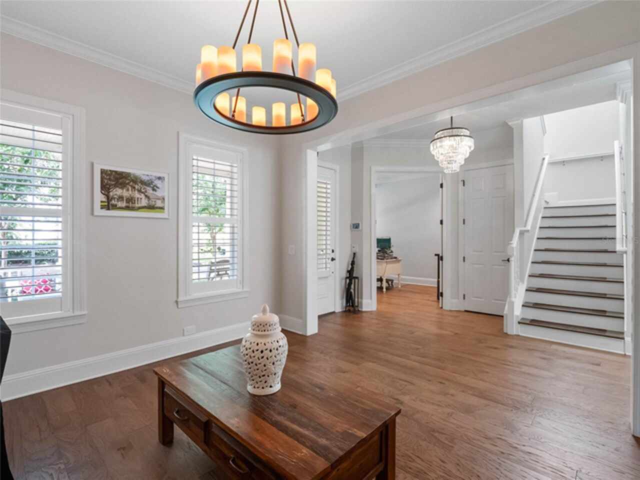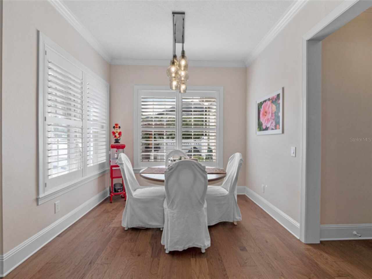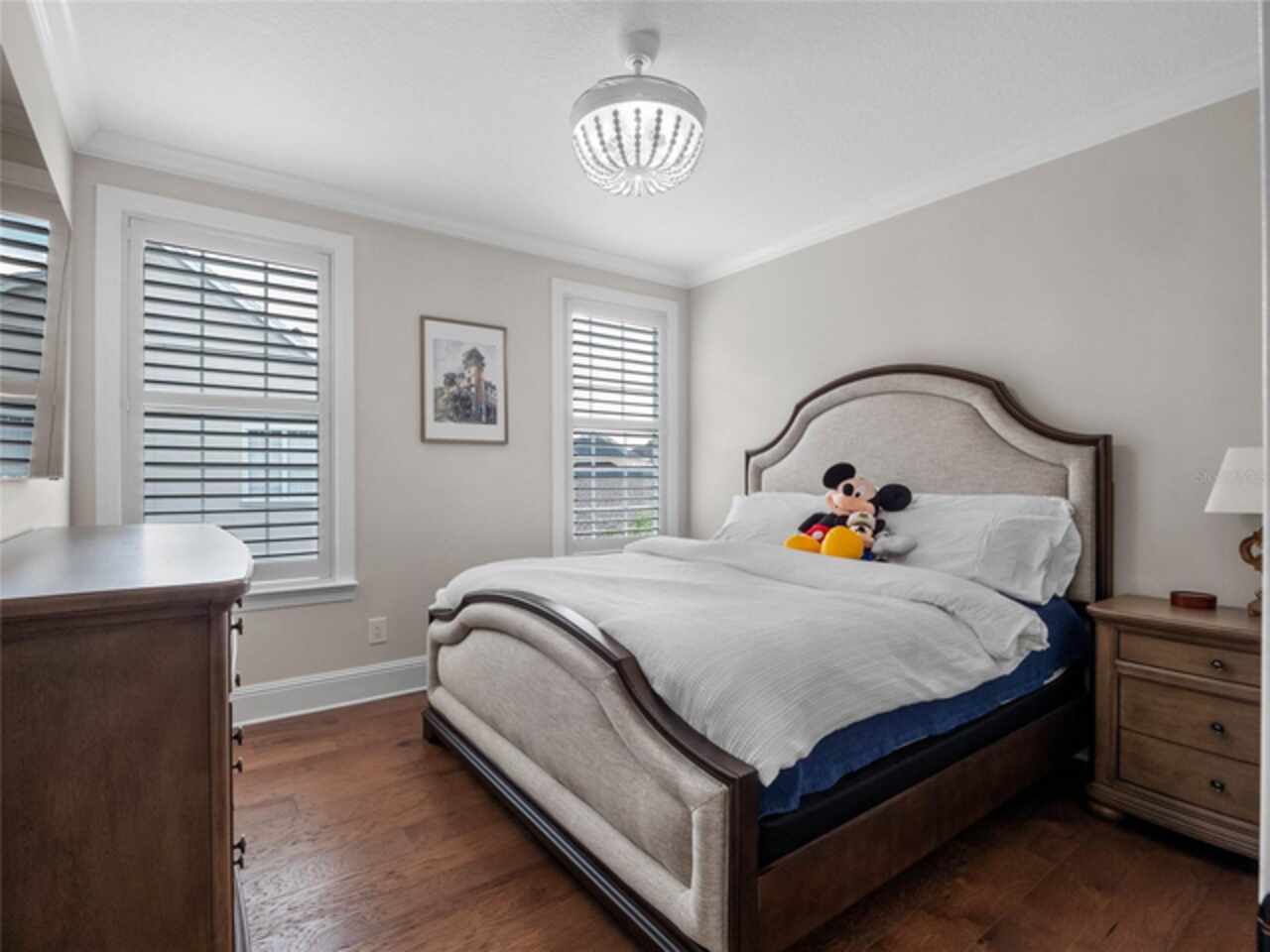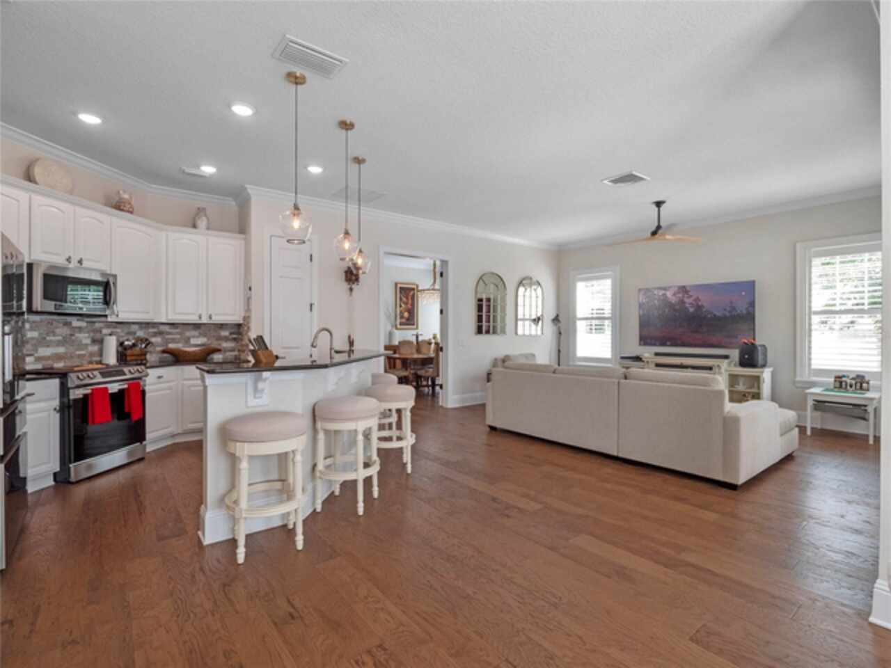 Comfort meets elegance in this spacious 4-bedroom, 3.5-bathroom, 3-car garage Artisan Park home situated on an oversized, professionally landscaped lot. New roof in 2025. Extensively upgraded in 2018 this home is a must see. Notable features in the home include spacious first floor master, high-end hickory wood floors throughout, staircase rebuilt in 2018, premium hardware and hinges on all interior doors, interior and exterior ceiling fans, crown molding on the first & second floors, 7-inch baseboards, high ceilings, high end custom plantation shutters including all exterior doors, stainless steel kitchen appliances, professionally painted (white) cherry cabinets in kitchen and bathrooms (with under-lighting in kitchen), stone backsplash, granite counter tops, custom closets, premium A/C units - 2018 (with 16 seer, UV lights, and humidity control), remote control blind in window at staircase landing, all bathrooms upgraded with new fixtures and hardware in 2018, and air conditioned garage. Ownership includes exclusive resident access to the Artisan Park Clubhouse with benefits including a fitness center, resort style swimming pool and spa, billiards room, outdoor kitchen, restaurant/bar, plus banquet room. Celebration, FL is a residential community where families can enjoy parks, playgrounds, community pools and expansive nature trails, over 26 miles of walking/biking trails and an abundant venue of entertainment and elegant dining options right in town - they are all yours to luxuriate in from sun up to sun down! The following items do not convey with the sale: Dining Room Chandlier, All bedroom ceiling light fixtures, Kitchen droplights over breakfast bar, kitchen droplights over kitchen table, living room fan, garage refrigerator, garage cabinetry and tool storage, garage wall cabinets.