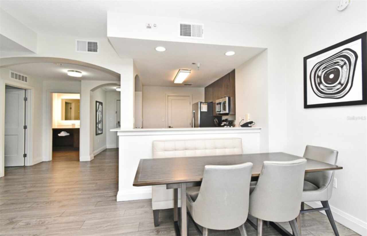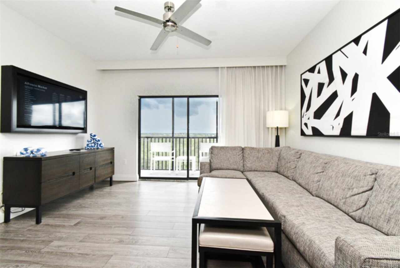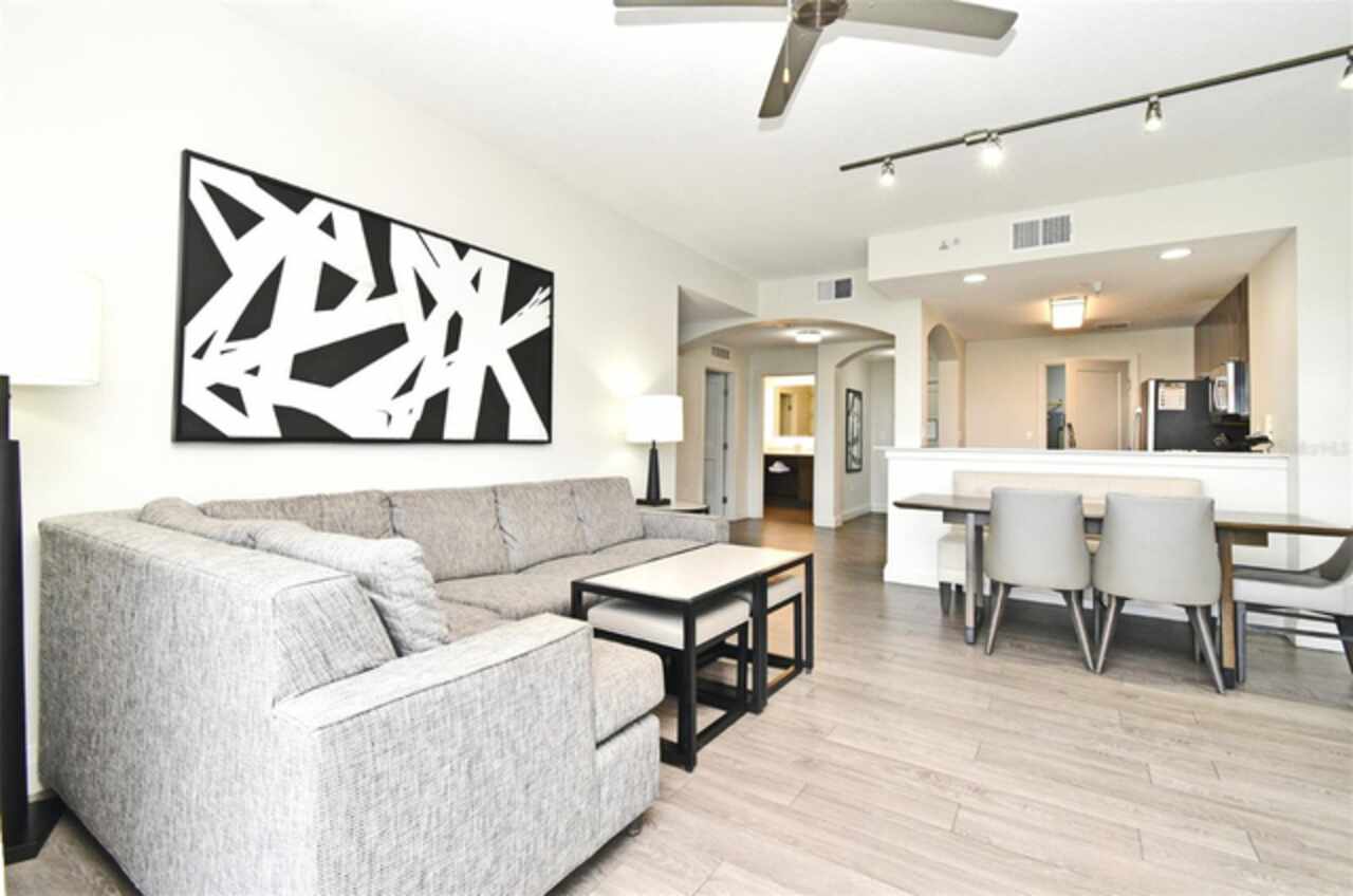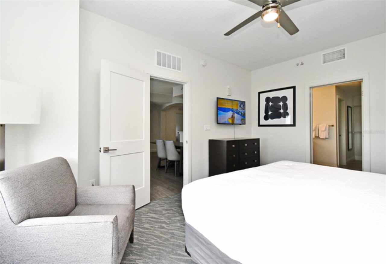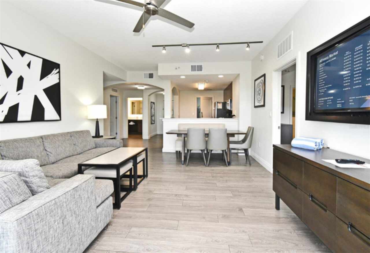 Welcome to this luxurious 3 bedroom, 2 bath vacation condo at the Grove Resort and Waterpark. This top floor condo is an ideal retreat for those looking to experience the Magic of Disney World and enjoy a wide range of amenities. Its proximity to Disney (just 6 miles away) and the shuttle service provided make it a convenient choice for guests. The inclusion of a water park, flow rider surf experience, spa, restaurant, business center, and inhouse market means that there's something for everyone. Whether you're seeking relaxation, adventure, or convenience the grove resort has it all. The covered parking adds an extra layer of convenience and protection for guests' vehicles. The unit is FULLY FURNISHED and tastefully decorated which provides a comfortable and inviting atmosphere. The quartz counter tops and modern cabinets in the kitchen and bathrooms add a touch of elegance. The open floor plan is conducive to relaxation and socializing, providing plenty of space for guests to unwind after a day at the parks or in the pool. The screened balcony overlooking a beautiful view of well-manicured palm trees and a serene, picturesque view is a major benefit to the unit. Given its desirable location and the range of amenities offered, it's clear why The Grove is a highly sought-after vacation spot. Overall, this condo is a fantastic investment opportunity for those looking to provide a memorable vacation experience to guests while also having a spot for their own enjoyment.