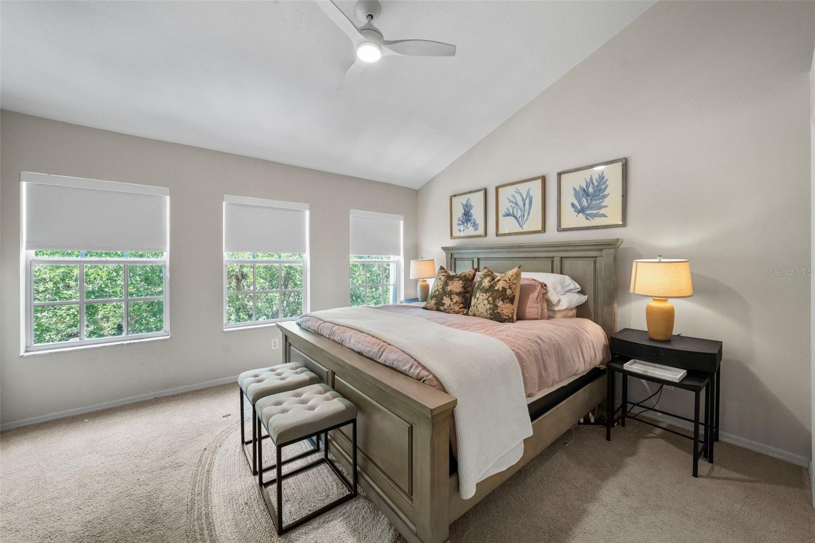 Built-in Features, Ceiling Fans(s), Eat-in Kitchen, High Ceilings, Open Floorplan, PrimaryBedroom Upstairs, Solid Wood Cabinets, Stone Counters, Thermostat, Vaulted Ceiling(s), Walk-In Closet(s), Window Treatments