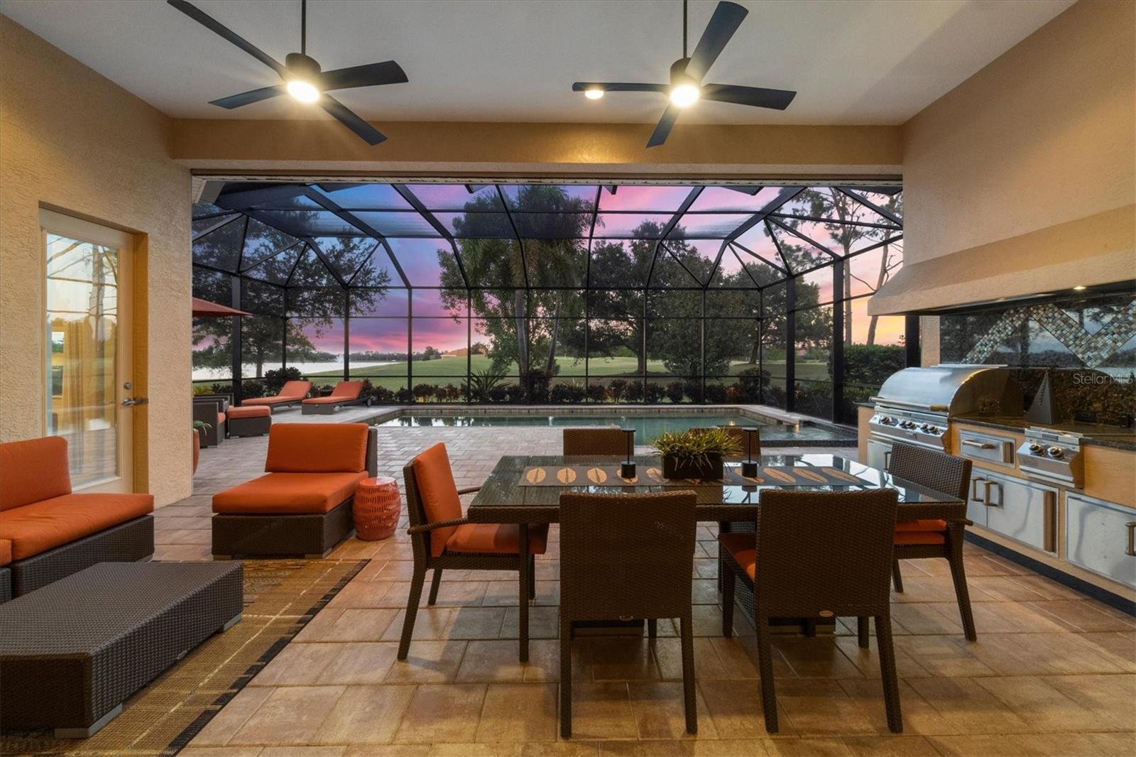 This striking three-bedroom, two-and-a-half-bath, open layout residence offering nearly 3, 000 square feet of refined living space, oversized 3.5-car split garage, has one of the most spectacular views, on a cul-de-sac in the prestigious gated community of Country Club East. This incredible home blends architectural grandeur with modern sophistication. An impressive arched portico framed by twisted columns and manicured landscaping create a grand first impression. Through the custom glass door, soaring ceilings, designer lighting, porcelain tile flooring, and abundant natural light through impact-resistant windows and doors set a tone of relaxed elegance. The open floor plan flows effortlessly through the formal living and dining areas into a designer kitchen showcasing custom wood cabinetry, an oversized granite island with stunning onyx quartz countertops and GE Profile stainless appliances, including a gas cooktop with vented hood, built-in oven, warming drawer, convection microwave and refrigerator. Just off the kitchen, you’ll find a built-in office nook, dry bar with beverage refrigerator and access to a convenient pool bath. Expansive sliding glass doors open to an oversized screened lanai with hurricane-proof Storm Screen for added protection, and newly painted and re-screened cage, designed for year-round enjoyment. It comes complete with an impressive outdoor kitchen, saltwater, oversized pool and spa, outdoor shower, and breathtaking views of the 14th hole on the golf course and tranquil lake. The primary suite offers a serene private retreat, featuring plush carpeting, custom walk-in closets and a spa-inspired bath with split vanities, freestanding soaking tub, glass-enclosed shower and private water closet. Past the hallway of four double closets for extra storage, you’ll find two guest suites with custom closets that share a stylish Jack and Jill bath, while a dedicated office with wood flooring provides the ideal workspace. The laundry room with custom cabinetry ensures convenience and functionality throughout. The home also features a whole-house generator and full security system providing seamless comfort and peace of mind, a circulating hot water heater, in-house vacuum system, an oversized 3.5-car oversized garage that includes your temperature-controlled workout area and extra storage and utility sink, brick paver driveway and meticulous landscaping. In Country Club East, one of Lakewood Ranch’s sought-after villages, residents enjoy 24-hour gated security, resort-style pools, fitness centers, parks and scenic walking trails. Optional membership to The Lakewood Ranch Golf and Country Club provides access to four championship golf courses, tennis and pickleball facilities, fine dining venues and an engaging social calendar, all just minutes from Waterside Place, Lakewood Rach Main Street, boutique shopping and Gulf Coast beaches.