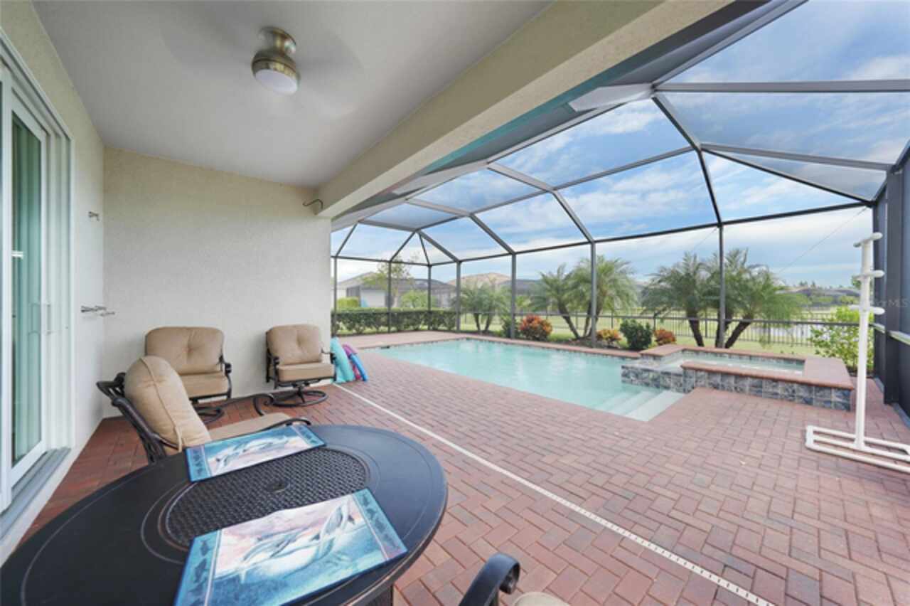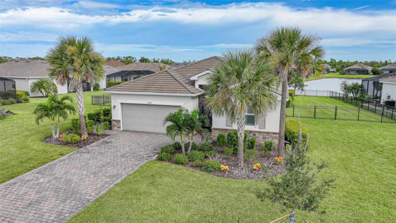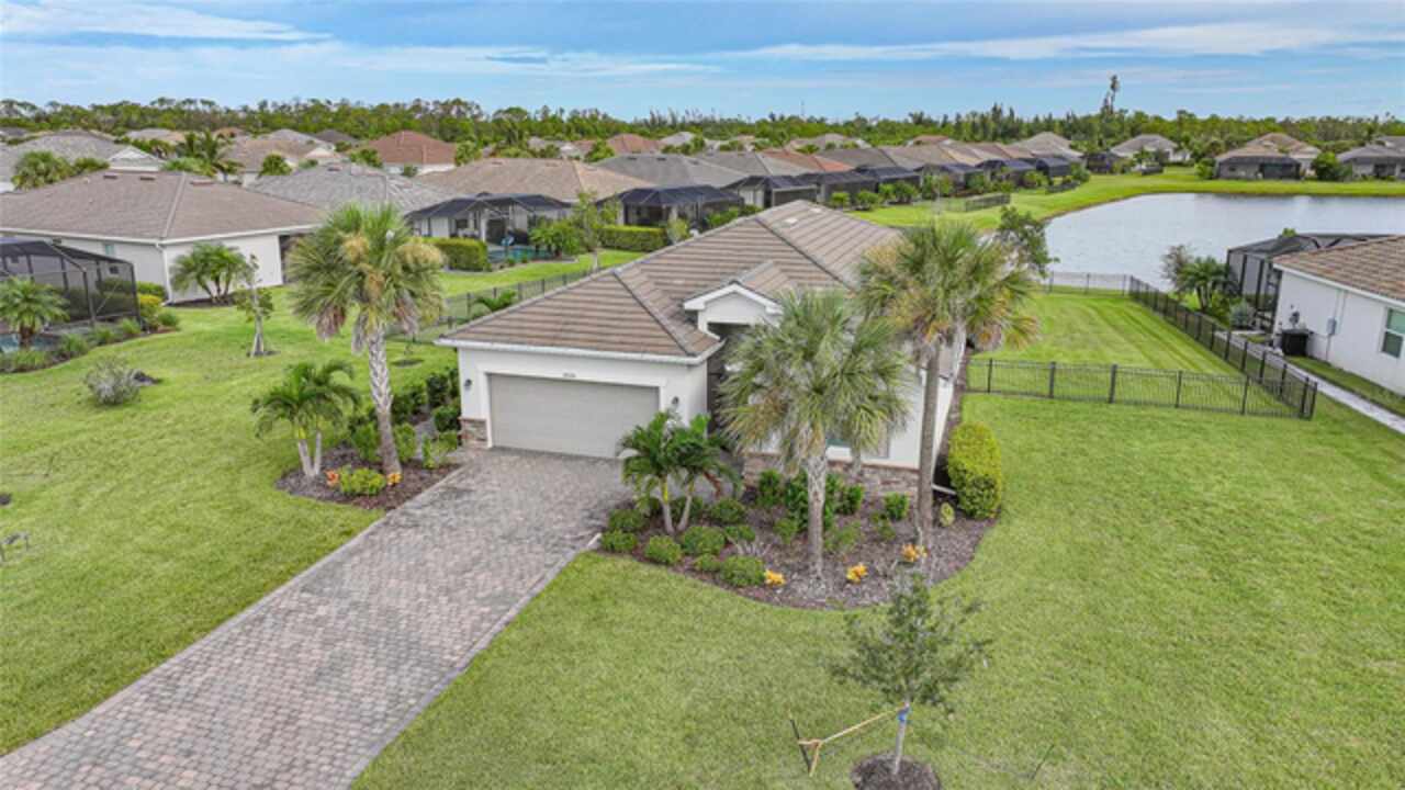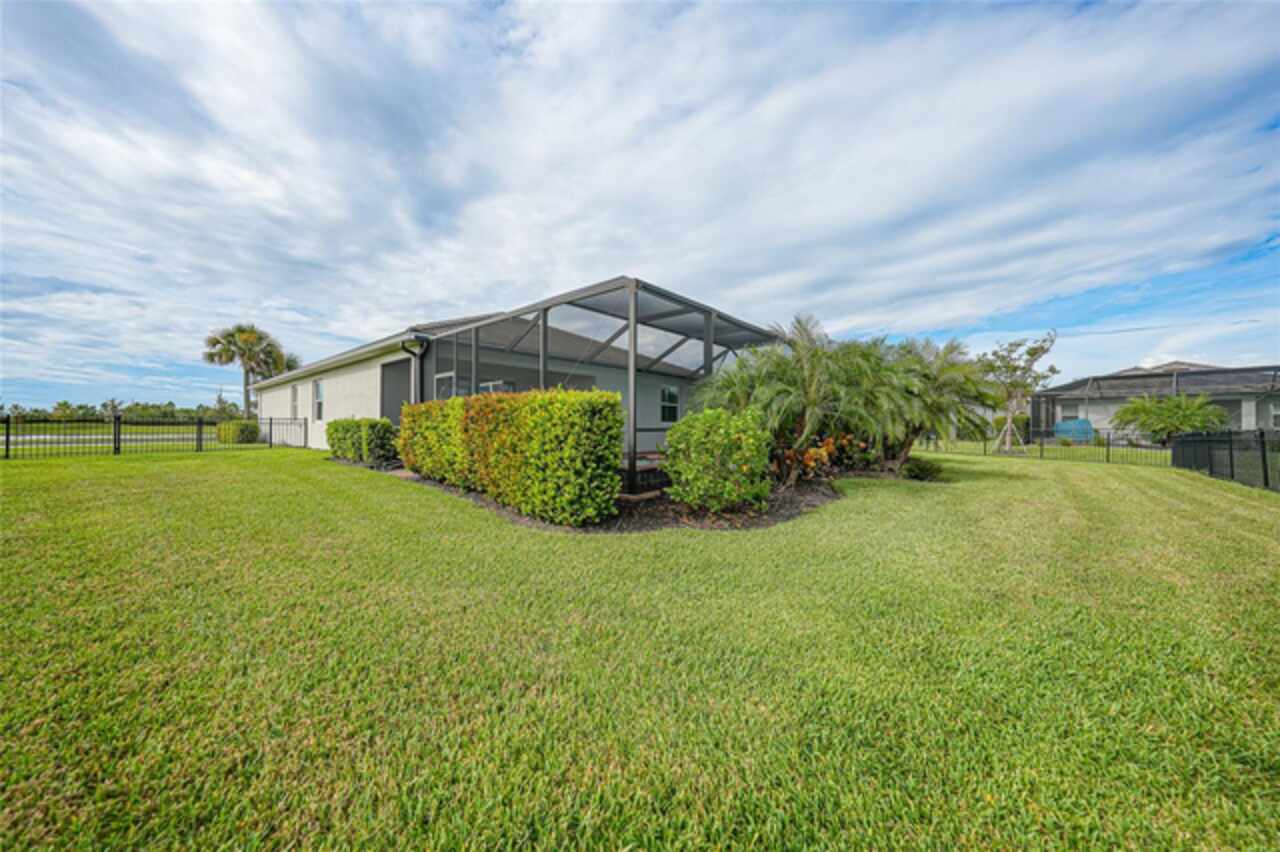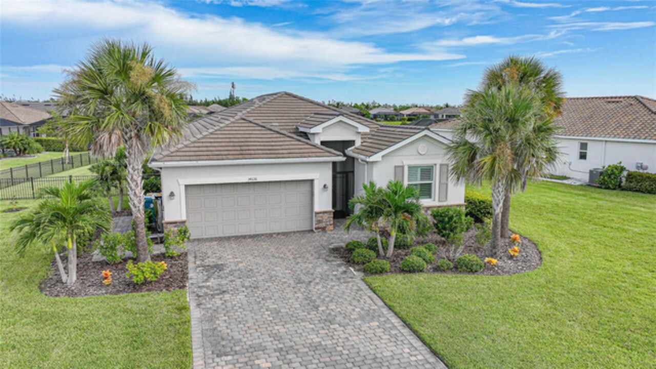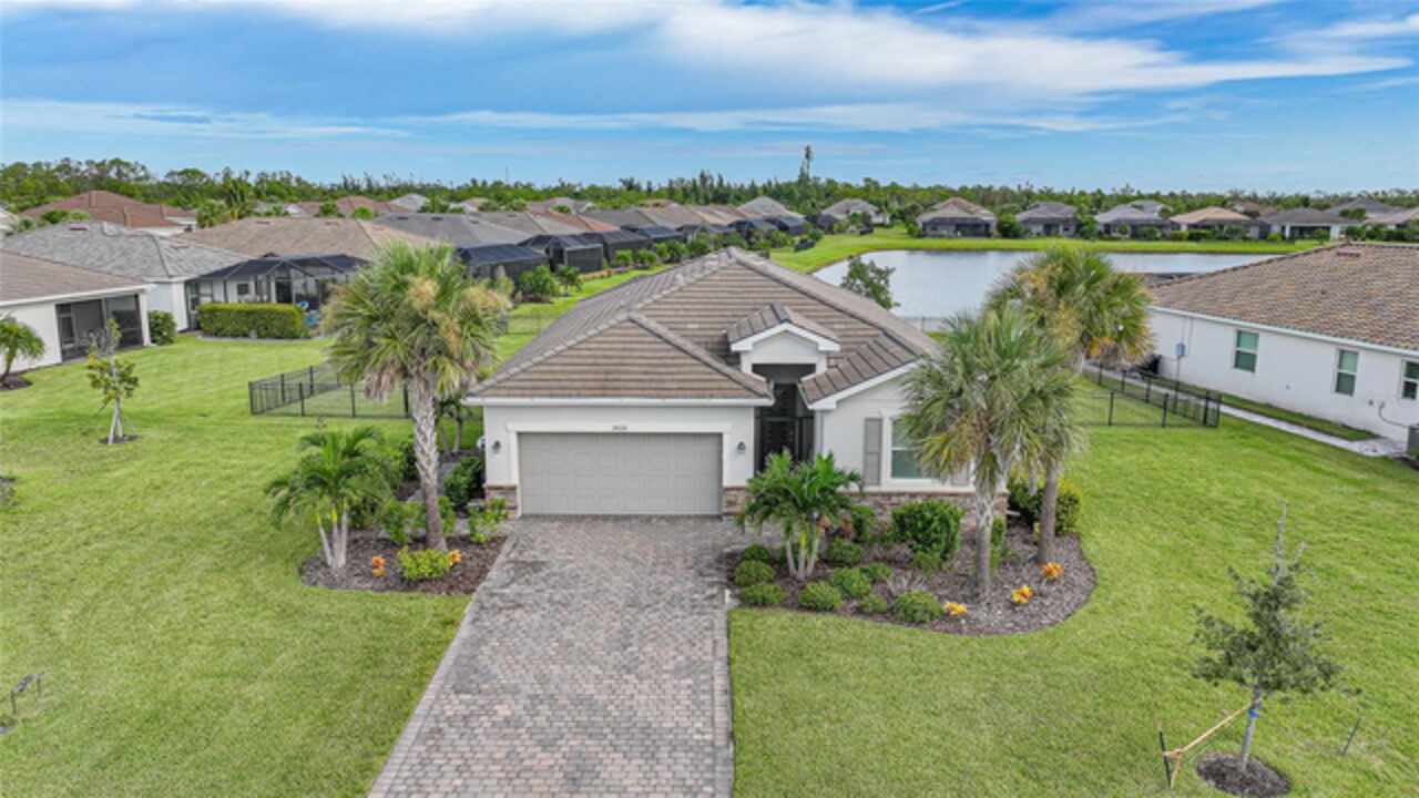 BEST VALUE IN HARBOR WEST! Enjoy the largest interior lot in the community that is completely FENCED and has a HUGE BACKYARD. This 4-bedroom, 3-bathroom home boasts a HEATED POOL & SPA, an EXTENDED LANAI and an already large patio that is perfect for relaxing and enjoying the serene LAKE-VIEW while sitting by the pool. The home is fitted with IMPACT WINDOWS AND SLIDERS that grant FULL HURRICANE PROTECTION but also give you the benefit of never having to worry about putting up or taking down any hurricane shutters. Enjoy the convenience of a TILE ROOF that typically last much longer than a standard shingle roof and gives the home a Mediterranean style look. Inside you'll find a spacious open-floor plan with a split bedroom layout outfitted with 12x24 throughout the home and beautiful granite countertops across all of the countertops in both the kitchen and bathrooms. The charming upgraded white kitchen features a large island for an informal dining space, a large pantry, and stainless-steel appliances. The primary bedroom is ample in space and comes with two big-walk in closets. The primary bathroom comes complete with his and her sinks and a large shower with a Kohler Artifacts Hydro rail system with a rain head attachment or a handheld attachment for your showering pleasure. The 2nd bedroom is also very spacious and is positioned in a private part of the home away from the other bedrooms and comes with its very own on-suite bathroom. The front wing of the home comes with two more well-sized bedrooms that can be used for a variety of things besides just a bedroom, maybe a den, office, workout room, etc. The front wing comes with its own convenient bathroom. Great for guests or for quick use. The large laundry room is located just off the 2-car garage and is outfitted with 42' soft close cabinets. Underrated features include charming plantation shutters on the interior of all the windows, elegant lighting and upscale fans, Koehler faucets in master bathroom and matching towel and toiletry bars in all baths. The brick paver patio has been maintained and resealed to increase its longevity. The paver driveway is large and wraps around to the air handler. The home has a nice screened in entryway with decorative front shutters. The whole house has gutters around it. Gray plank tile throughout and a warm light neutral gray interior lends the perfect backdrop for your designer inspirations. This is located in Harbor West which is a GATED COMMUNITY with NO CDD FEES. The lawn Maintenace and irrigation is taken care of by the community. This property is not one that you'll want to miss. BE SURE TO VIEW THE 3D VIRTUAL TOUR ON ZILLOW. Don't forget the close proximity this property has to both Manasota Key Beach and Englewood Beach as well to Restaurants, bars, grocery stores, medical offices. Tampa Rays and Atlanta Braves play Spring Training nearby every year. You won't be disappointed with this located! This home has NEVER FLOODED, and a Survey and Elevation Certificate are available. Call your agent to book your showing today!
