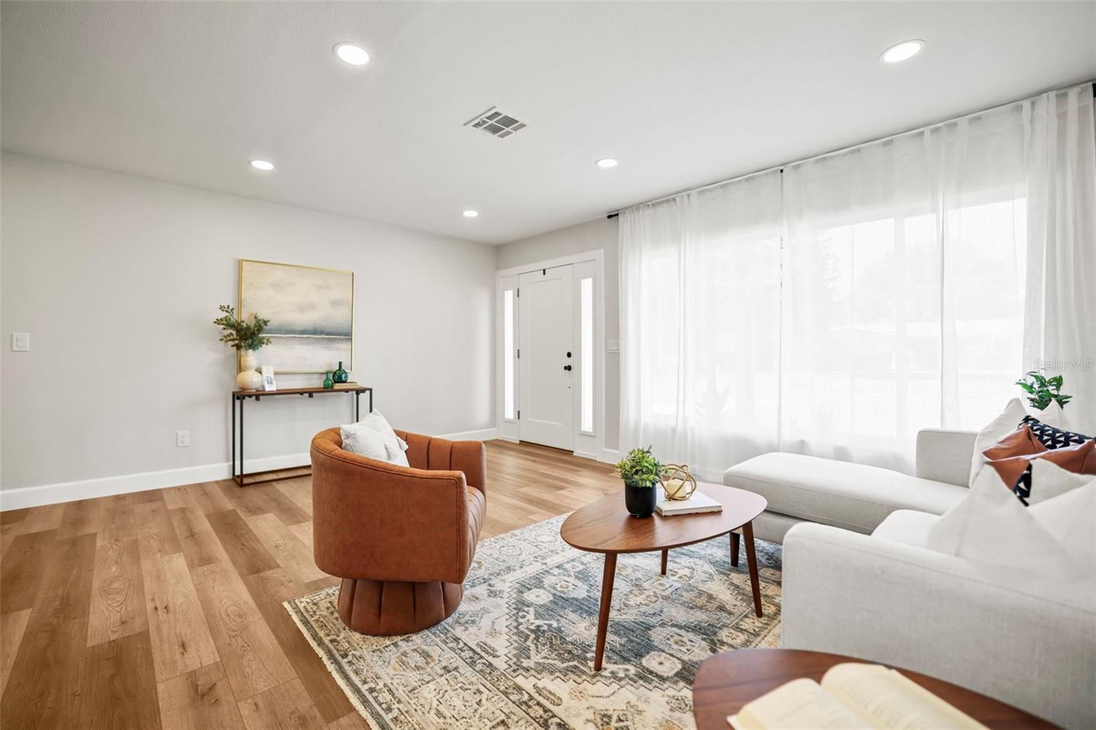 Golf Cart to Downtown Dunedin – Beautifully Remodeled 3-Bedroom, 2-Bath Home! This three-bedroom, two-bath home with a large one-car garage is perfectly located just minutes from Downtown Dunedin, the Pinellas Trail, and Honeymoon Island. Completely remodeled inside and out, it features smooth-finish walls and ceilings, a new roof, and beautiful modern finishes throughout. The brand-new kitchen shines with quartz countertops, 36” shaker cabinets with crown molding, gold accents, stainless-steel appliances, and recessed lighting. Both bathrooms feature designer finishes with custom tile work, quartz counters, and elegant gold fixtures. The primary suite includes a stunning attached bath, while French doors lead to the third bedroom, which could also serve perfectly as a home office or den. Outside, you’ll find a large yard shaded by gorgeous live oaks, with attractive front landscaping and plenty of space to add a pool or create your dream outdoor retreat. Additional highlights include a 2018 A/C, new paint, new electrical, new plumbing, new flooring throughout, and an open, light-filled layout ideal for entertaining. Experience the ultimate Dunedin lifestyle—bike to the beaches, golf-cart downtown for dinner, or walk/bike to the water to enjoy nightly waterfront sunsets from this beautiful, move-in-ready home.