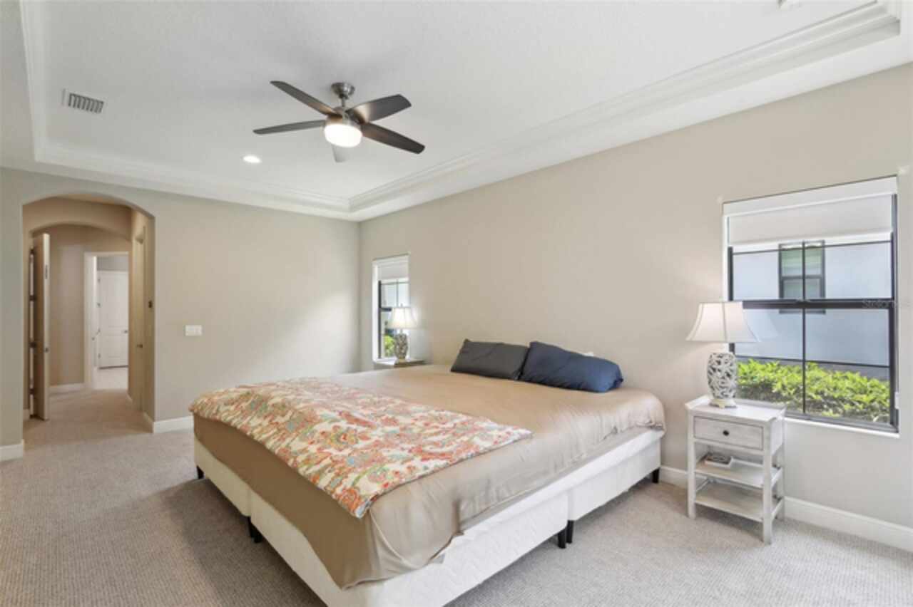 Ceiling Fans(s), Coffered Ceiling(s), High Ceilings, Kitchen/Family Room Combo, Primary Bedroom Main Floor, Split Bedroom, Stone Counters, Thermostat, Tray Ceiling(s), Walk-In Closet(s), Window Treatments