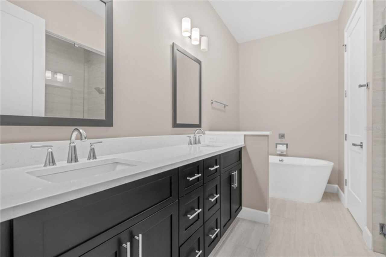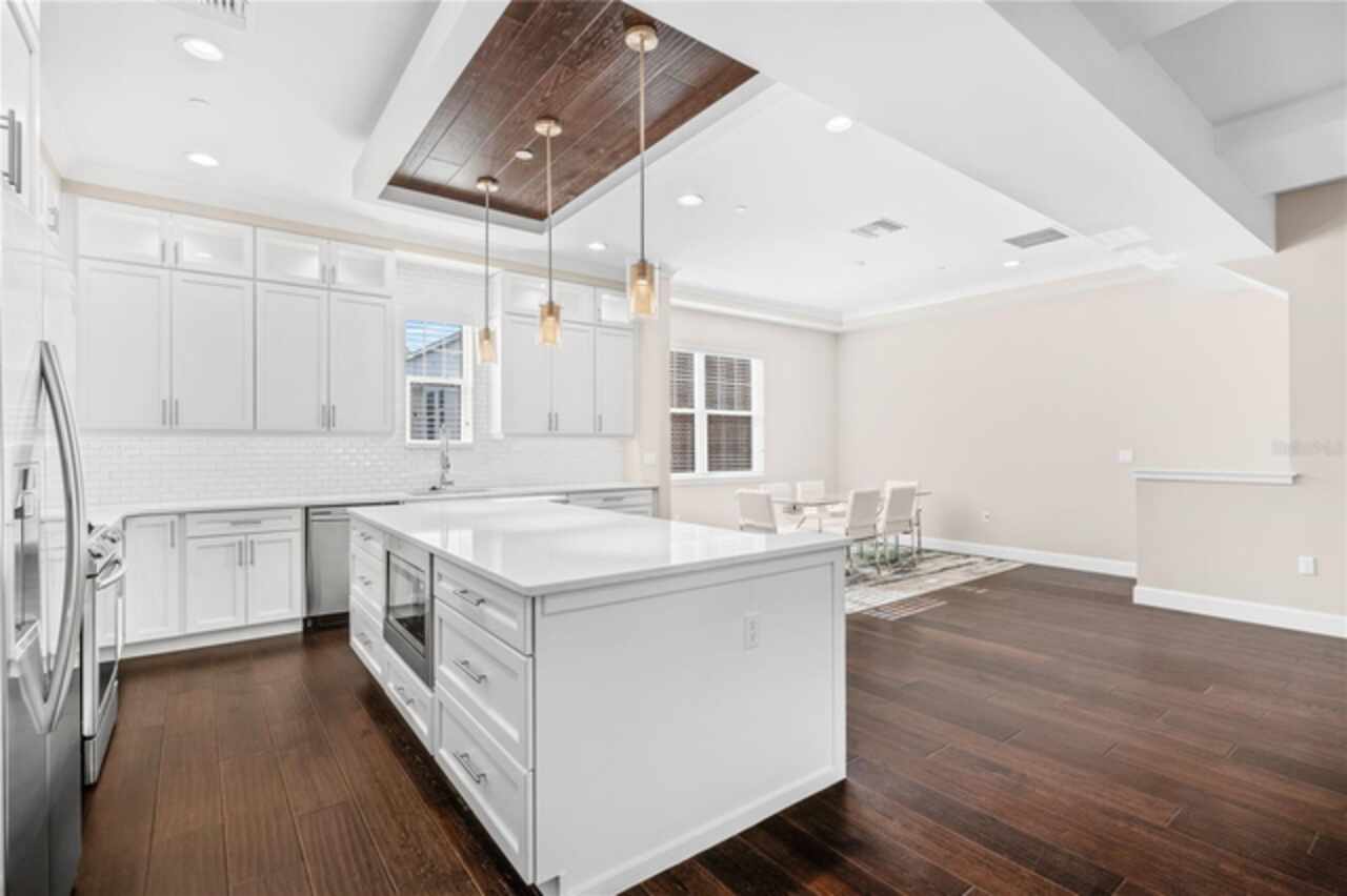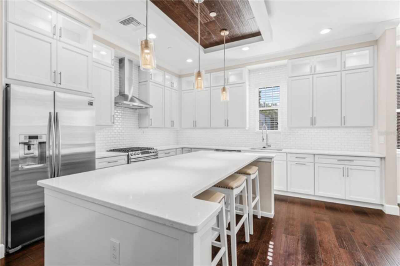 Gorgeous former model in this beautiful masonry wrapped complex in the heart of Winter Garden! Only 4 of these large 2900 SF units in entire complex which have a separate golf cart garage in addition to the two-car garage. Click on virtual tour for Matterport walk through and floorplan. This unit is elevator ready!! Ground level features a nice en-suite bedroom with walk in closet, full bath and option for additional washer and dryer. Gorgeous dark wood floors in all main areas. Main level offers a light and bright open floorplan with gourmet kitchen, custom inlay ceilings, pantry, dining area and light and bright living space with balcony and large windows and doors. The highly upgraded kitchen offers glass door cabinetry, lighting, stainless Samsung appliances, gas range, and beautiful granite counter tops with huge island for that special entertaining. The third floor is a wonderful retreat with spacious master suite and additional bedroom, both with full en-suite bathrooms and laundry area. Master suite has TWO huge walk-in closets and adjoining master bath featuring a double vanity, tile walls, luxury soaker tub, large glass enclosed walk-in shower. Additional features are Crown molding, recessed lighting, ceiling fans, custom plantation shutters, custom build in shelving organizers, pantry, on demand hot water heater, fire sprinklers, smoke and carbon monoxide detectors, prewired and plumbed for central vacuum system and so much more. Truly one of the most elegant units in the complex. This complex offers carefree lifestyle with a two-minute walk to all restaurants and shops in beautiful historic downtown Winter Garden. Some pictures have been virtually staged with furniture.