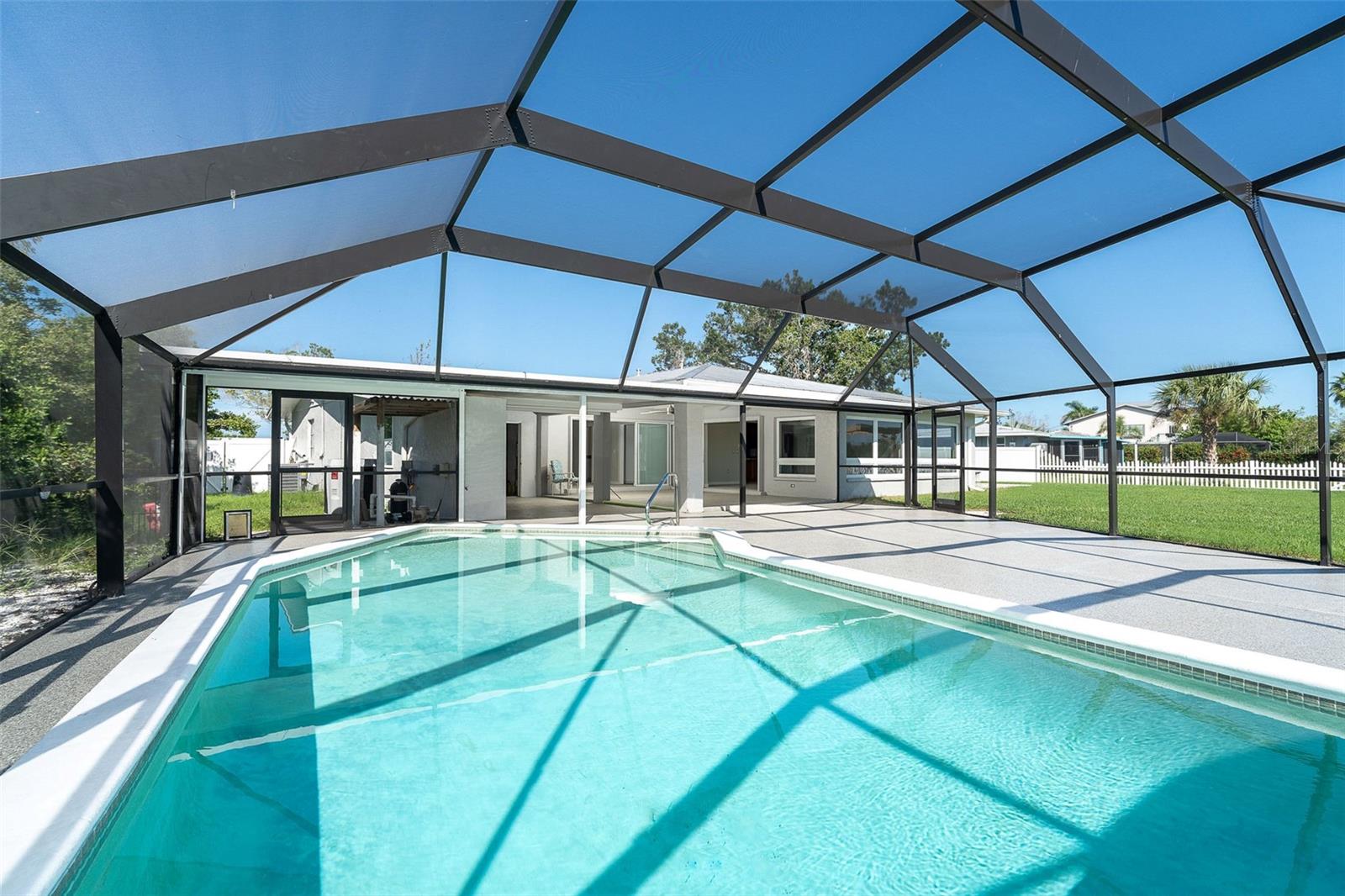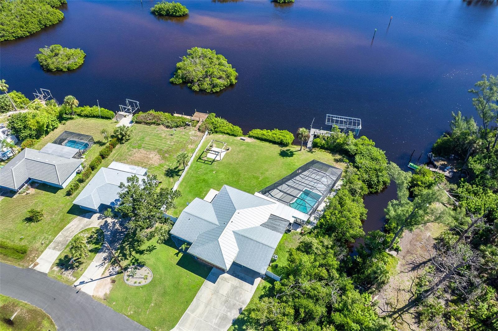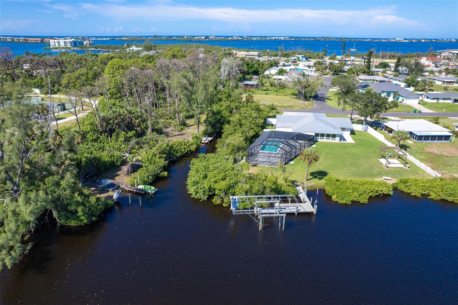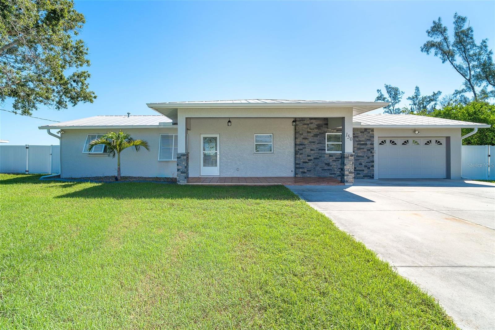 One or more photo(s) has been virtually staged. Welcome to coastal living at its finest. This beautiful 3-bedroom, 3-bath waterfront home is nestled on an oversized lot along scenic Godfrey Creek, offering serene views, exceptional privacy, and direct access to open water with just one fixed bridge. Boaters will appreciate the private dock, perfect for launching sunset cruises or day trips to the Gulf. Step into your private oasis featuring a oversized in-ground pool and a spacious screened lanai with a full pool bath, ideal for outdoor entertaining. The durable metal roof adds peace of mind, while the open floor plan effortlessly blends indoor and outdoor living. Located just minutes from Manasota Key and all three of its pristine beaches-Englewood Beach, Blind Pass Beach, and Stump Pass Beach, this home delivers the best of the Florida lifestyle. Whether you're enjoying a quiet morning on the water or entertaining guests in your tropical backyard retreat, 150 Crestview Dr offers the perfect blend of elegance, comfort, and coastal charm.