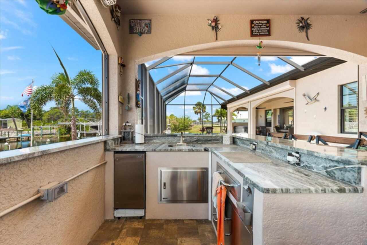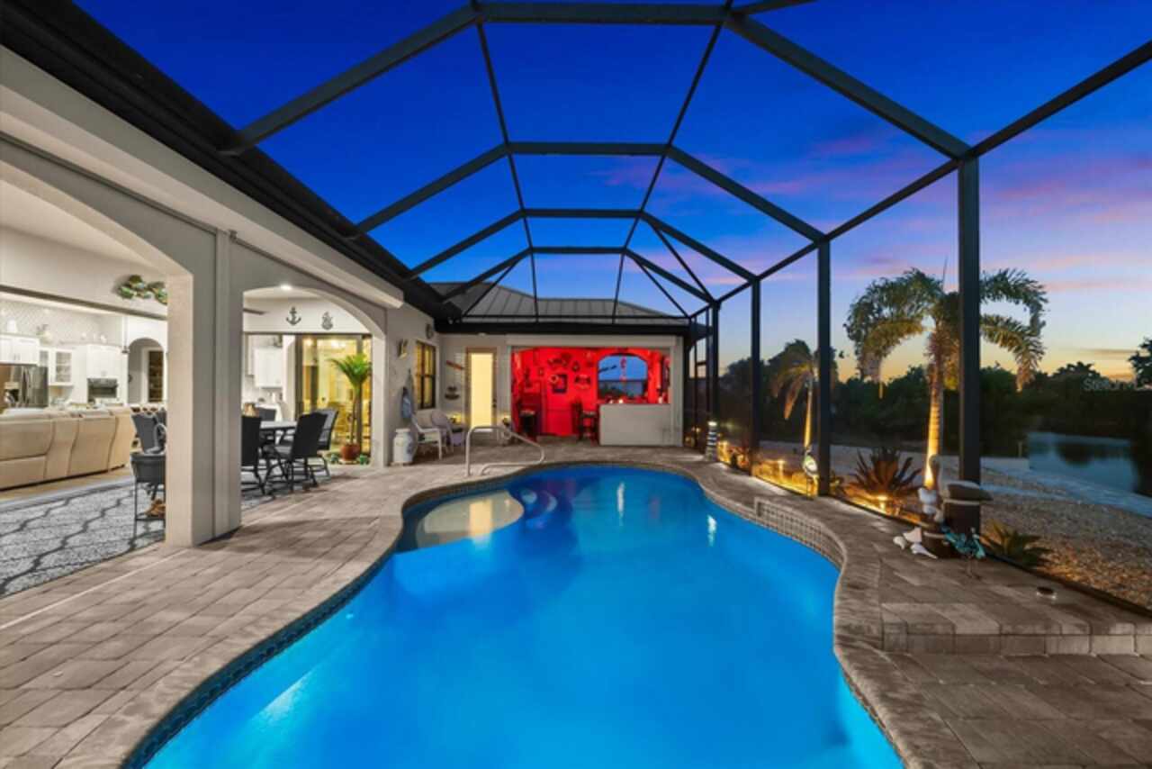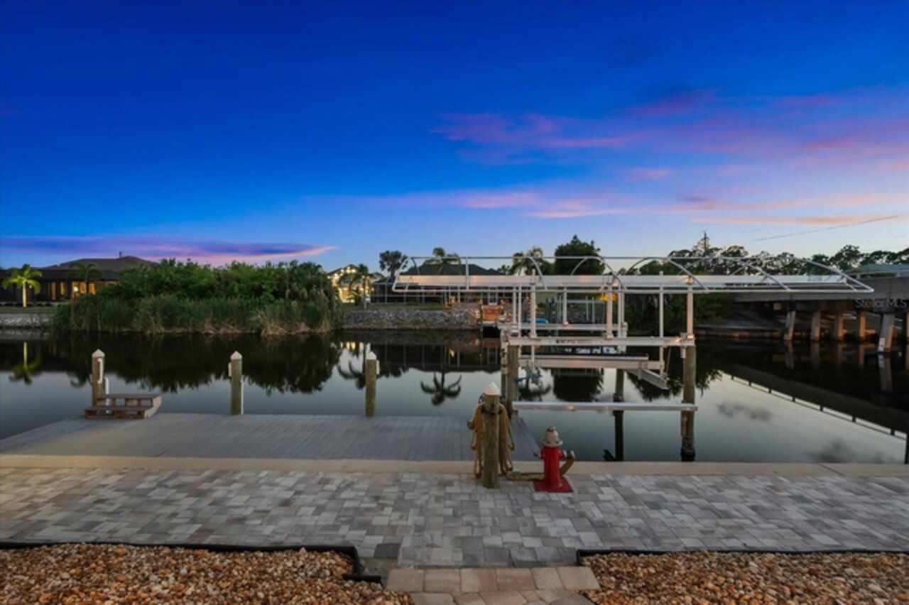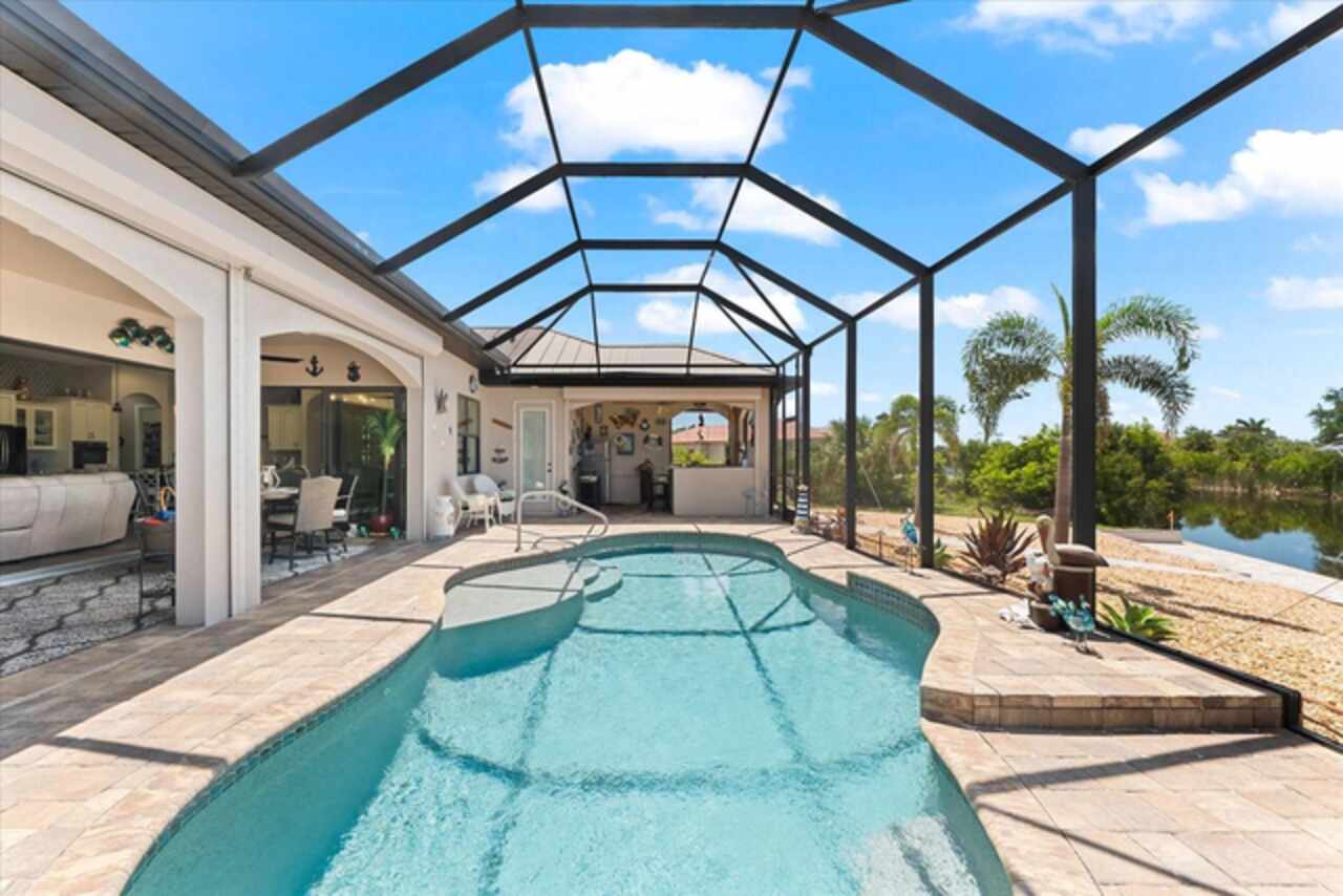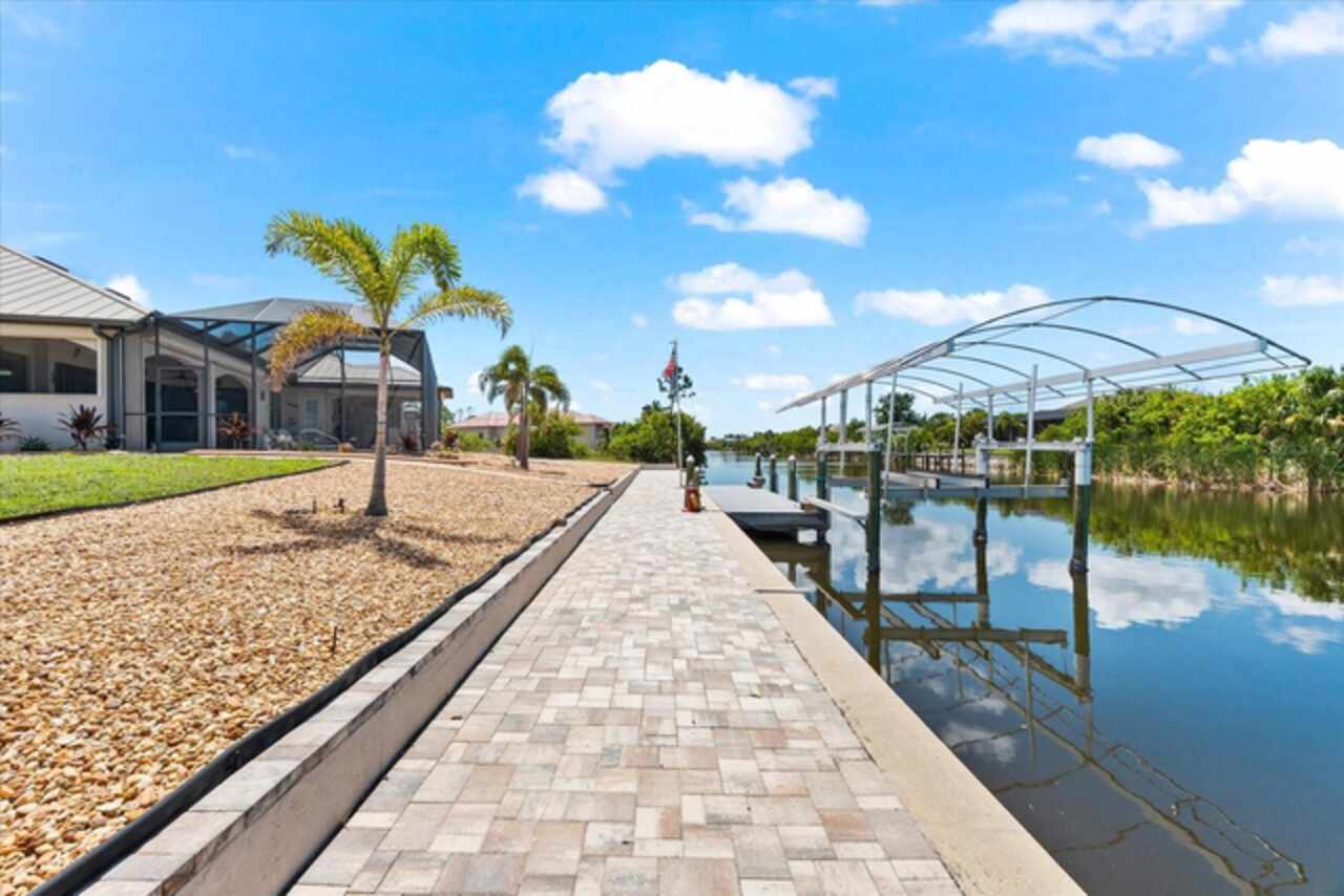 Experience the best of Florida living in this custom-built estate home, featuring 4 bedrooms, 3.5 baths, and a den, beautifully positioned on 1.25 acres along the Zephyr Waterway with 125 feet of sea-walled waterfront and ideal southern exposure. Built in 2018, this 2, 681 sq ft estate offers the perfect blend of luxury, privacy, and easy access to both boating and nearby golf courses in the highly desirable South Gulf Cove community. Enjoy stunning views and vibrant boat traffic from your backyard on one of the area’s most sought-after wide canals. Inside, the home boasts a thoughtfully designed open floor plan with a double tray volume ceiling, gorgeous plank flooring throughout, and expansive 0° sliders that flood the main living areas with natural light, offering seamless indoor-outdoor living. A den with French doors provides an ideal space for a home office or cozy retreat. The heart of the home is the gourmet kitchen, designed to impress with upgraded granite countertops, a dramatic 10-foot island, staggered cabinetry, and decorative backsplash tile that extends to the ceiling. A spacious walk-in pantry and a state-of-the-art 2023 induction stove complete this high-end culinary space, perfect for both everyday living and entertaining. The expansive primary suite serves as a serene retreat, featuring a decorative ceiling, ample space for a seating area, and large windows that allow natural light to fill the room. The spa-like ensuite bath offers a luxurious walk-through shower with dual showerheads, double vanities, and a deep soaking tub—creating the perfect blend of comfort, elegance, and functionality. For added privacy, the guest bedrooms are located on the opposite side of the home, each with convenient access to their own bathrooms, making them ideal for family or visitors. Outdoor living is a true highlight of this property. Relax in the heated pool, surrounded by mature landscaping and protected by roll-down shutters on the lanai. A separate bar area with a refrigerator, sink, and icemaker makes entertaining a breeze. The full irrigation system keeps the expansive yard green year-round. Waterfront amenities include a 10, 000 lb covered boat lift, water and electric at the dock, and a paver pad running the full 125 feet of sea-walled waterfront, providing a clean, polished look and convenient access along the shoreline. Additional upgrades include a new roof (2023), impact windows and doors, Bahama shutters, electric remote-controlled room-darkening shades, and a whole-house generator plug for added peace of mind. The three-car garage boasts a durable epoxy floor, and two outdoor sheds provide convenient extra storage. Don’t miss this rare opportunity—schedule your private showing today!