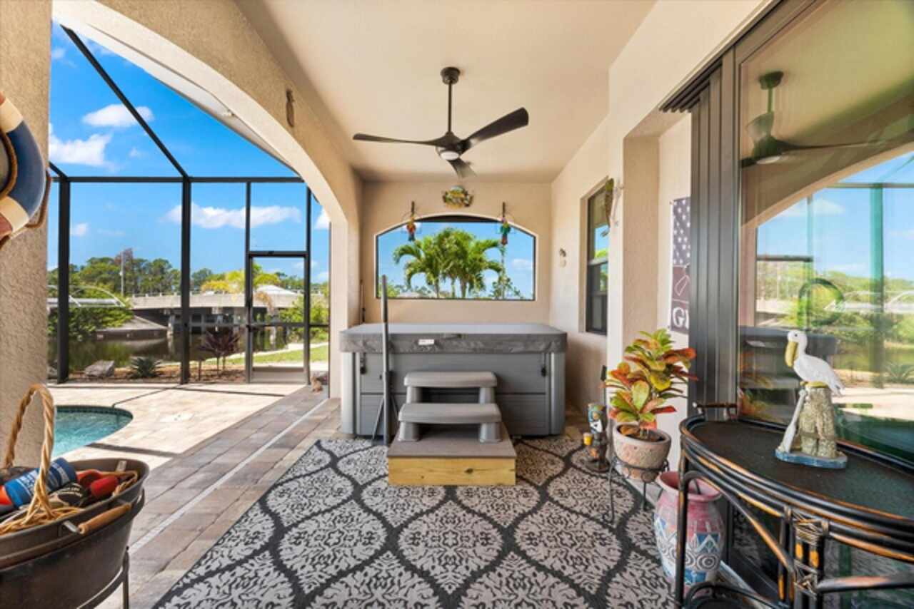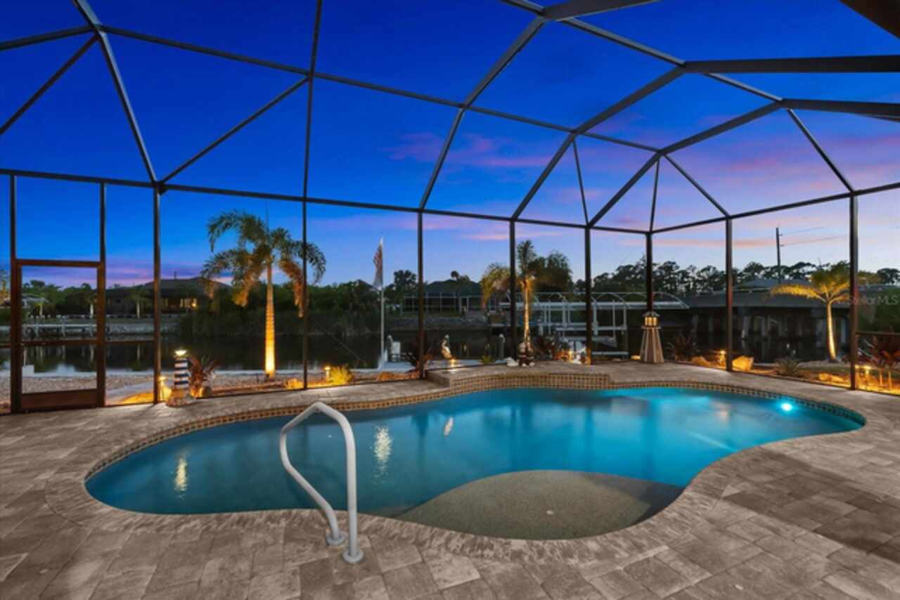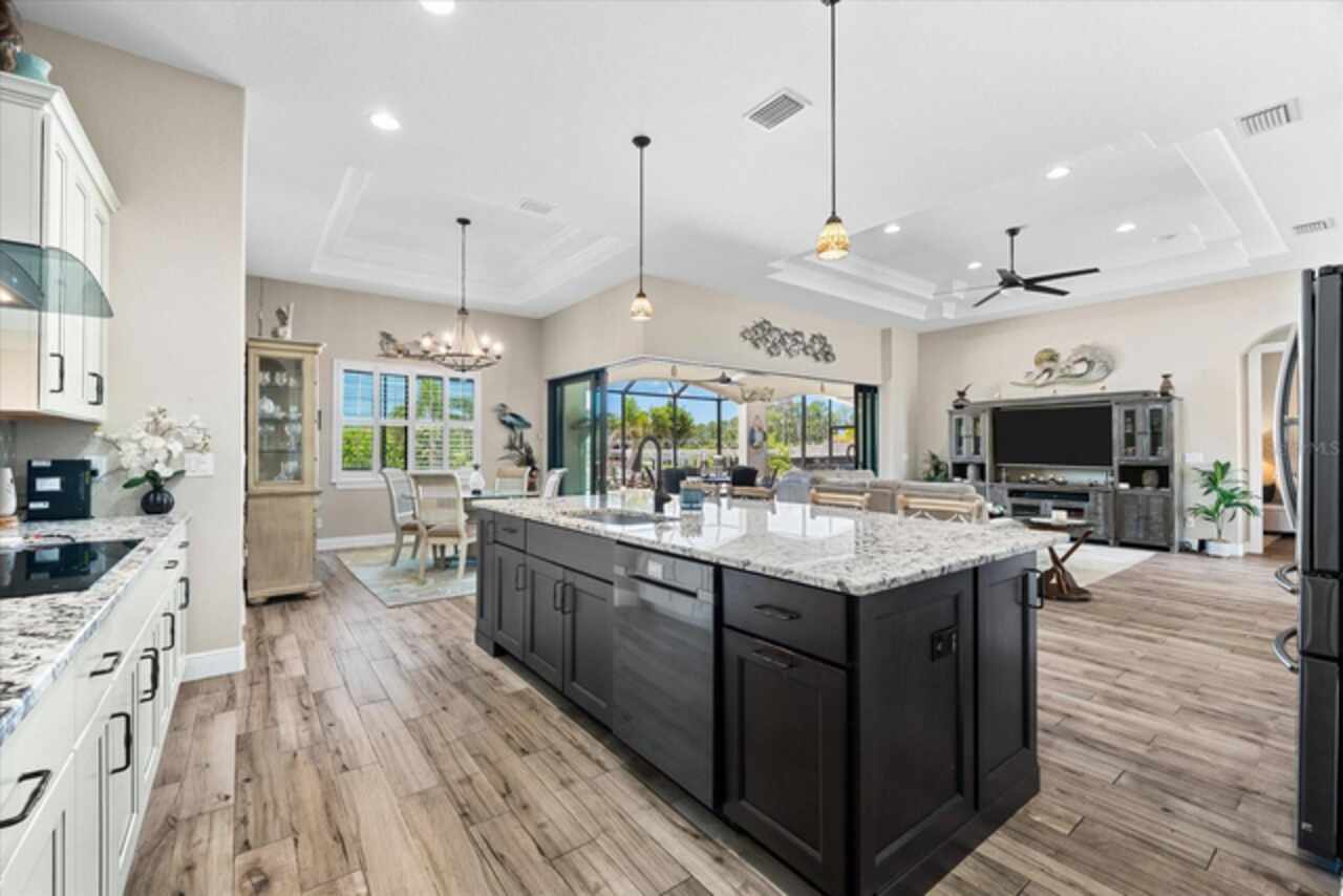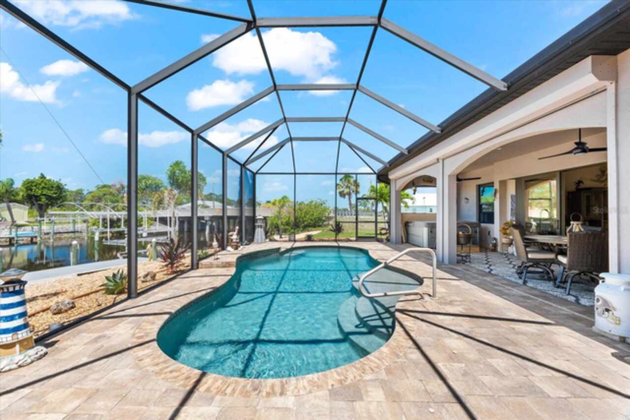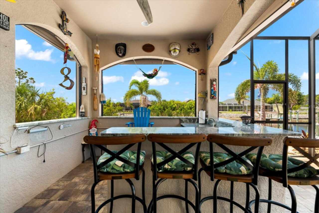 Experience the best of Florida living in this custom-built estate home, featuring 4 bedrooms, 3.5 baths, and a den, beautifully positioned on 1.25 acres along the Zephyr Waterway with 125 feet of sea-walled waterfront and ideal southern exposure. Built in 2018, this 2, 681 sq ft estate offers the perfect blend of luxury, privacy, and easy access to both boating and nearby golf courses in the highly desirable South Gulf Cove community. Enjoy stunning views and vibrant boat traffic from your backyard on one of the area’s most sought-after wide canals. Inside, the home boasts a thoughtfully designed open floor plan with a double tray volume ceiling, gorgeous plank flooring throughout, and expansive 0° sliders that flood the main living areas with natural light, offering seamless indoor-outdoor living. A den with French doors provides an ideal space for a home office or cozy retreat. The heart of the home is the gourmet kitchen, designed to impress with upgraded granite countertops, a dramatic 10-foot island, staggered cabinetry, and decorative backsplash tile that extends to the ceiling. A spacious walk-in pantry and a state-of-the-art 2023 induction stove complete this high-end culinary space, perfect for both everyday living and entertaining. The expansive primary suite serves as a serene retreat, featuring a decorative ceiling, ample space for a seating area, and large windows that allow natural light to fill the room. The spa-like ensuite bath offers a luxurious walk-through shower with dual showerheads, double vanities, and a deep soaking tub—creating the perfect blend of comfort, elegance, and functionality. For added privacy, the guest bedrooms are located on the opposite side of the home, each with convenient access to their own bathrooms, making them ideal for family or visitors. Outdoor living is a true highlight of this property. Relax in the heated pool, surrounded by mature landscaping and protected by roll-down shutters on the lanai. A separate bar area with a refrigerator, sink, and icemaker makes entertaining a breeze. The full irrigation system keeps the expansive yard green year-round. Waterfront amenities include a 10, 000 lb covered boat lift, water and electric at the dock, and a paver pad running the full 125 feet of sea-walled waterfront, providing a clean, polished look and convenient access along the shoreline. Additional upgrades include a new roof (2023), impact windows and doors, Bahama shutters, electric remote-controlled room-darkening shades, and a whole-house generator plug for added peace of mind. The three-car garage boasts a durable epoxy floor, and two outdoor sheds provide convenient extra storage. Don’t miss this rare opportunity—schedule your private showing today!
