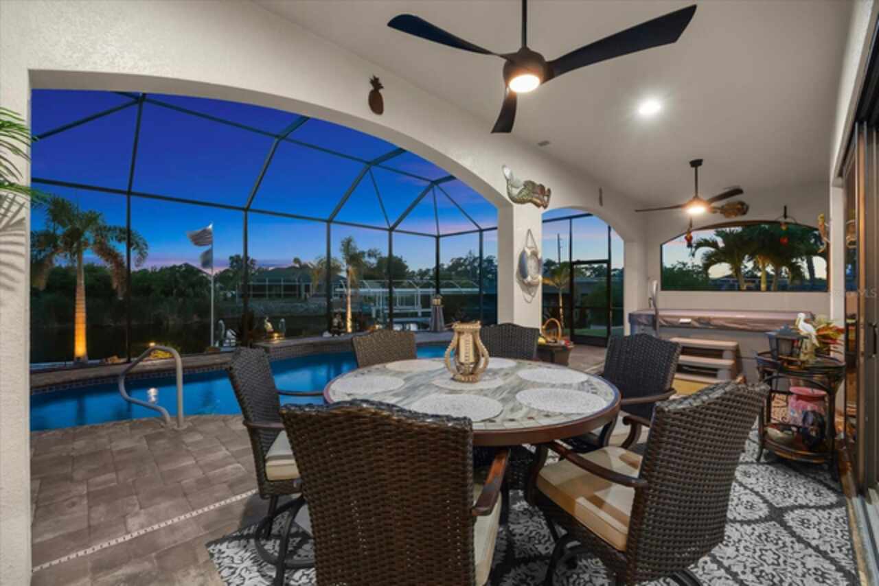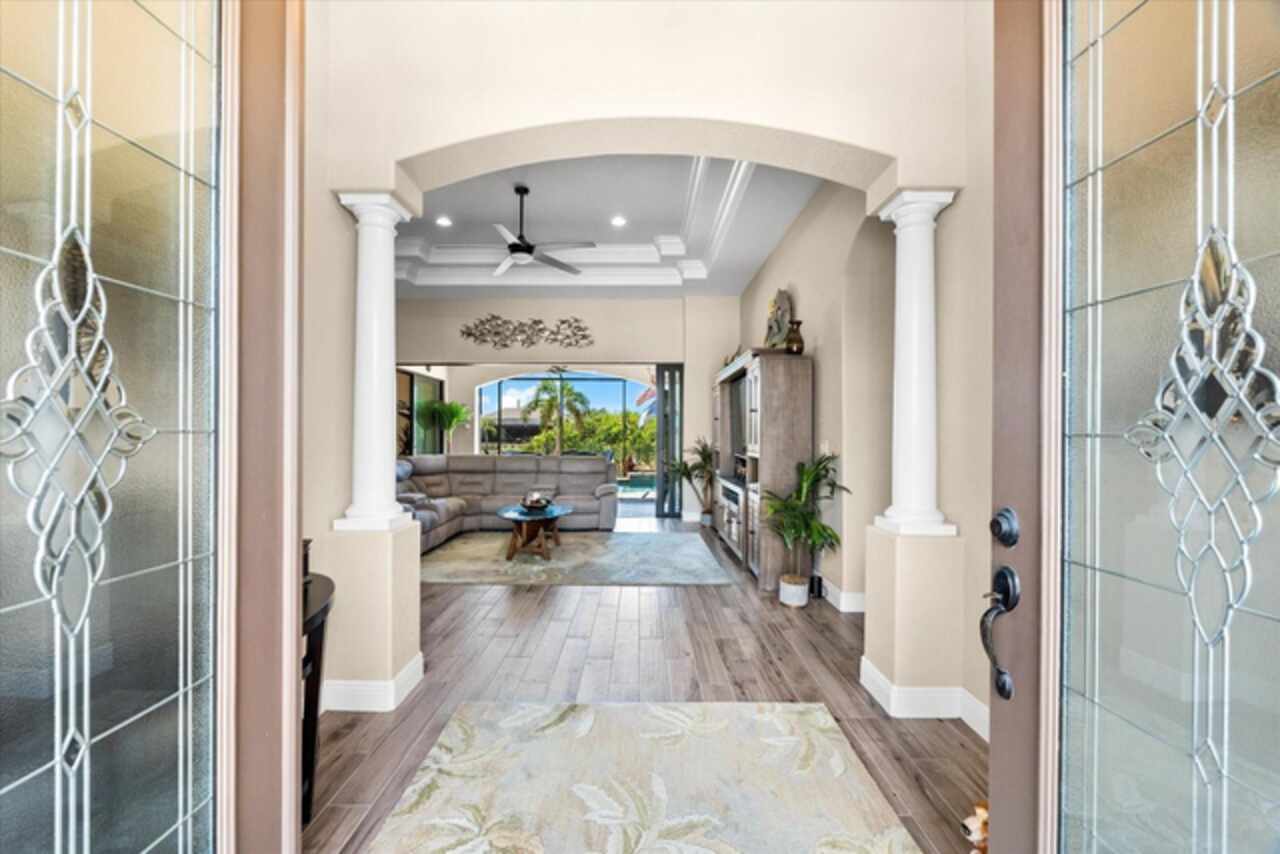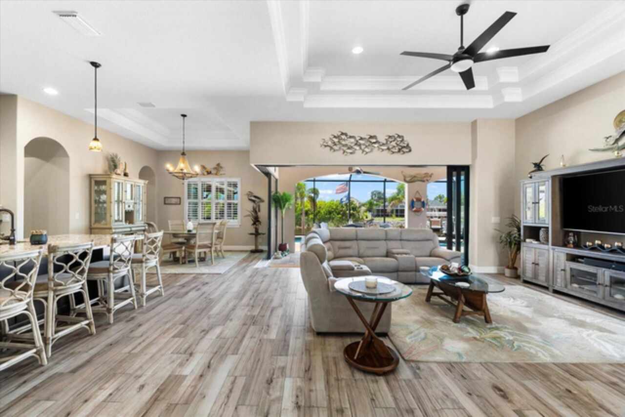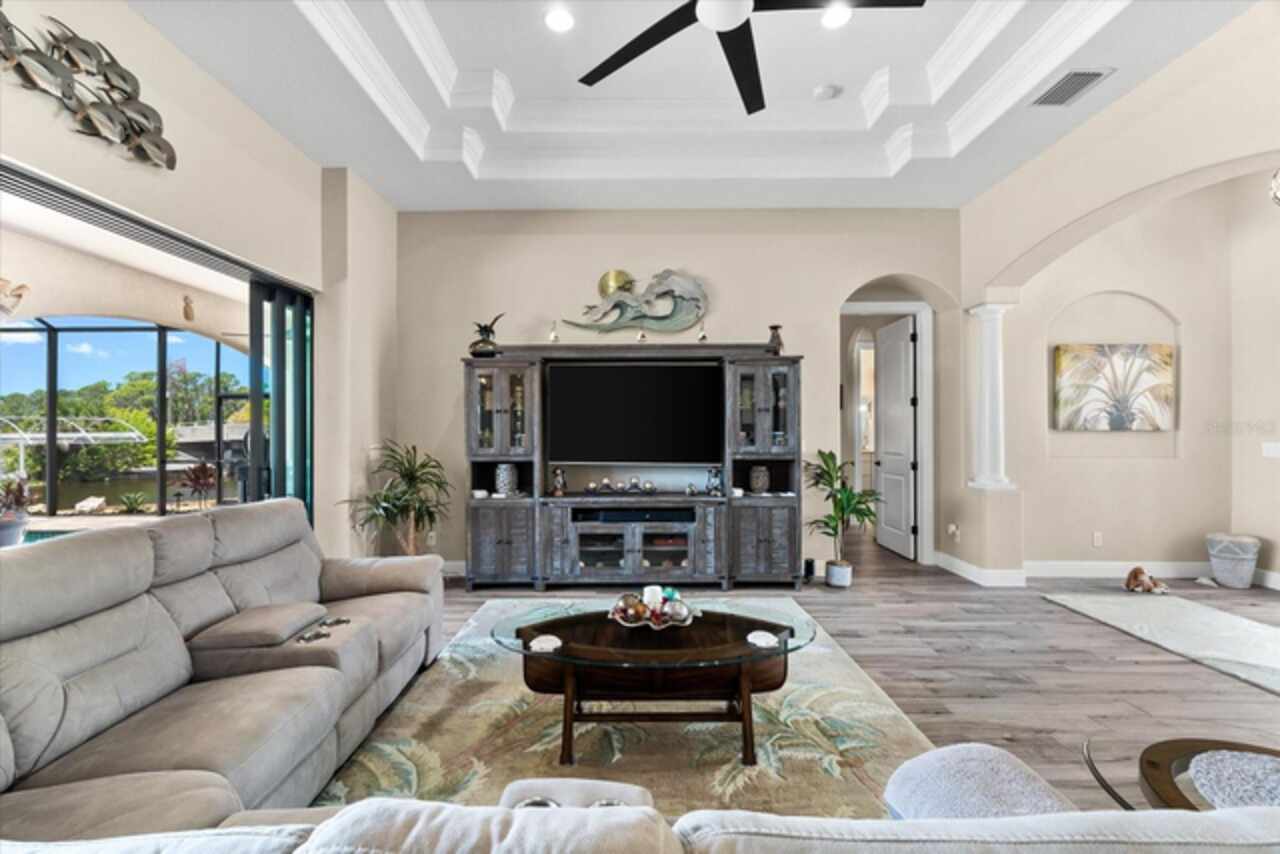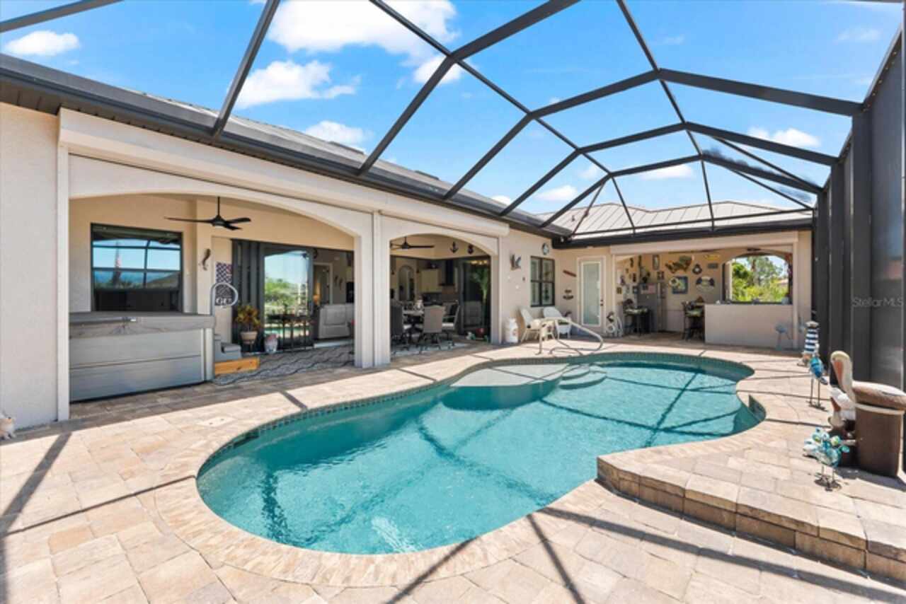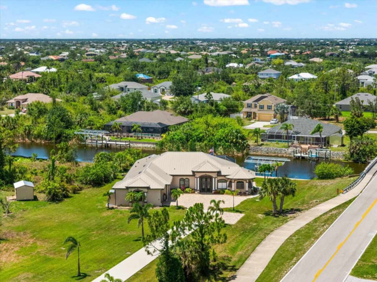 Experience the best of Florida living in this custom-built estate home, featuring 4 bedrooms, 3.5 baths, and a den, beautifully positioned on 1.25 acres along the Zephyr Waterway with 125 feet of sea-walled waterfront and ideal southern exposure. Built in 2018, this 2, 681 sq ft estate offers the perfect blend of luxury, privacy, and easy access to both boating and nearby golf courses in the highly desirable South Gulf Cove community. Enjoy stunning views and vibrant boat traffic from your backyard on one of the area’s most sought-after wide canals. Inside, the home boasts a thoughtfully designed open floor plan with a double tray volume ceiling, gorgeous plank flooring throughout, and expansive 0° sliders that flood the main living areas with natural light, offering seamless indoor-outdoor living. A den with French doors provides an ideal space for a home office or cozy retreat. The heart of the home is the gourmet kitchen, designed to impress with upgraded granite countertops, a dramatic 10-foot island, staggered cabinetry, and decorative backsplash tile that extends to the ceiling. A spacious walk-in pantry and a state-of-the-art 2023 induction stove complete this high-end culinary space, perfect for both everyday living and entertaining. The expansive primary suite serves as a serene retreat, featuring a decorative ceiling, ample space for a seating area, and large windows that allow natural light to fill the room. The spa-like ensuite bath offers a luxurious walk-through shower with dual showerheads, double vanities, and a deep soaking tub—creating the perfect blend of comfort, elegance, and functionality. For added privacy, the guest bedrooms are located on the opposite side of the home, each with convenient access to their own bathrooms, making them ideal for family or visitors. Outdoor living is a true highlight of this property. Relax in the heated pool, surrounded by mature landscaping and protected by roll-down shutters on the lanai. A separate bar area with a refrigerator, sink, and icemaker makes entertaining a breeze. The full irrigation system keeps the expansive yard green year-round. Waterfront amenities include a 10, 000 lb covered boat lift, water and electric at the dock, and a paver pad running the full 125 feet of sea-walled waterfront, providing a clean, polished look and convenient access along the shoreline. Additional upgrades include a new roof (2023), impact windows and doors, Bahama shutters, electric remote-controlled room-darkening shades, and a whole-house generator plug for added peace of mind. The three-car garage boasts a durable epoxy floor, and two outdoor sheds provide convenient extra storage. Don’t miss this rare opportunity—schedule your private showing today!
