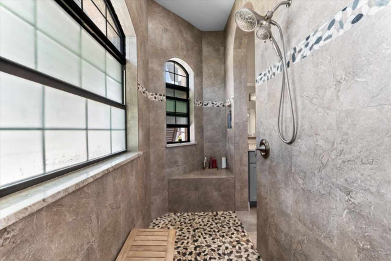 Ceiling Fans(s), Eat-in Kitchen, High Ceilings, Kitchen/Family Room Combo, Living Room/Dining Room Combo, Open Floorplan, Primary Bedroom Main Floor, Solid Surface Counters, Split Bedroom, Stone Counters, Thermostat, Tray Ceiling(s), Walk-In Closet(s), Window Treatments