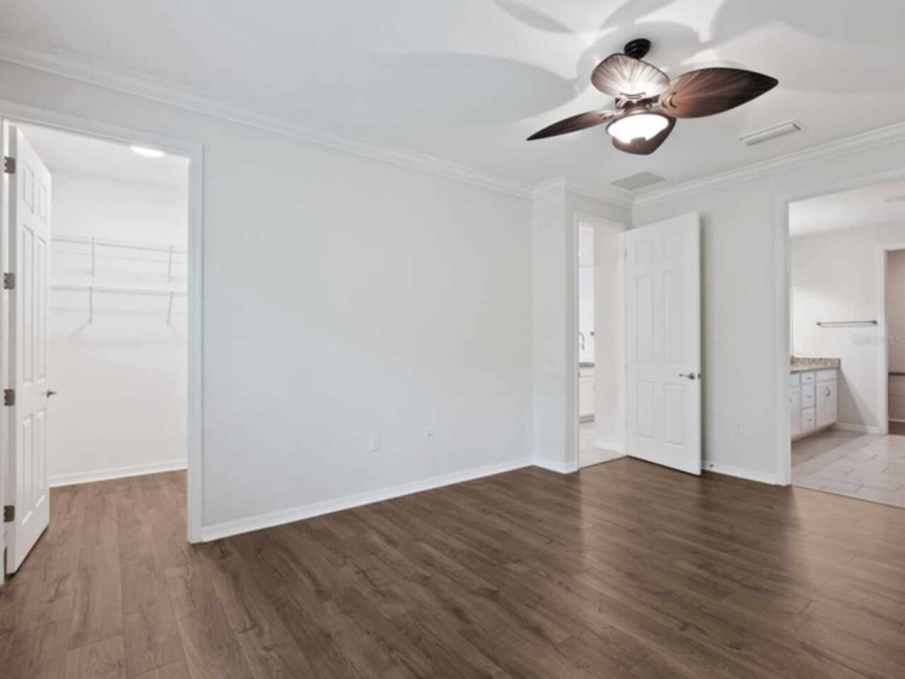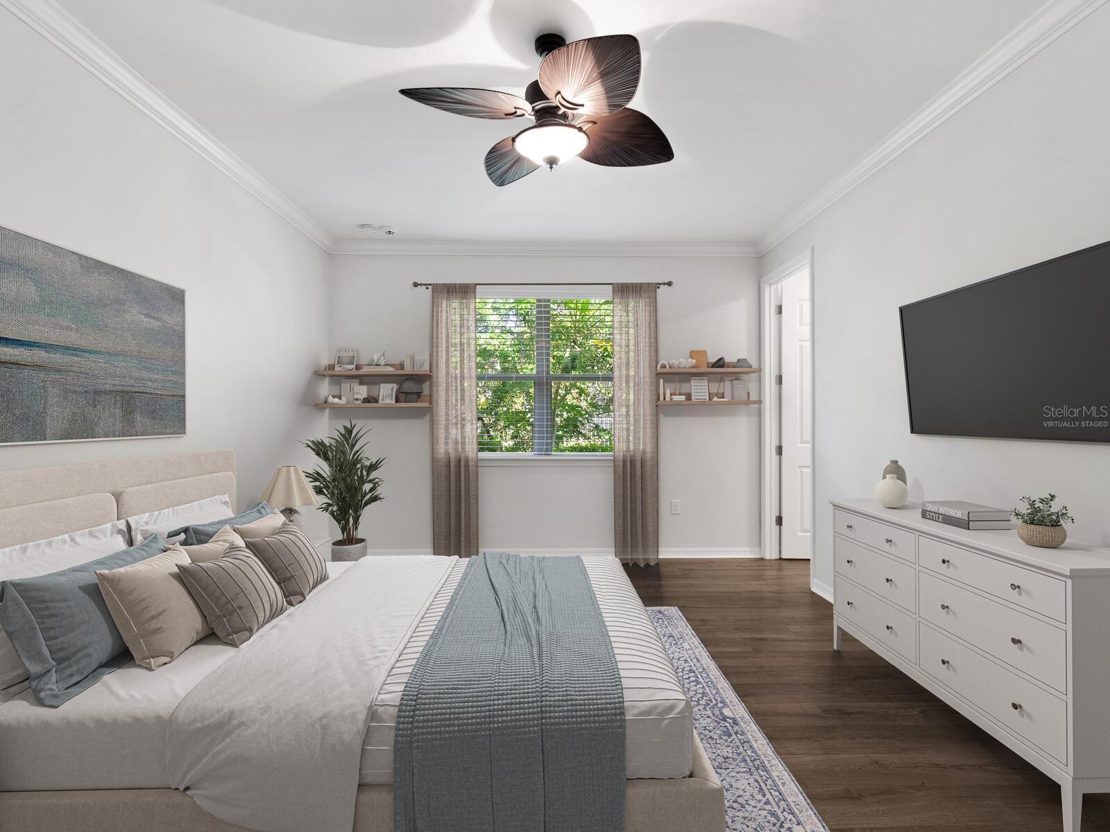 Ceiling Fans(s), Crown Molding, Living Room/Dining Room Combo, Open Floorplan, Primary Bedroom Main Floor, Solid Surface Counters, Split Bedroom, Stone Counters, Thermostat, Walk-In Closet(s), Window Treatments